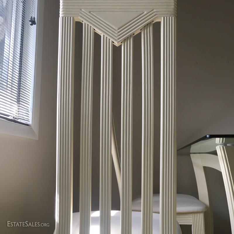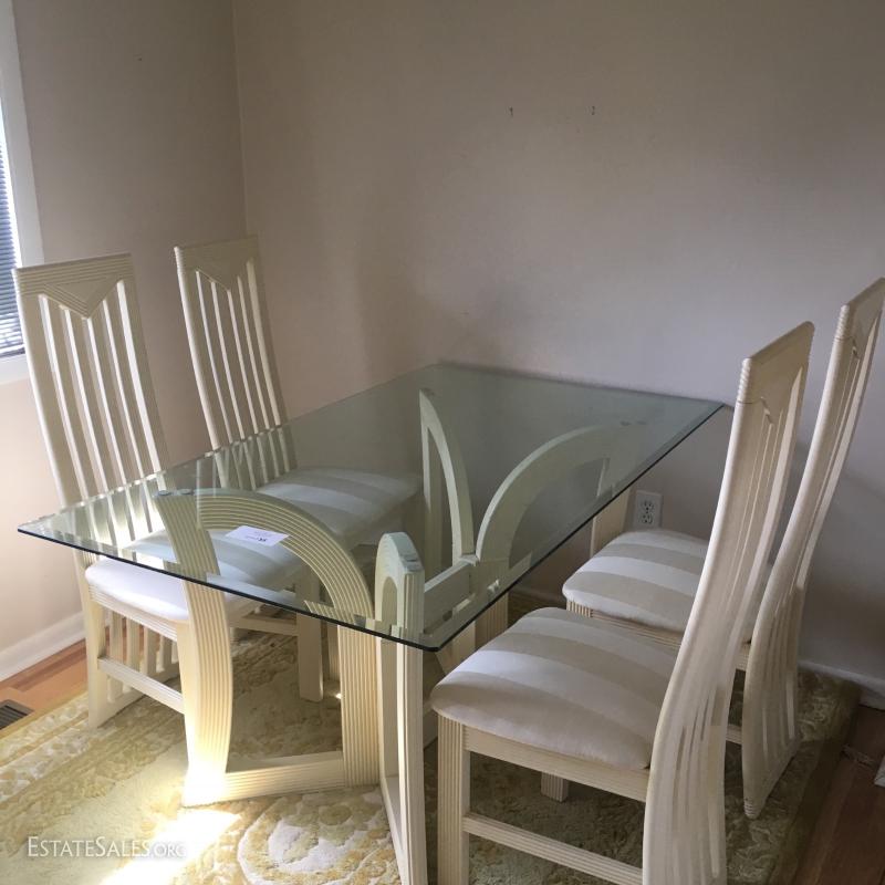 Modern, glass top table & 4 high/straight back chairs.