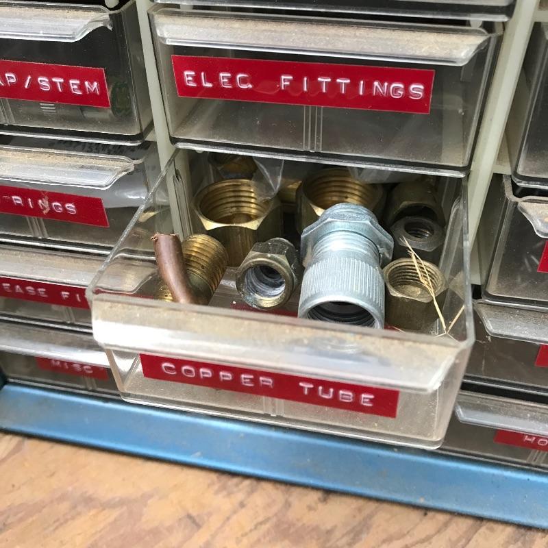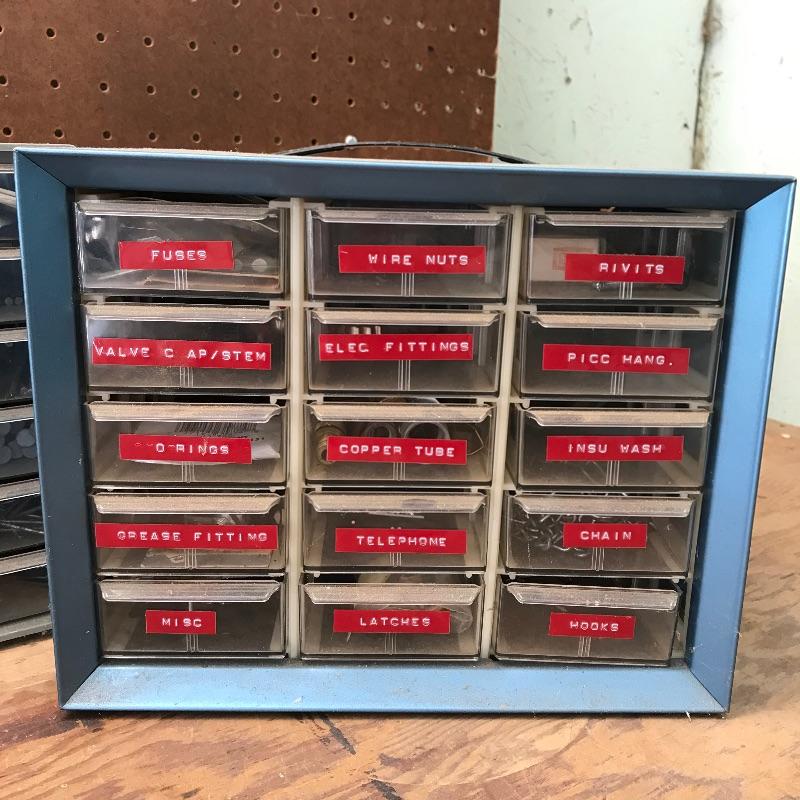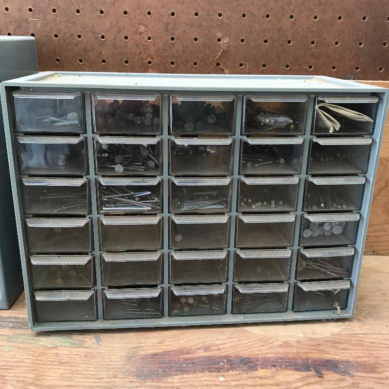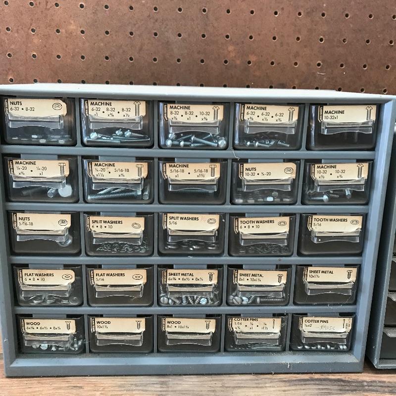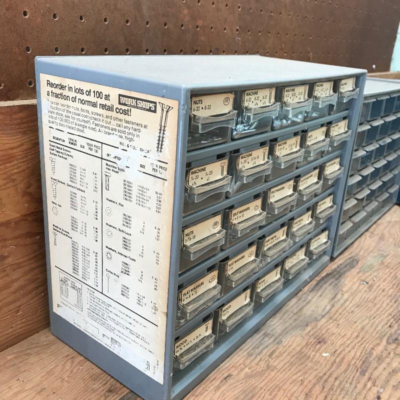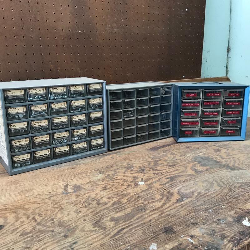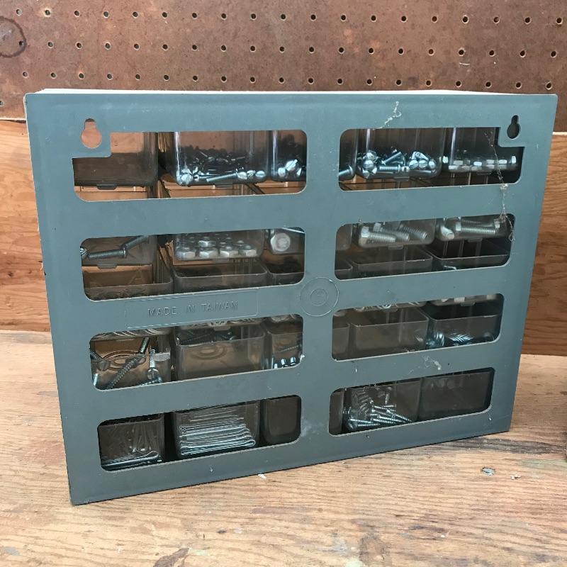 One metal and two heavyweight plastic small part organizer bins with hardware and more included. All three can be wall mounted and have contents, but Sterling Transitions cannot verify if labels match contents. The largest Workshops organizer 12” x 5.5” x 9.25”. See photos. No shipping.