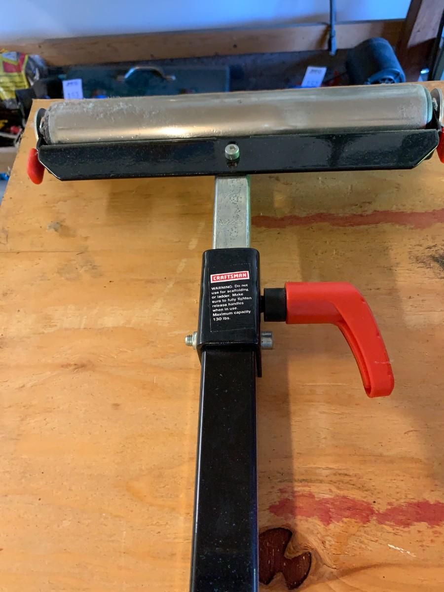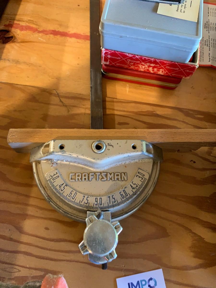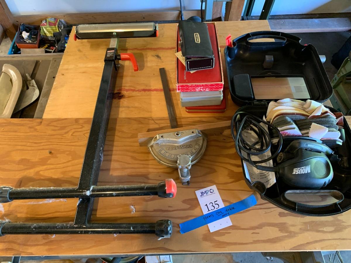 Stand with rolling bar - saw accessory. Craftsman miter angle. Craftsman "mouse" sander/polisher with case and pads. Micrometer depth gauge.