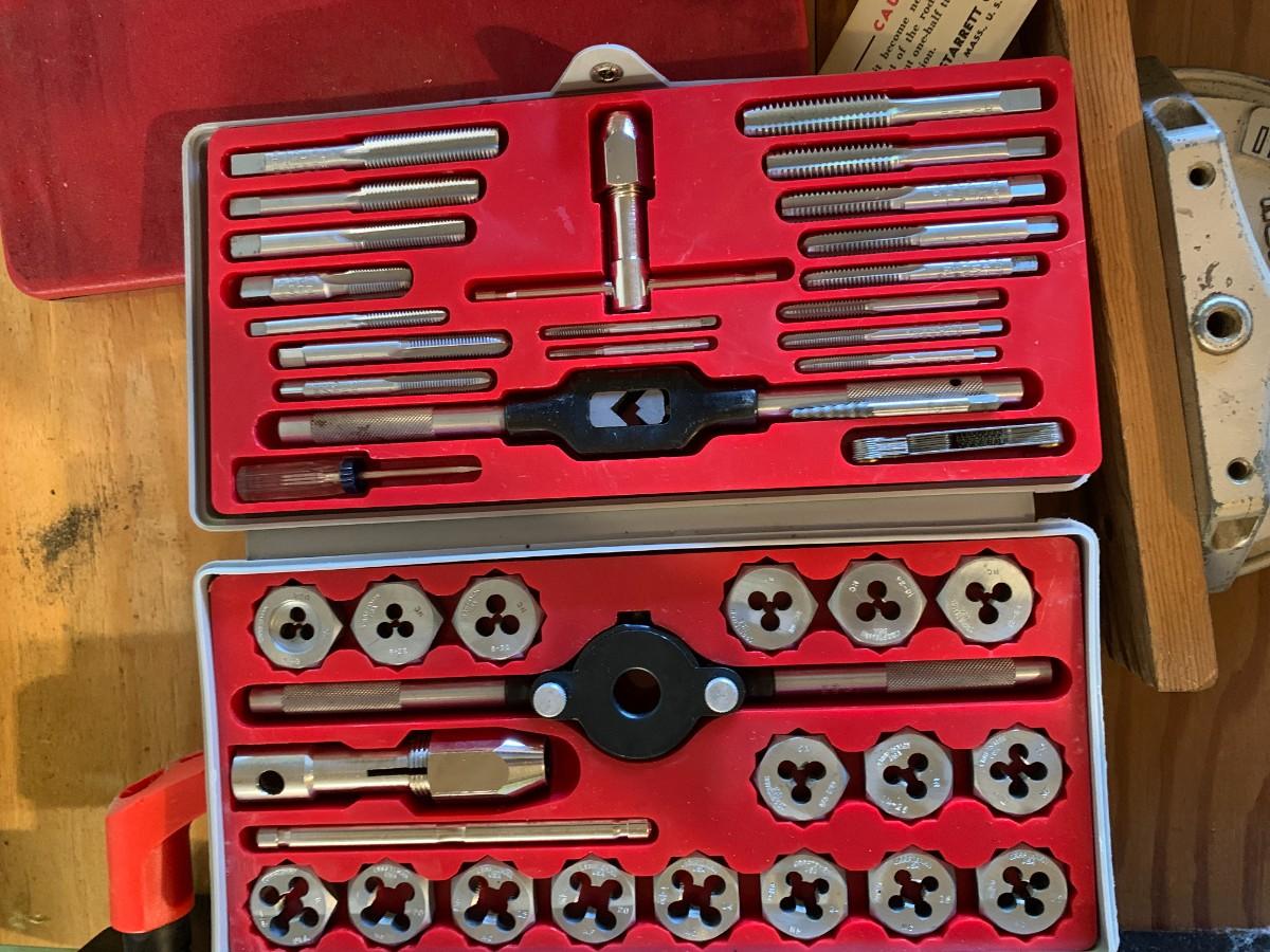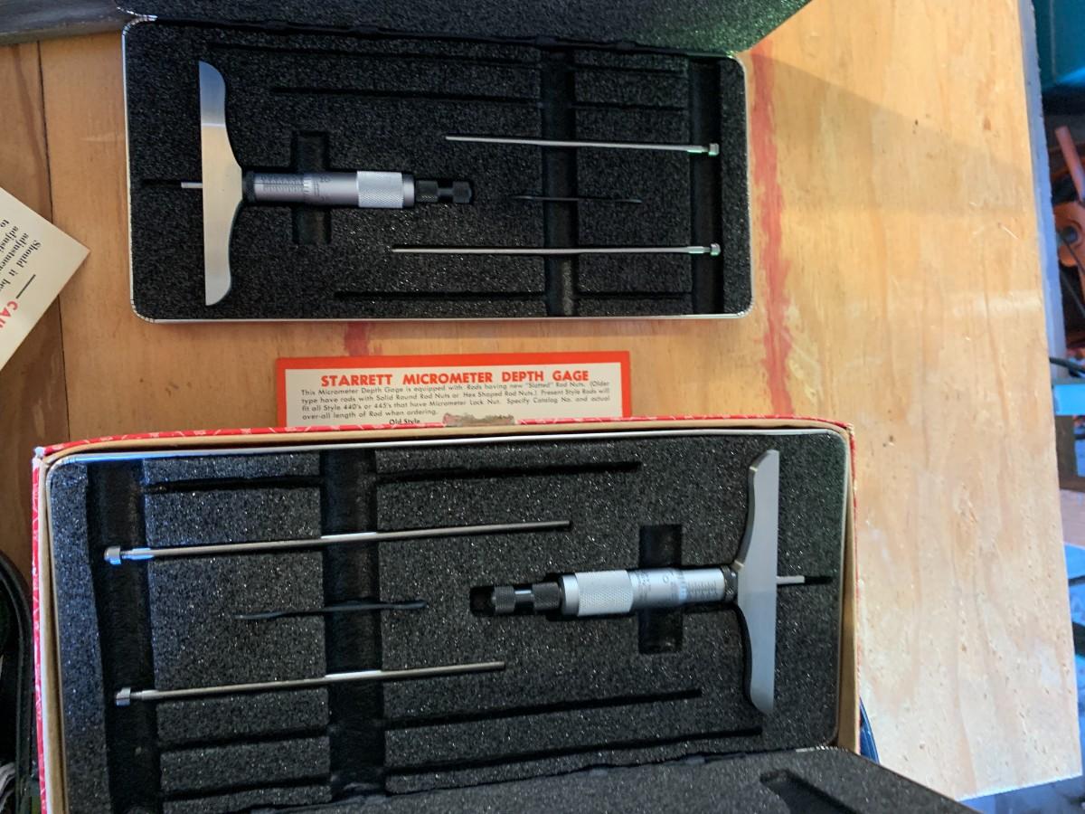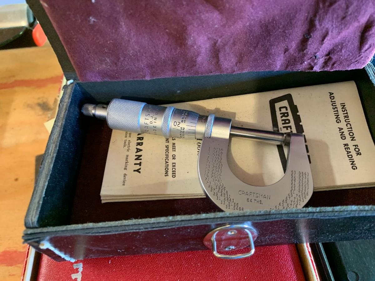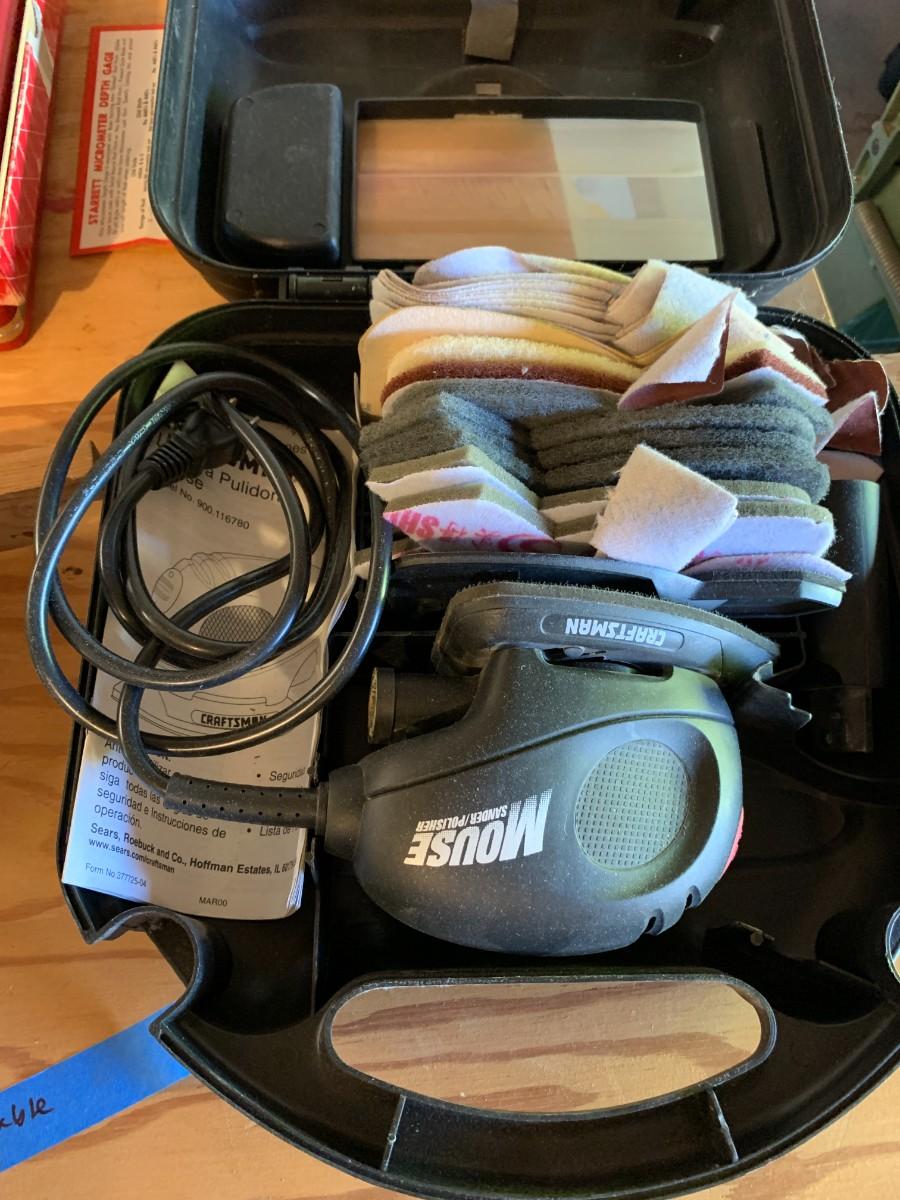 Stand with rolling bar - saw accessory. Craftsman miter angle. Craftsman "mouse" sander/polisher with case and pads. Micrometer depth gauge.