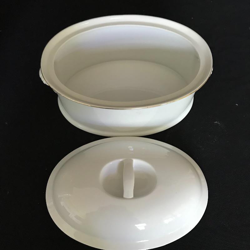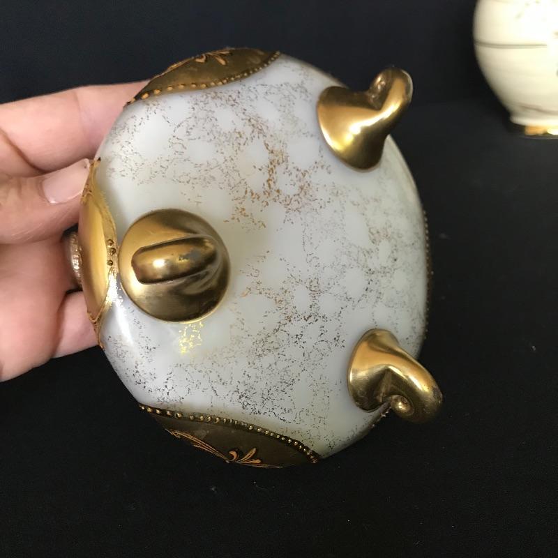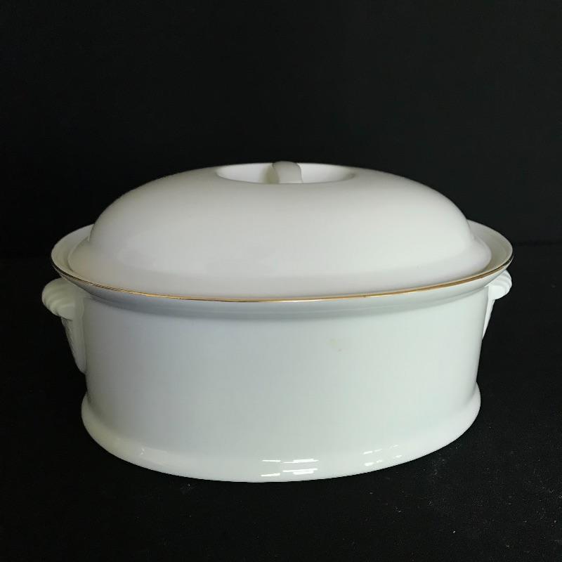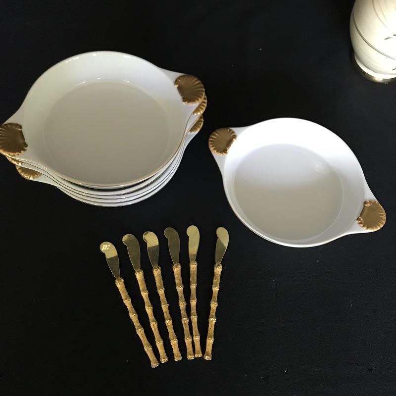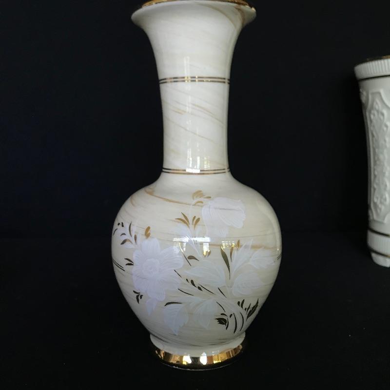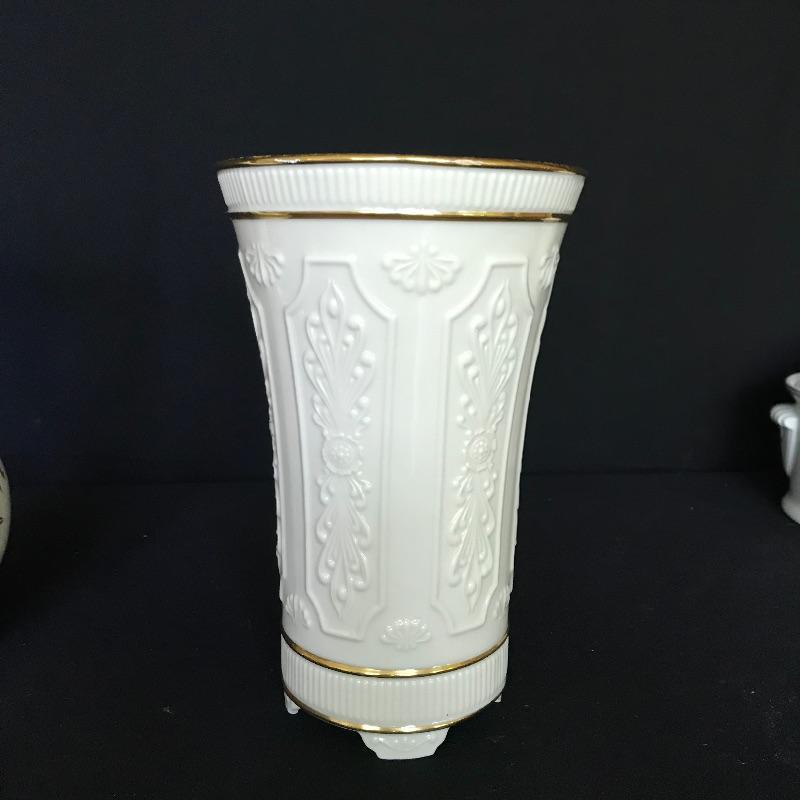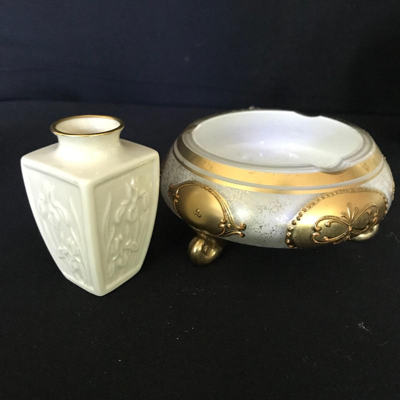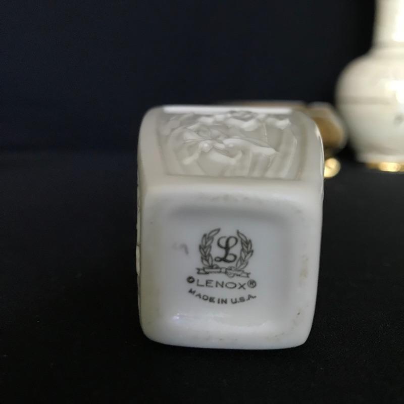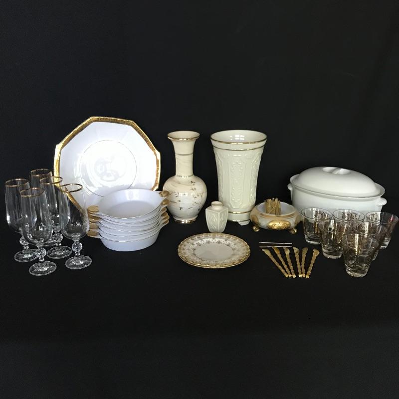 Lovely ivory and white dishes with gold accents. A few dishes are marked gold, see photos. Perfect arrow picks, a six piece custard dish set and more! See photos for entire lot inventory. The tall Lenox vase measures approximately 5.5” x 9”. Shipping available.