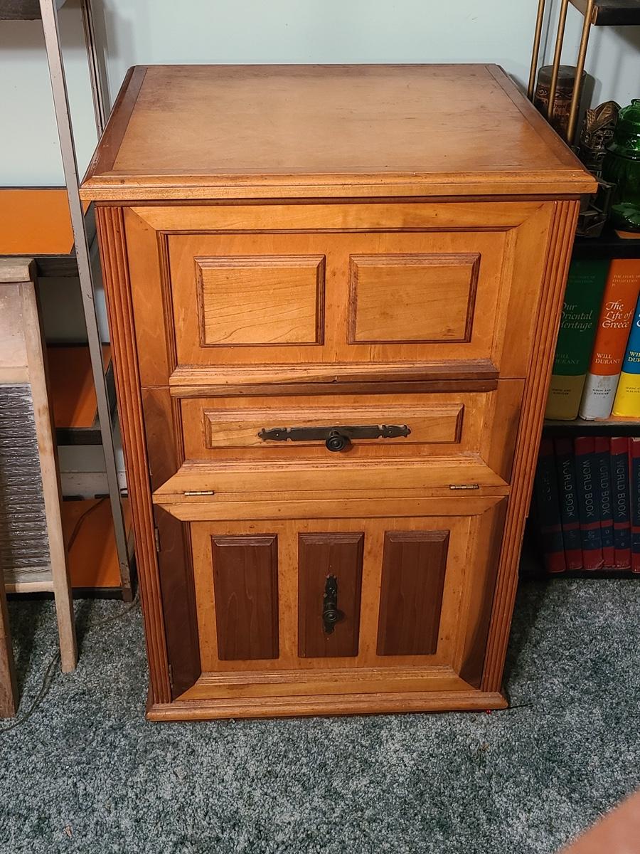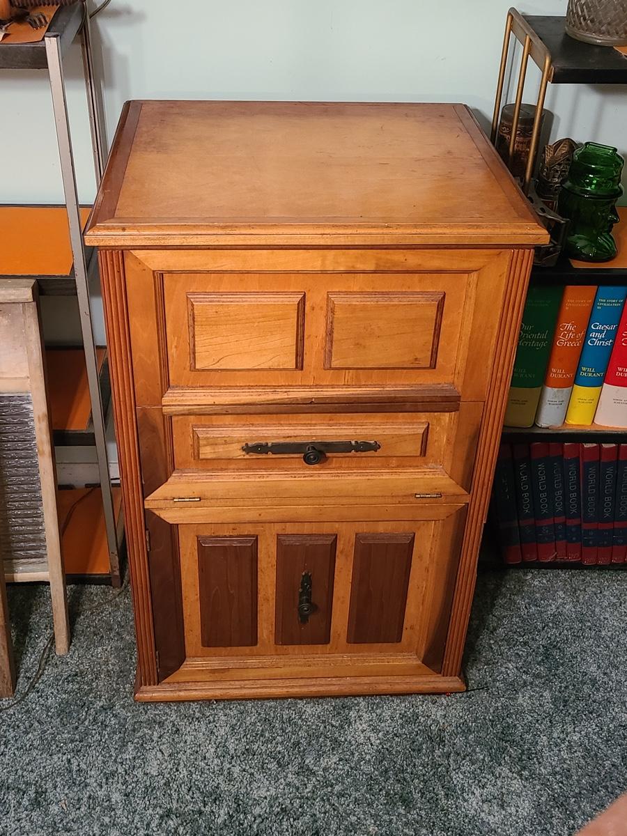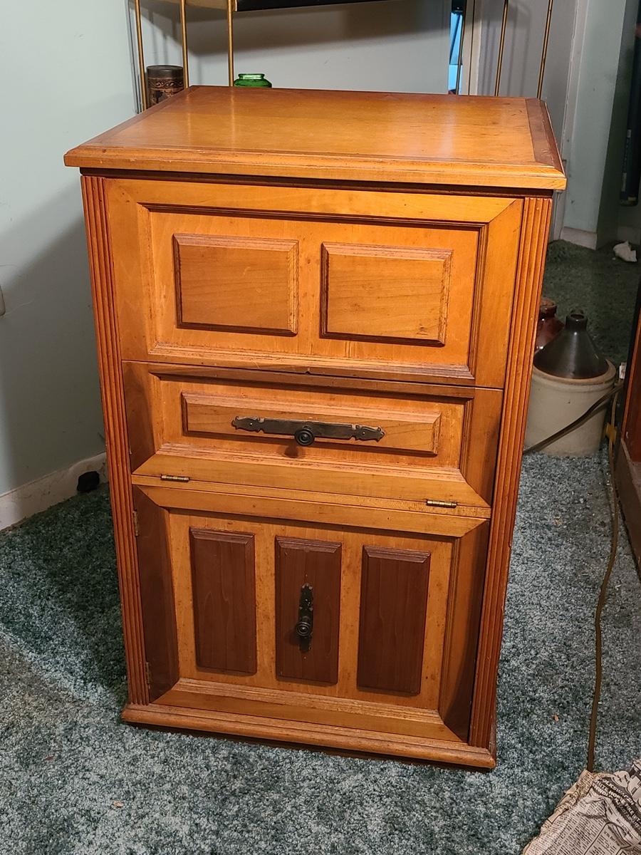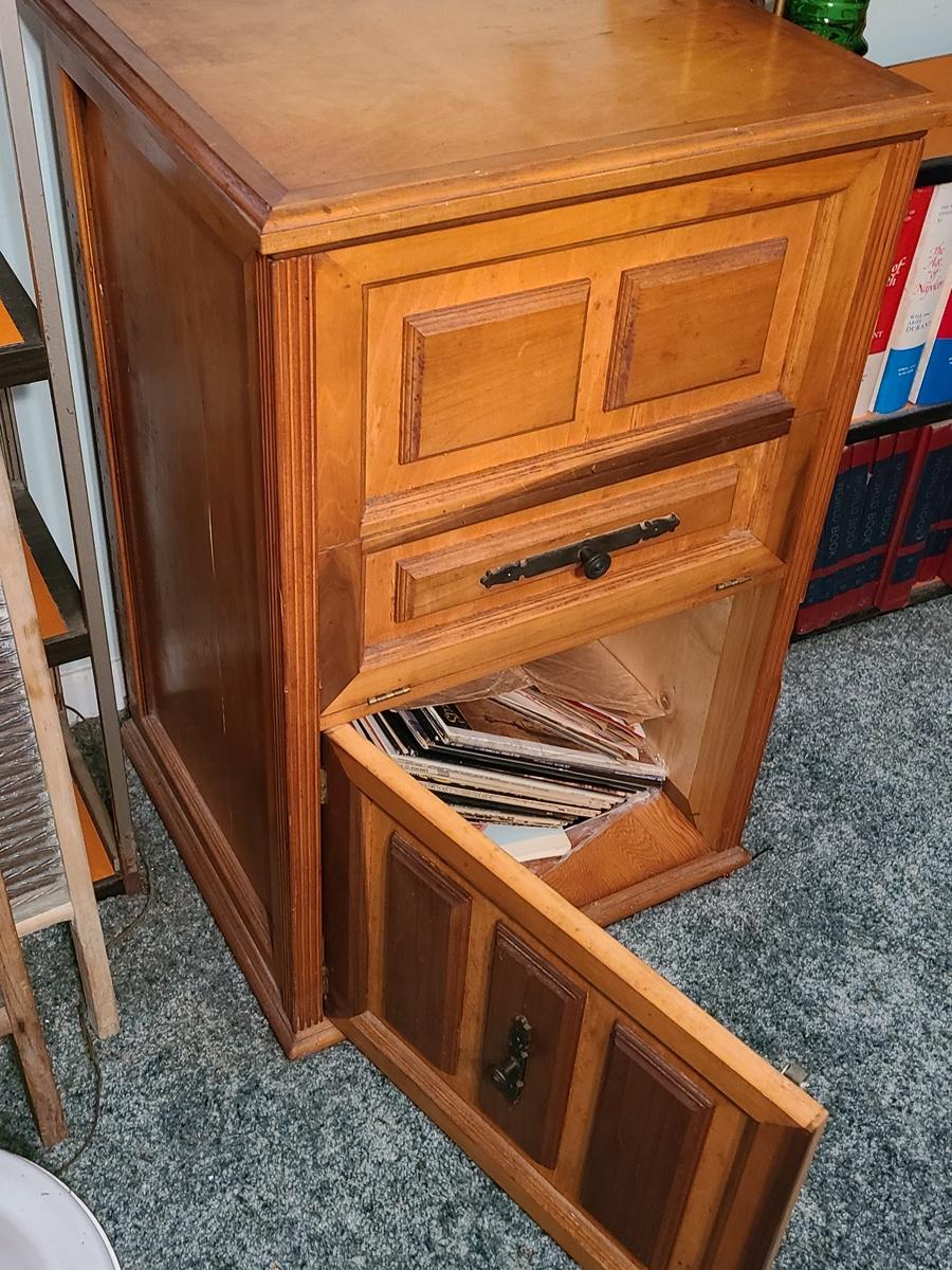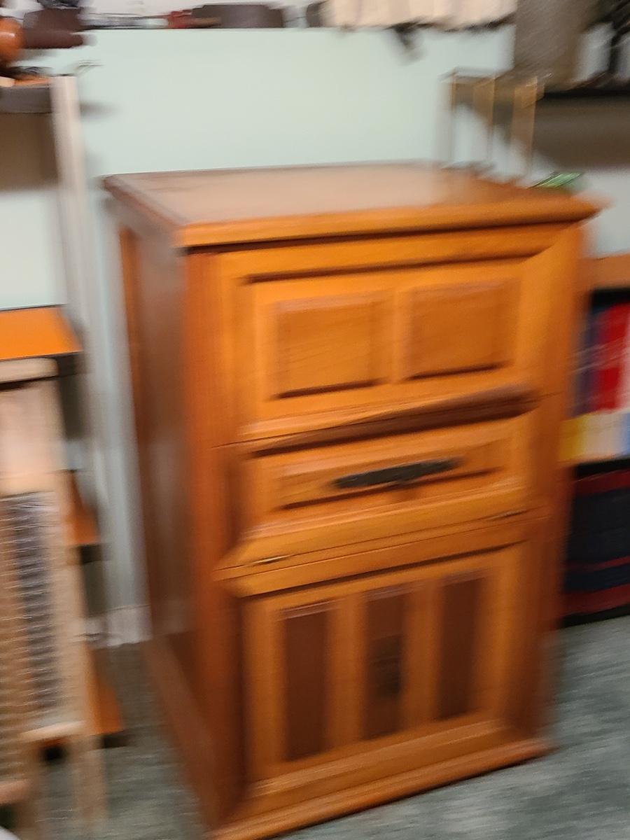This neat little piece is the perfect size for any house and would look great for record player, as it fits records in the bottom, or could be up-cycled into bar. The bottle is not included. The sides do show some wear as there is a split in the wood that would need to be glued. The pictures show condition, measurements if taken, and what is included in the lot. Due to the large amount that we photograph and the time frame, we are not always able to take measurements. All items unless noted, are pre-owned and have been used. If you purchased furniture, you must bring help. We do not allow one person to carry large furniture out on their own. Bring help, tools and a truck for the safety of our client’s homes, and your personal safety. Company policy. Thank you.