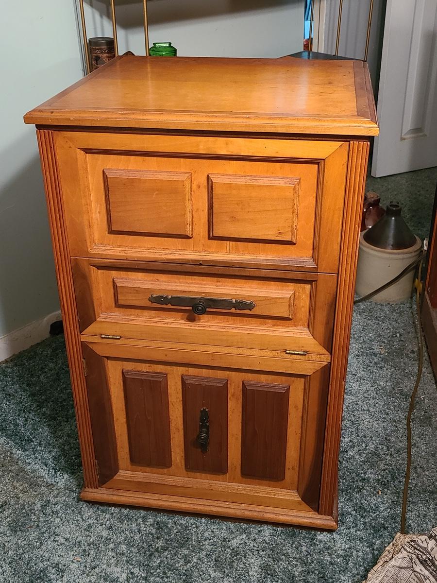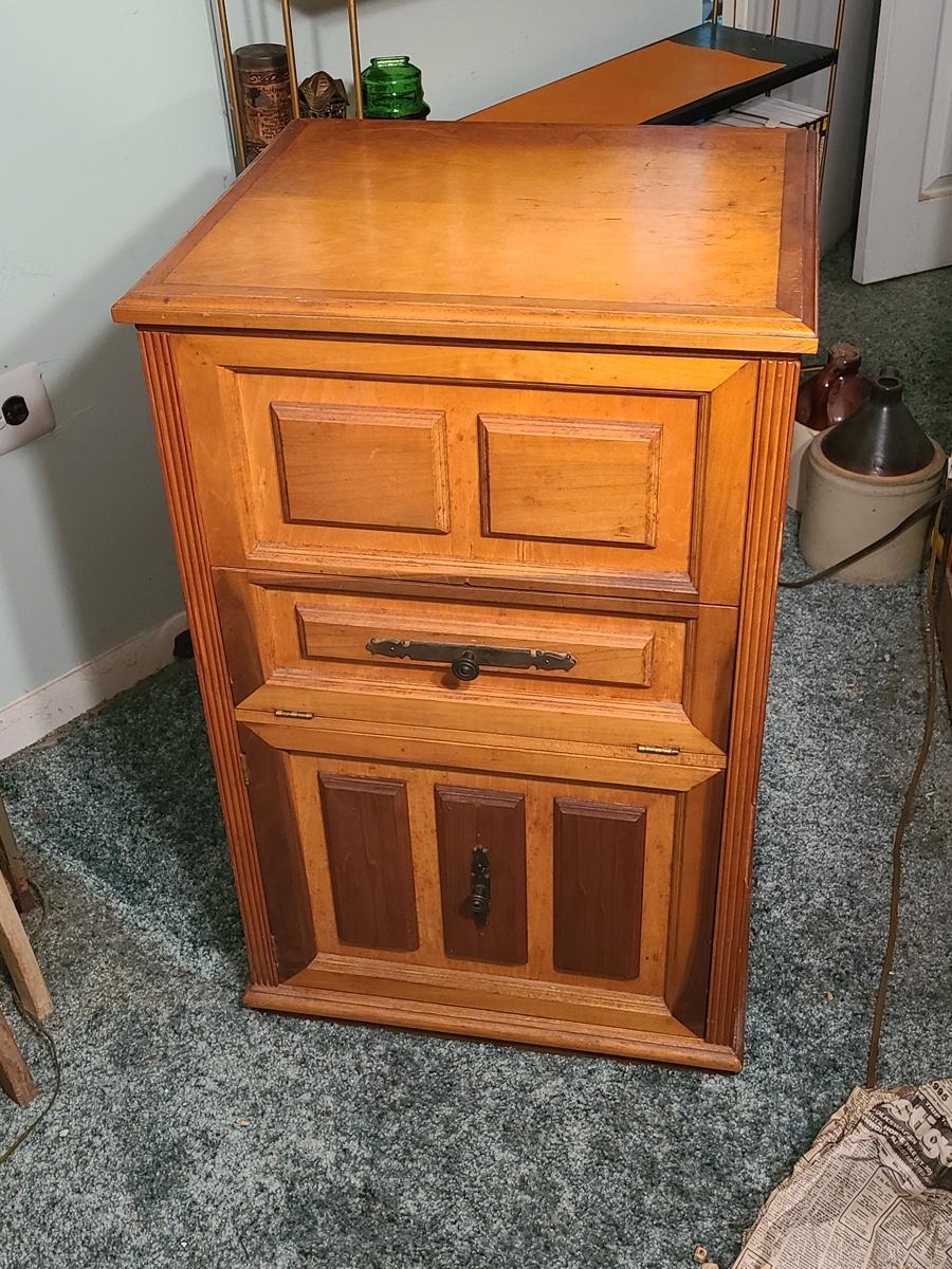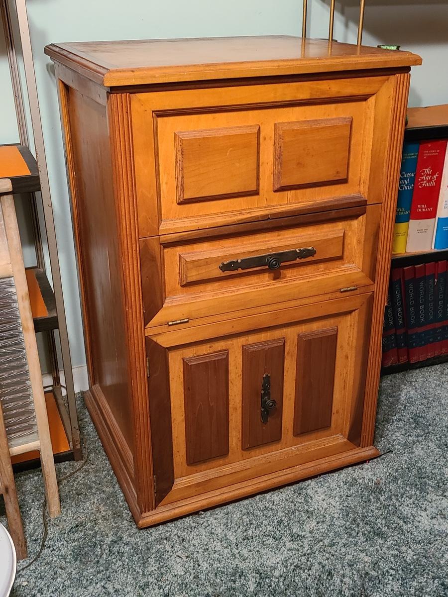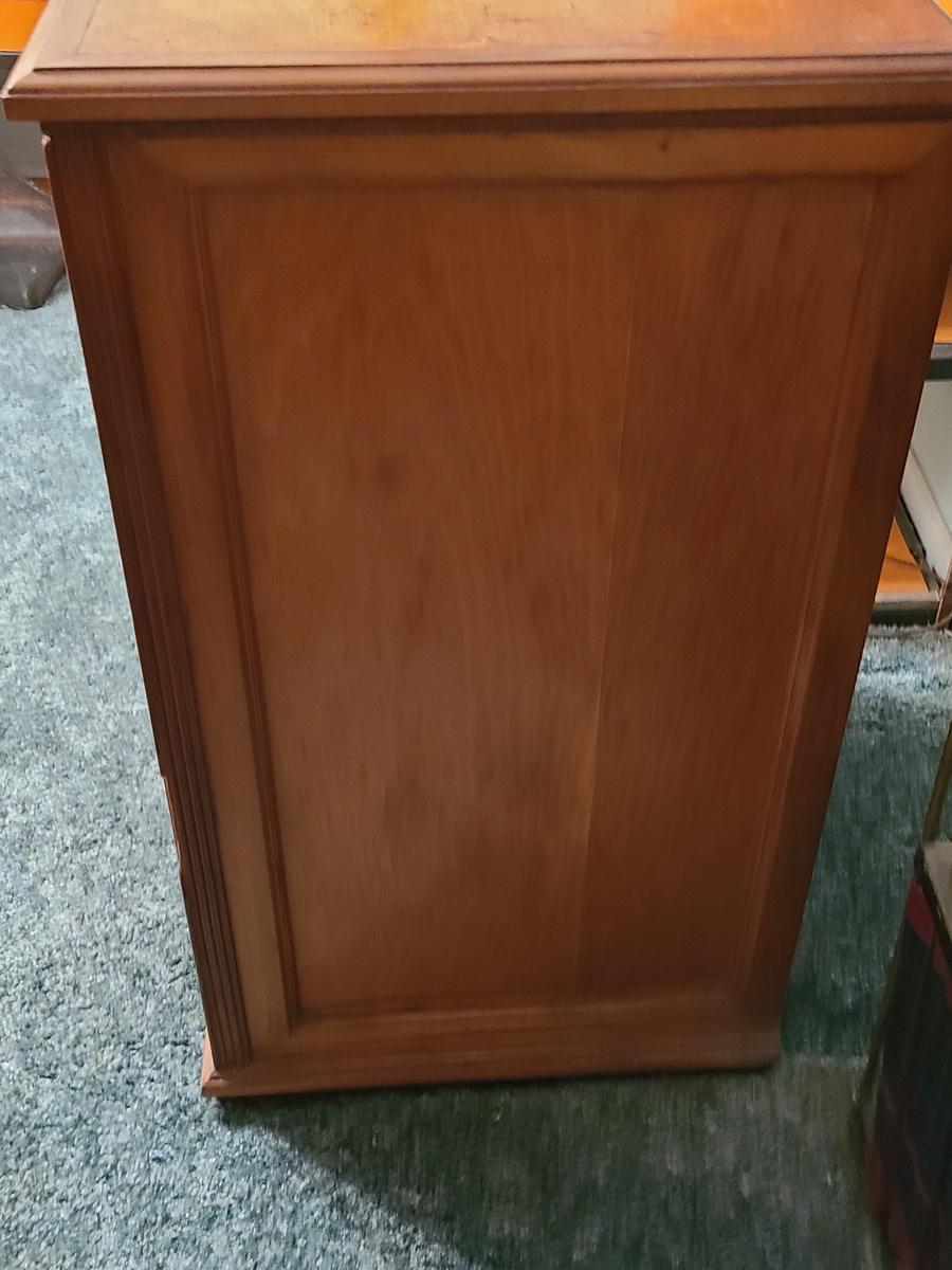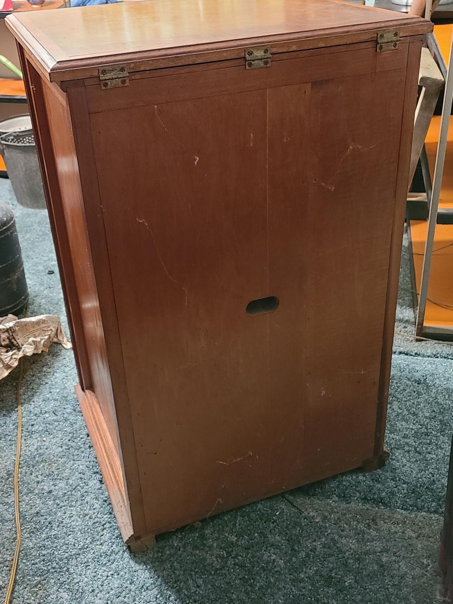 This neat little piece is the perfect size for any house and would look great for record player, as it fits records in the bottom, or could be up-cycled into bar. The bottle is not included. The sides do show some wear as there is a split in the wood that would need to be glued. The pictures show condition, measurements if taken, and what is included in the lot. Due to the large amount that we photograph and the time frame, we are not always able to take measurements. All items unless noted, are pre-owned and have been used. If you purchased furniture, you must bring help. We do not allow one person to carry large furniture out on their own. Bring help, tools and a truck for the safety of our client’s homes, and your personal safety. Company policy. Thank you.