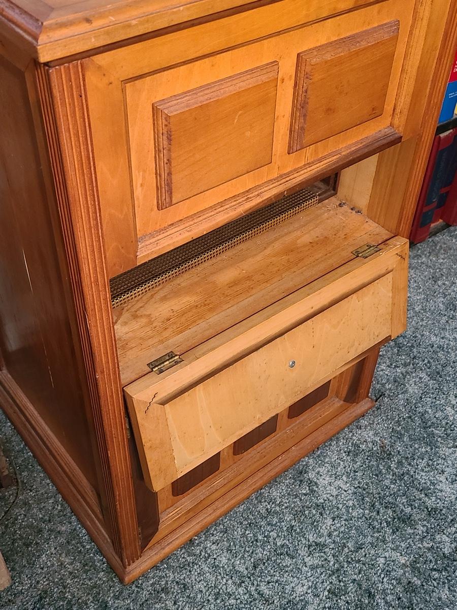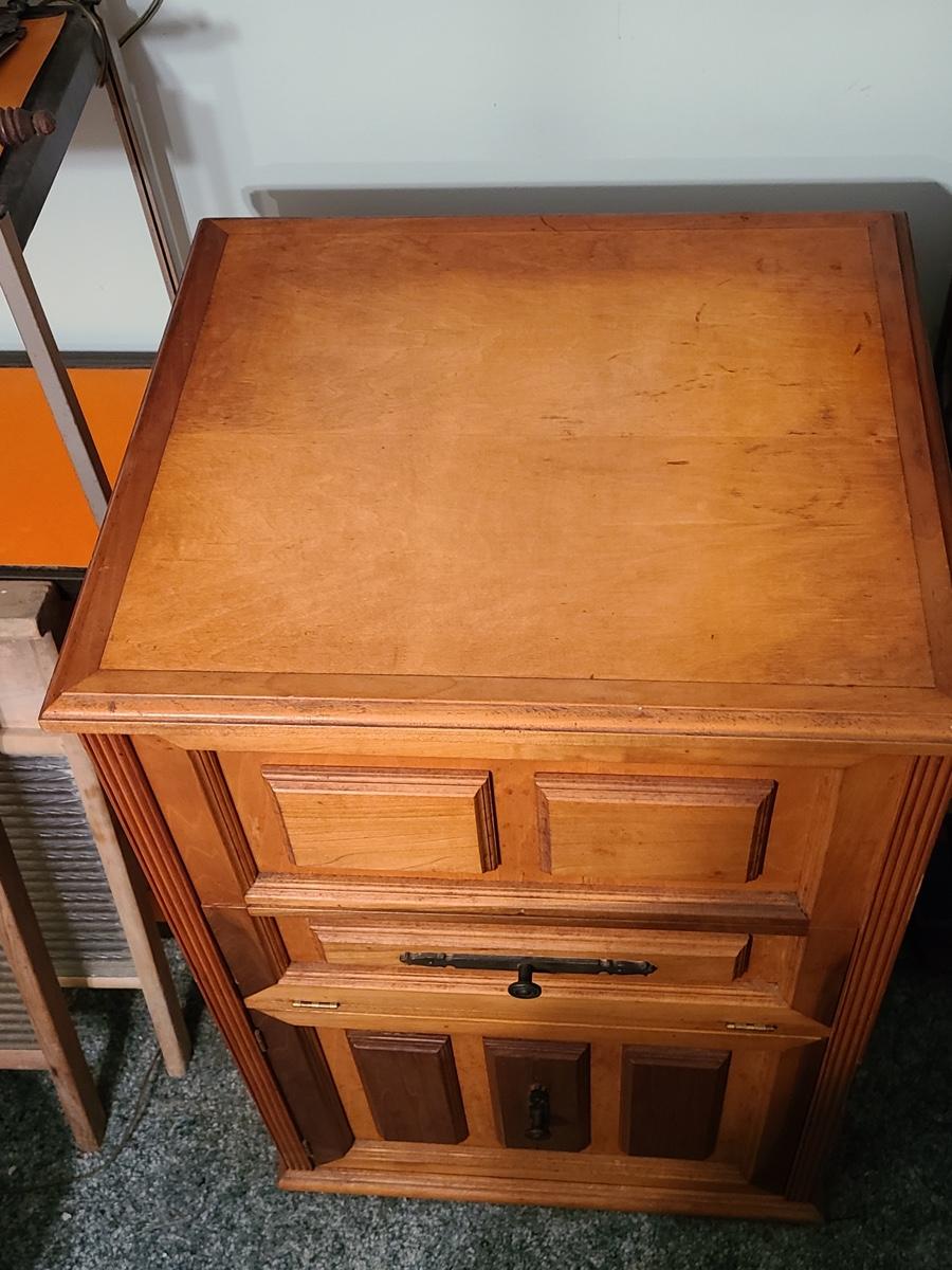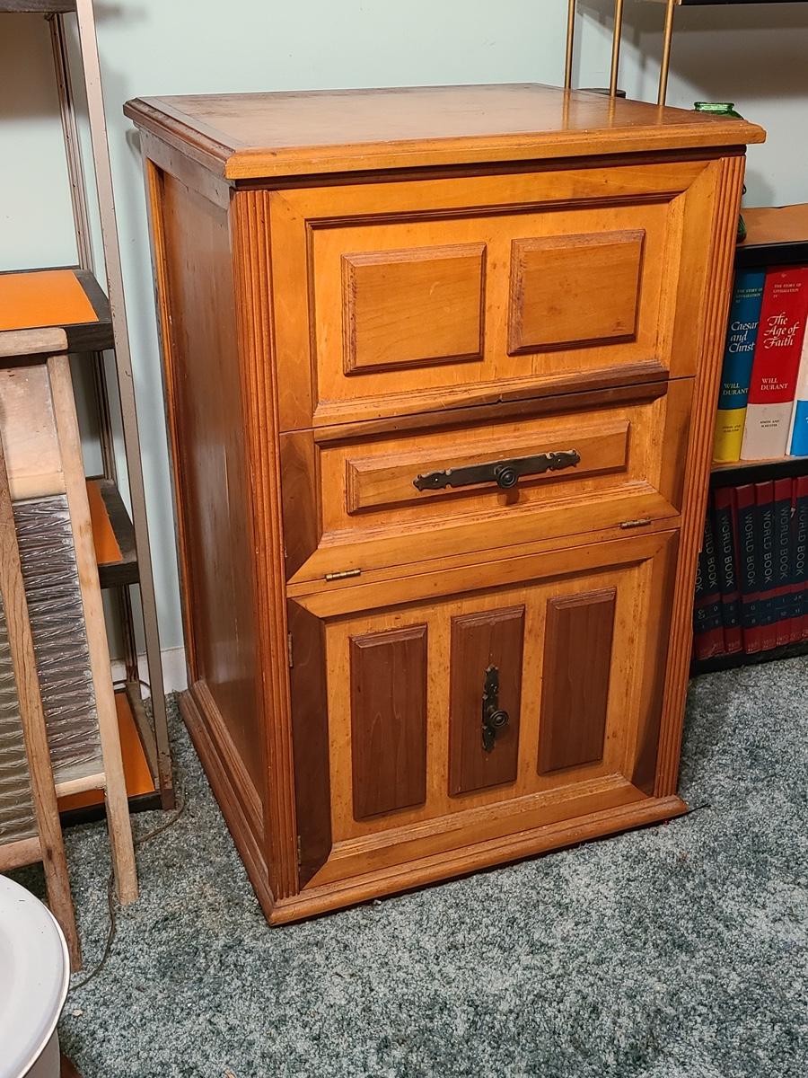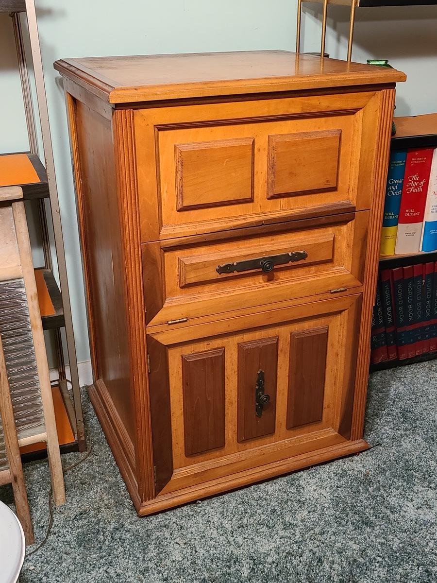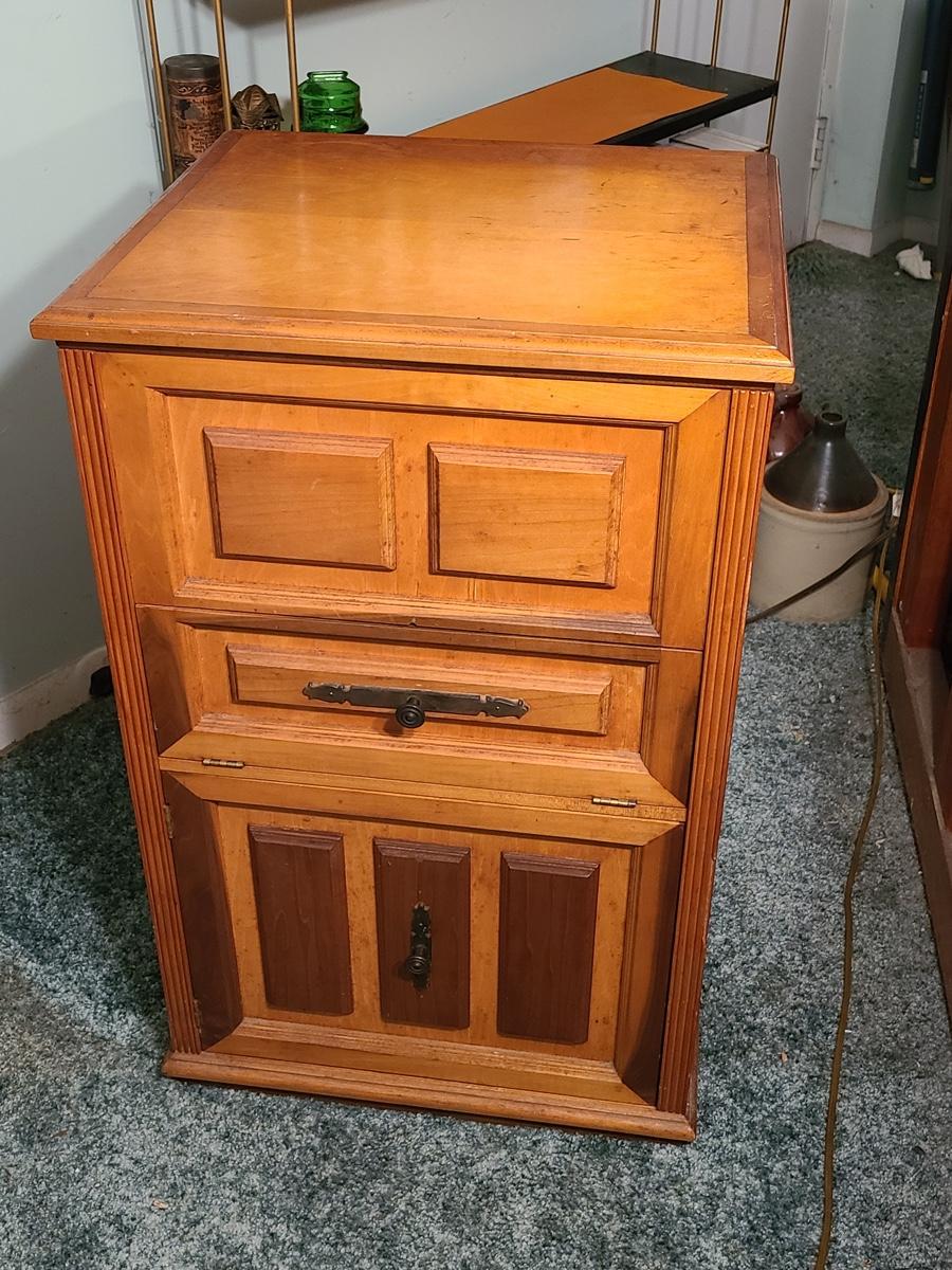 This neat little piece is the perfect size for any house and would look great for record player, as it fits records in the bottom, or could be up-cycled into bar. The bottle is not included. The sides do show some wear as there is a split in the wood that would need to be glued. The pictures show condition, measurements if taken, and what is included in the lot. Due to the large amount that we photograph and the time frame, we are not always able to take measurements. All items unless noted, are pre-owned and have been used. If you purchased furniture, you must bring help. We do not allow one person to carry large furniture out on their own. Bring help, tools and a truck for the safety of our client’s homes, and your personal safety. Company policy. Thank you.