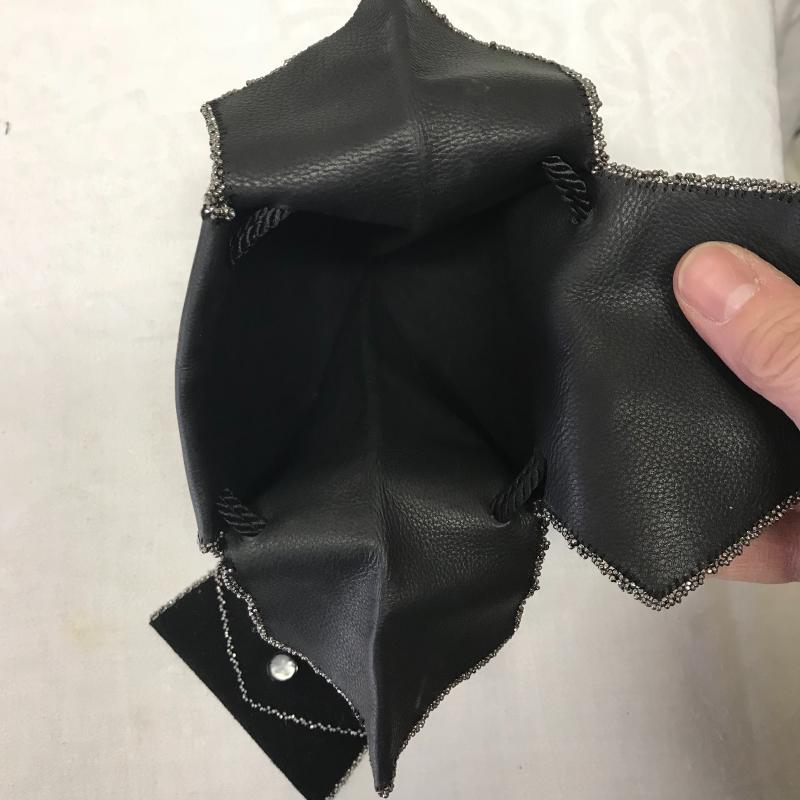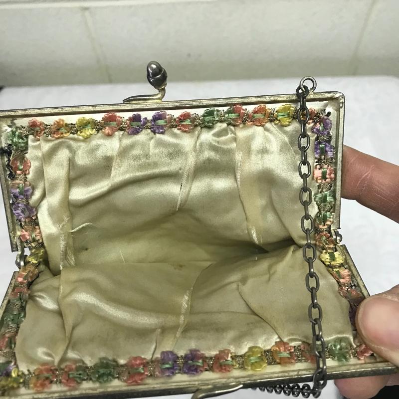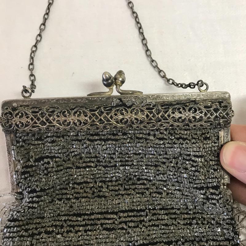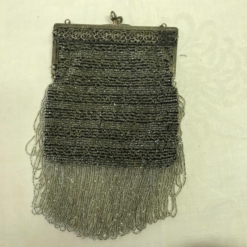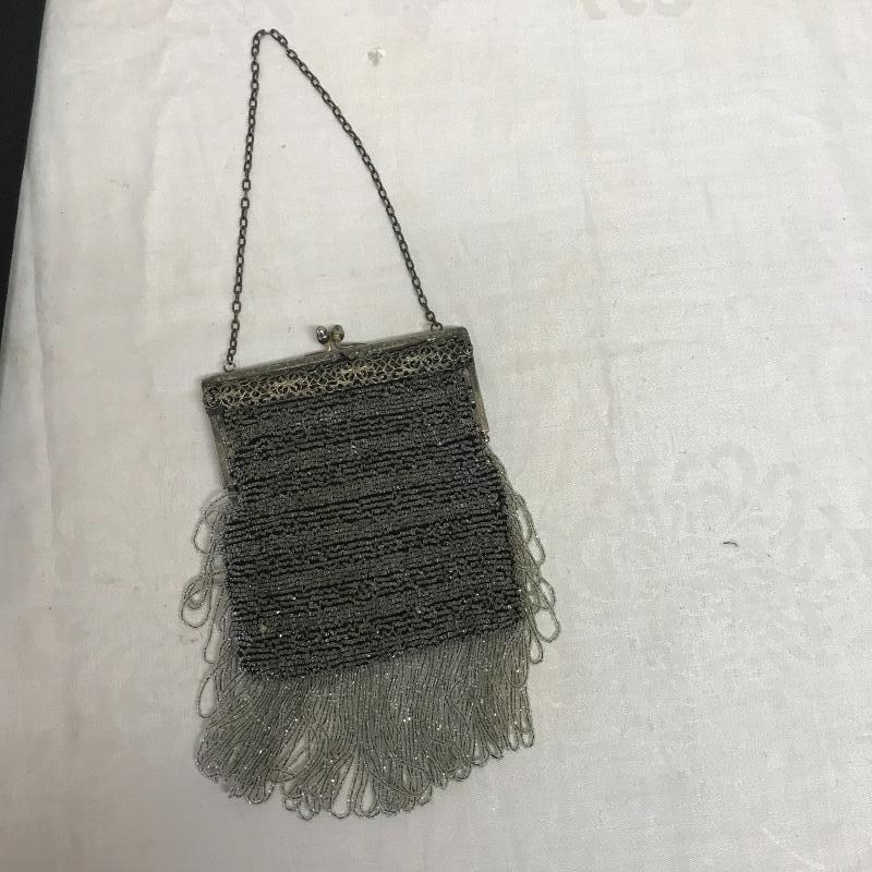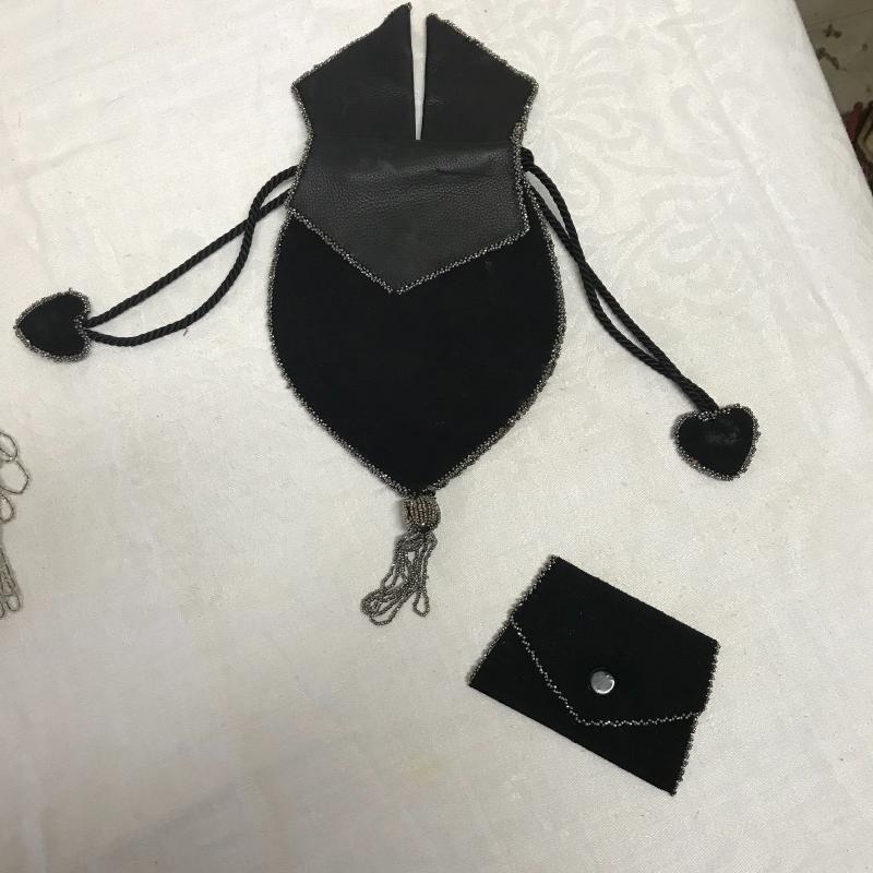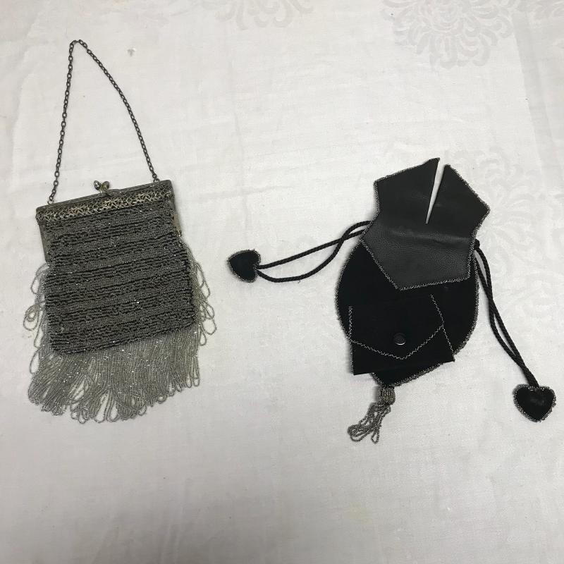 Silver beaded purse with silk lining in good condition. Opening may be sterling but no marking found. Measures 5.5” x5”. Other purse is black suede vintage style. Has a matching small change purse and looks unused. Lot is available for shipping or local pick up in Asheville, NC.