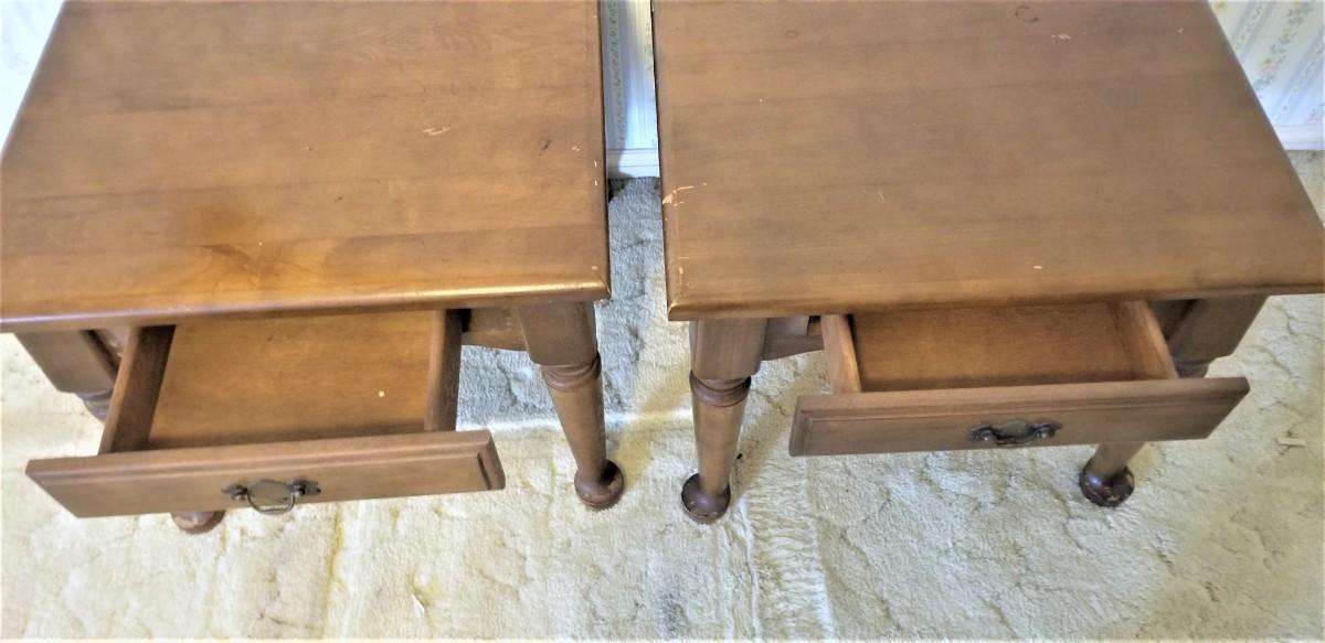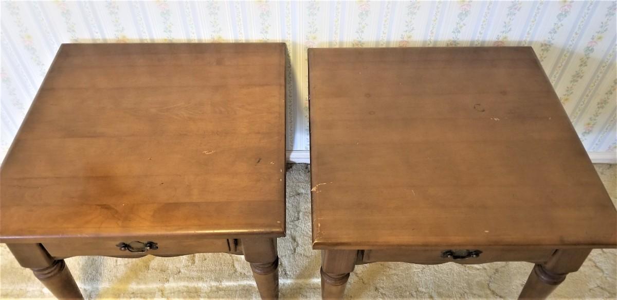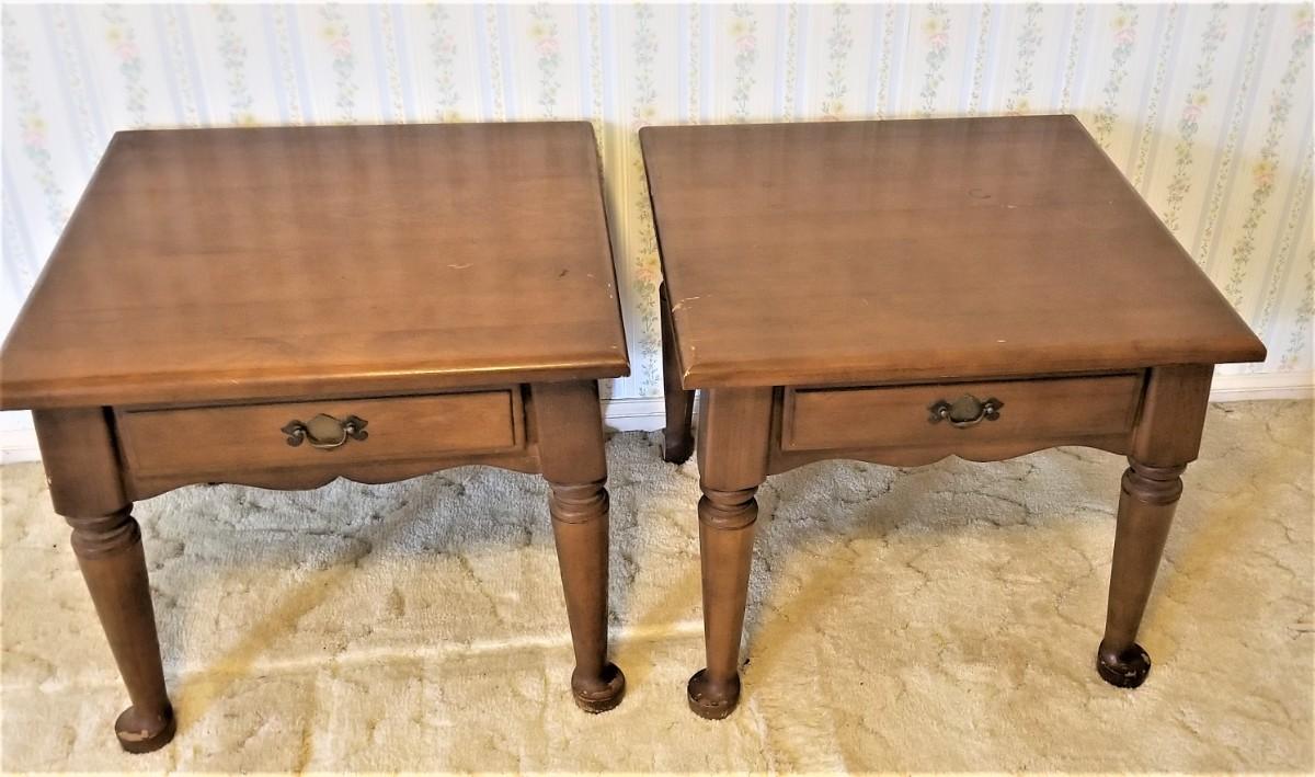 No maker noted - pair of solid wood lamp tables - each has one drawer. They each measure 2 feet by 2 feet, 21" tall - probably 1970's. Vintage used condition. - these would be good candidates for a chalk paint project.