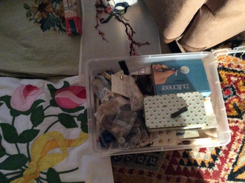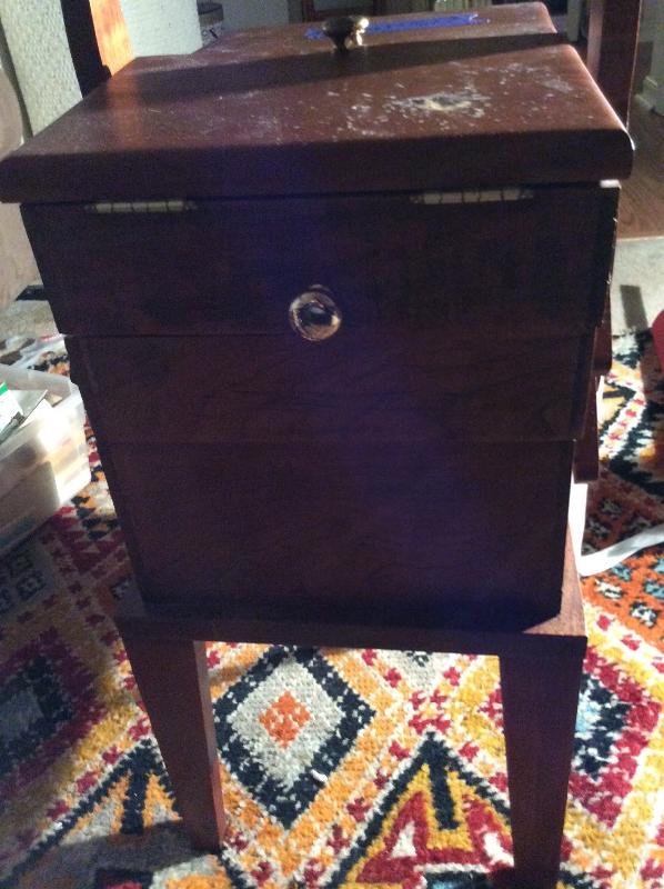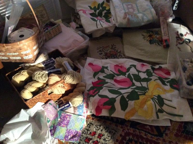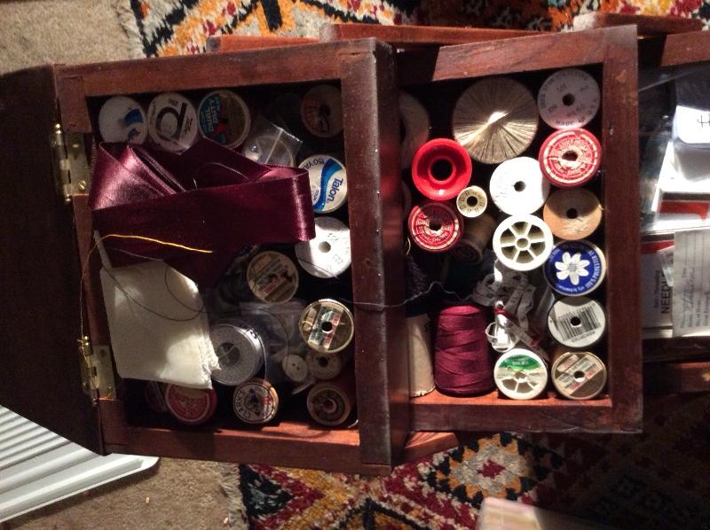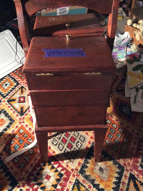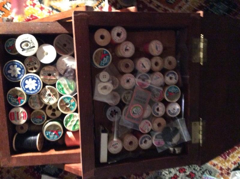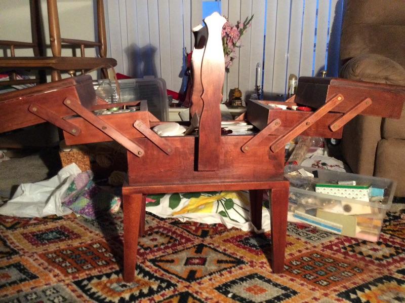 Wooden caddy filled with sewing notions, quilt squares, incomplete quilt projects, needlepoint, yarn, and much more. Please bring boxes for packing, and help to move.