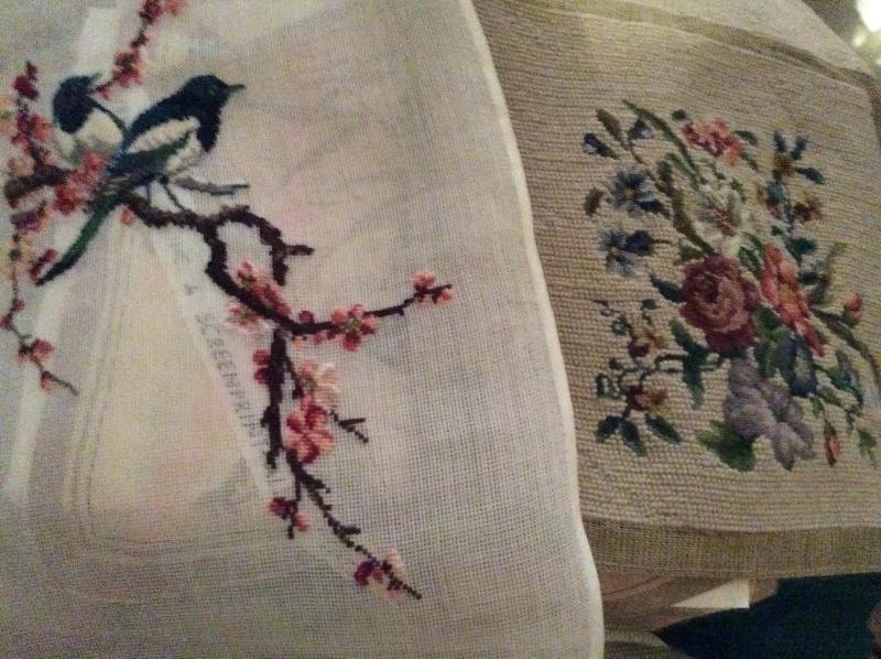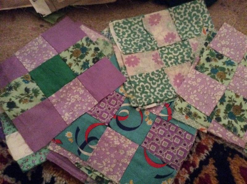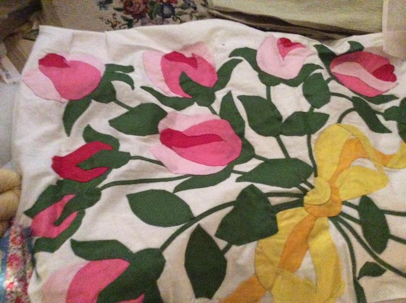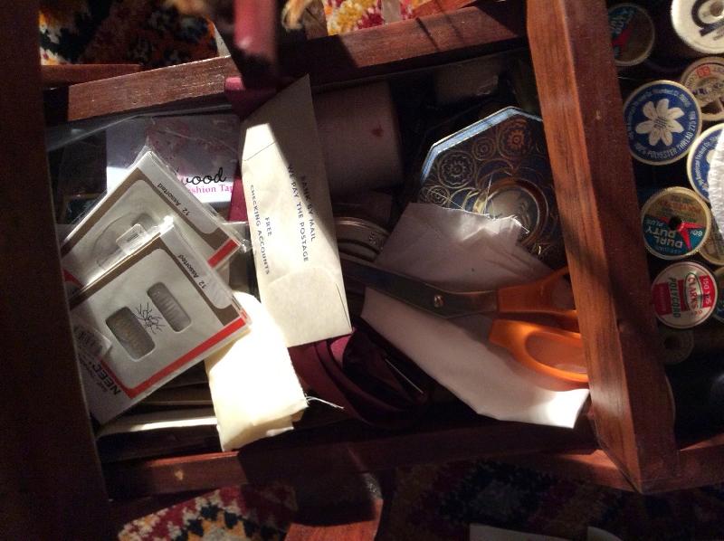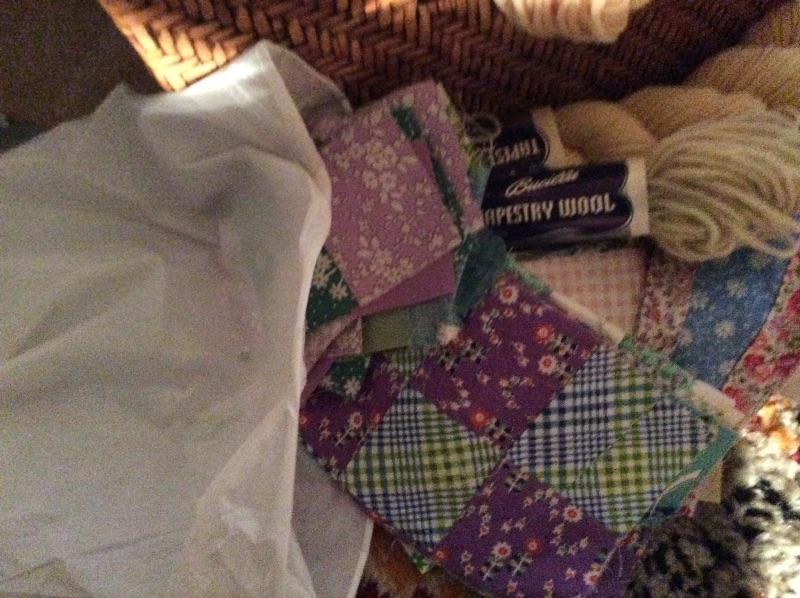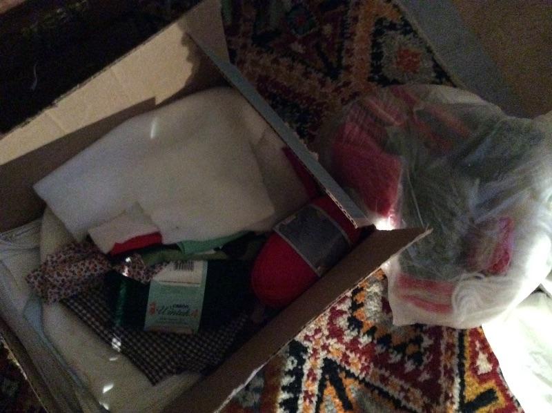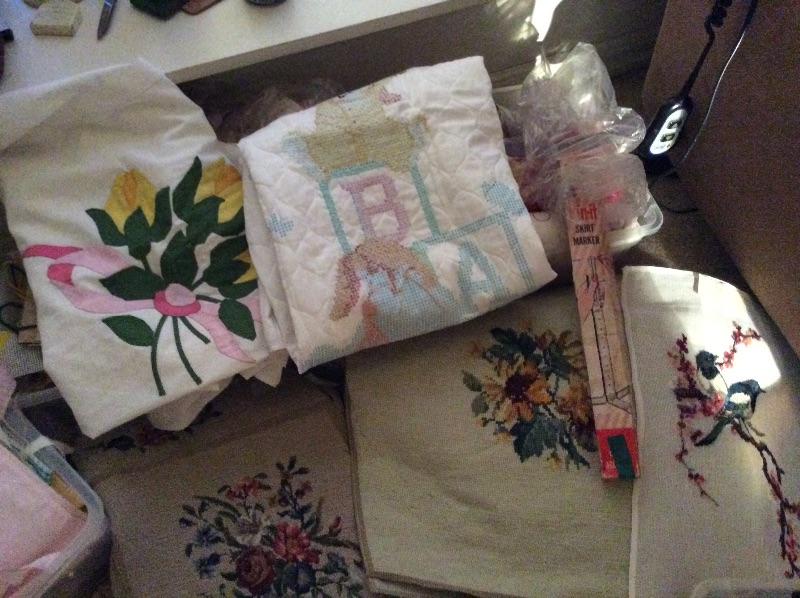 Wooden caddy filled with sewing notions, quilt squares, incomplete quilt projects, needlepoint, yarn, and much more. Please bring boxes for packing, and help to move.