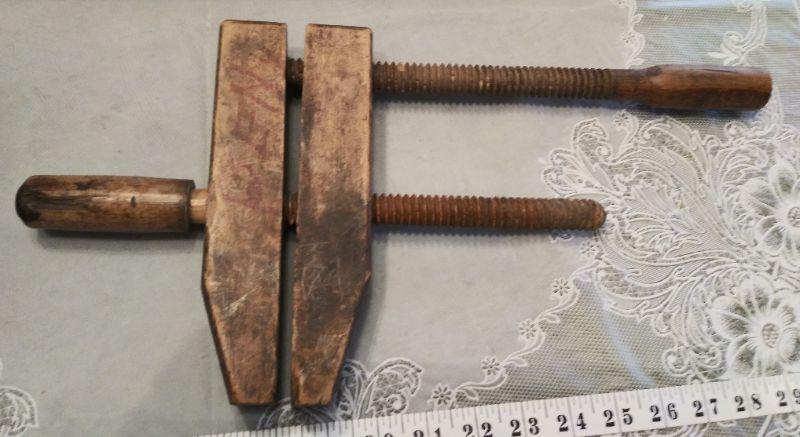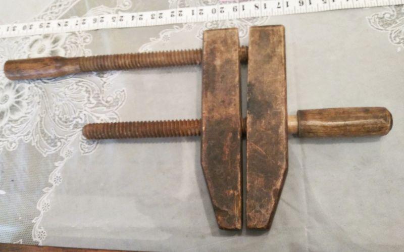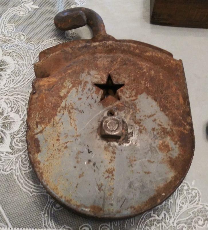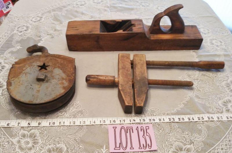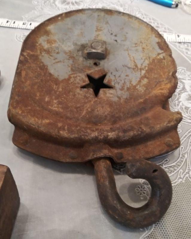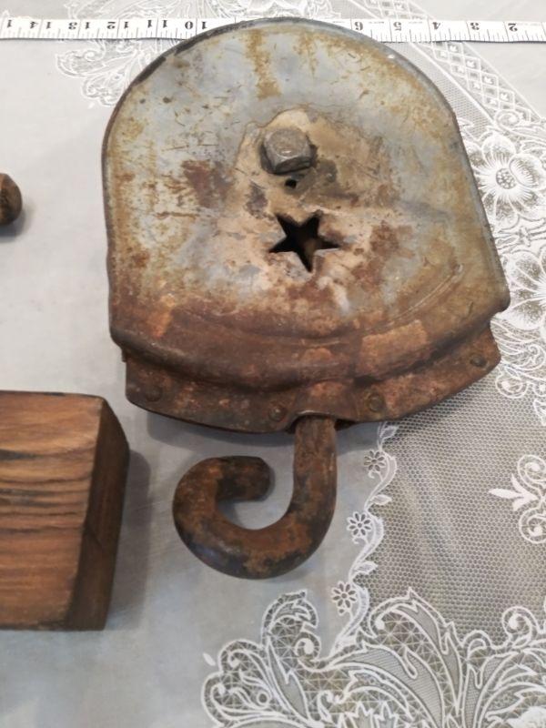 METAL BARN PULLEY, WOODEN CLAMP W/"BEN" WRITTEN ON IT