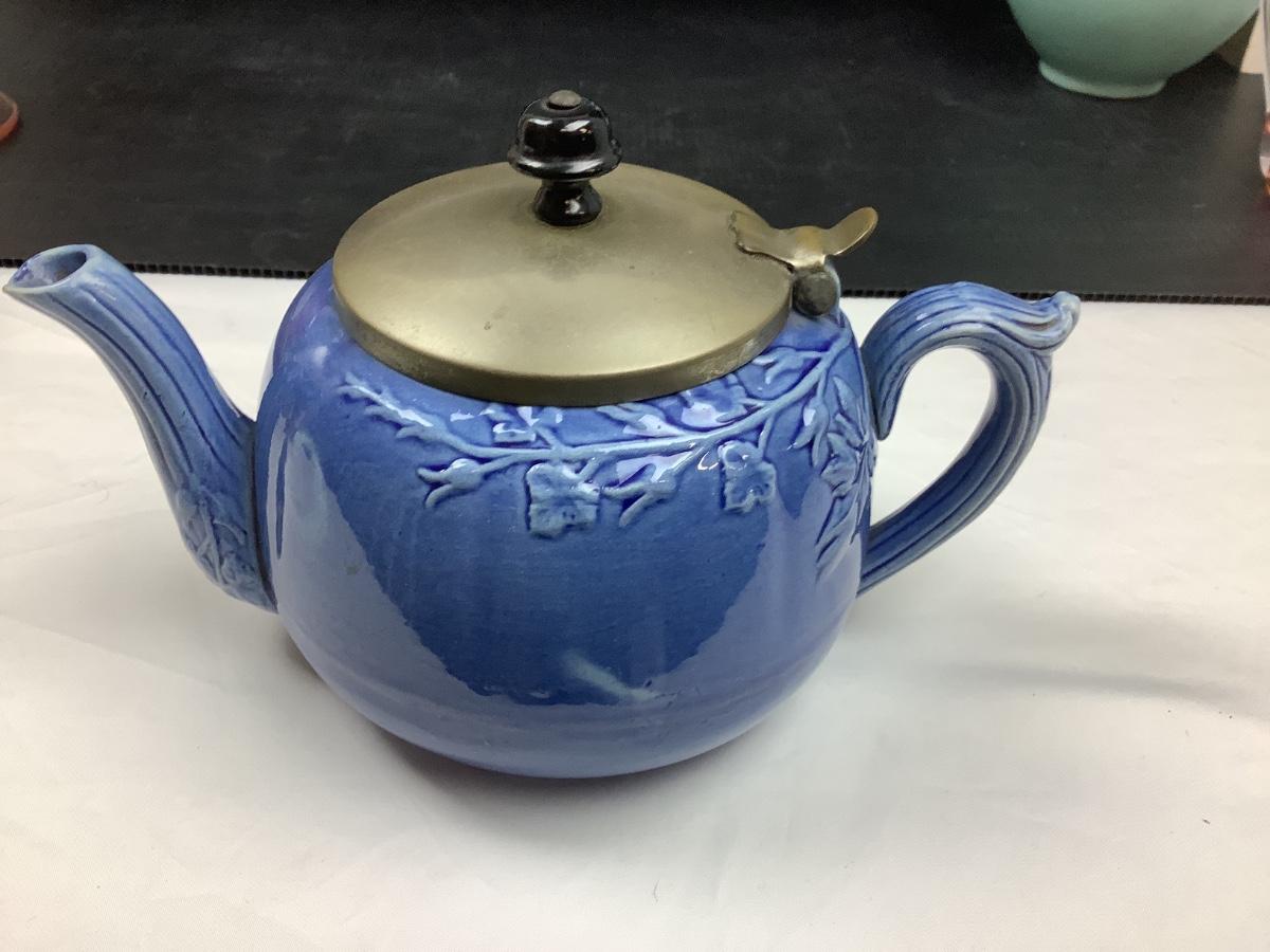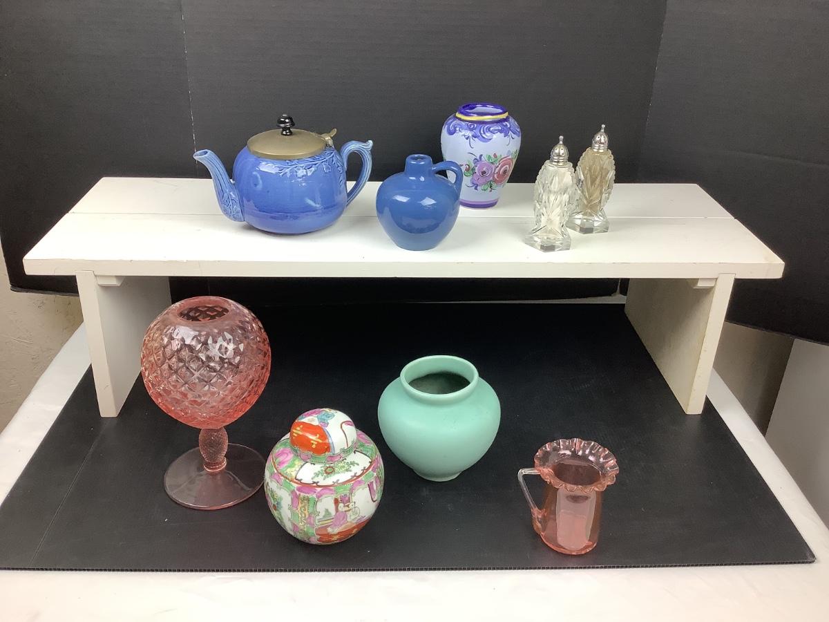 Majolica teapot, Camark vase ,pink glassware, oriental ginger jar,salt and pepper ,pottery vase and jug.