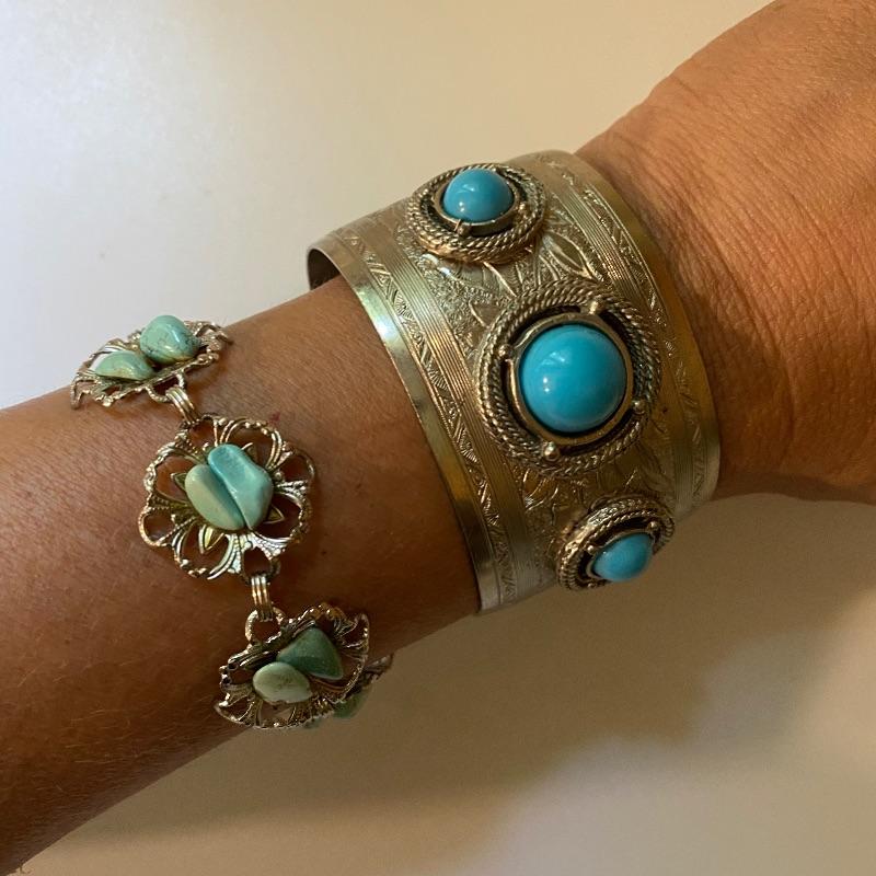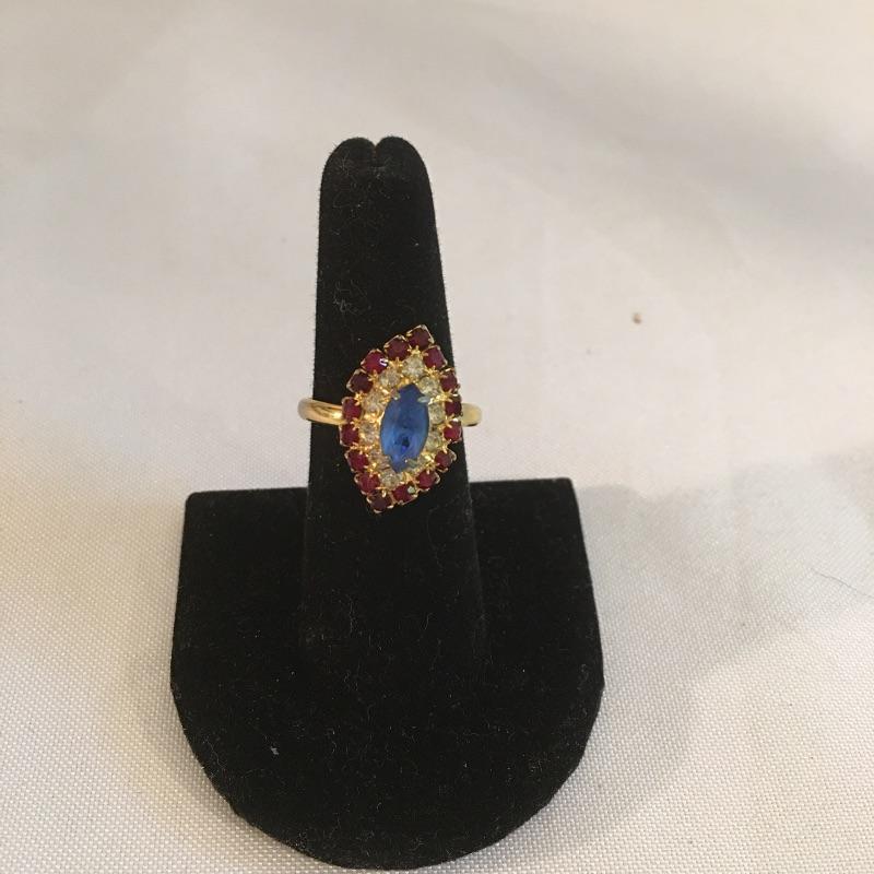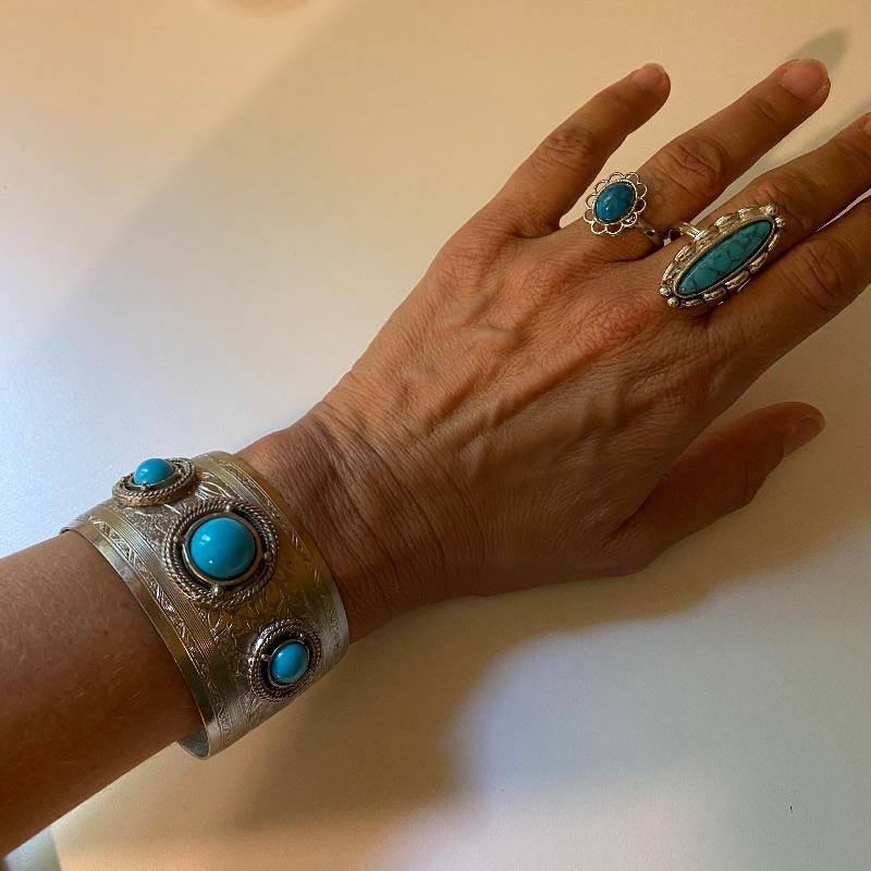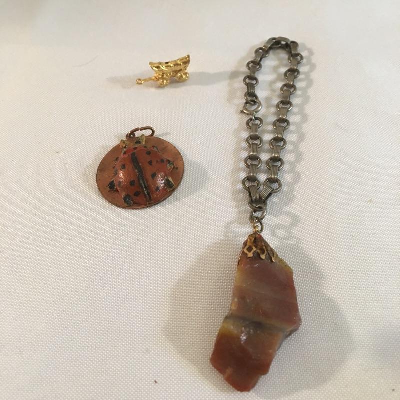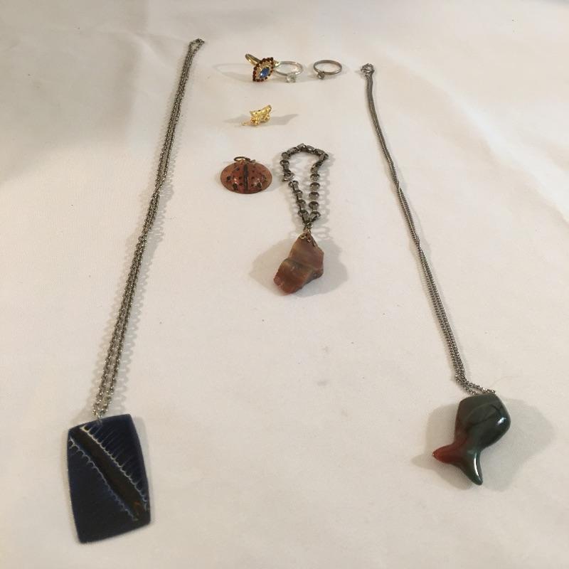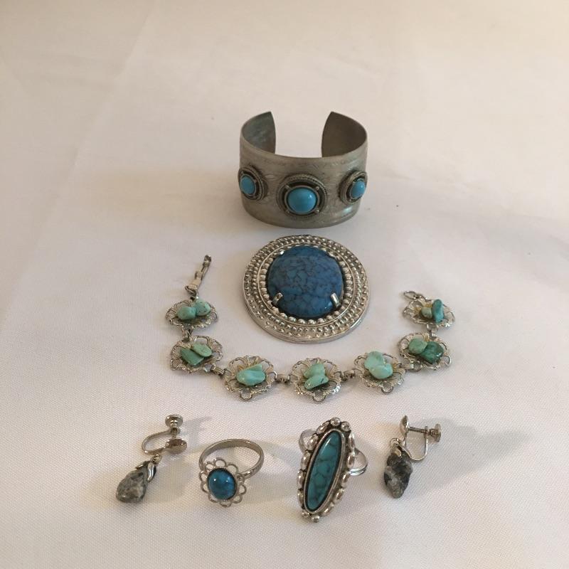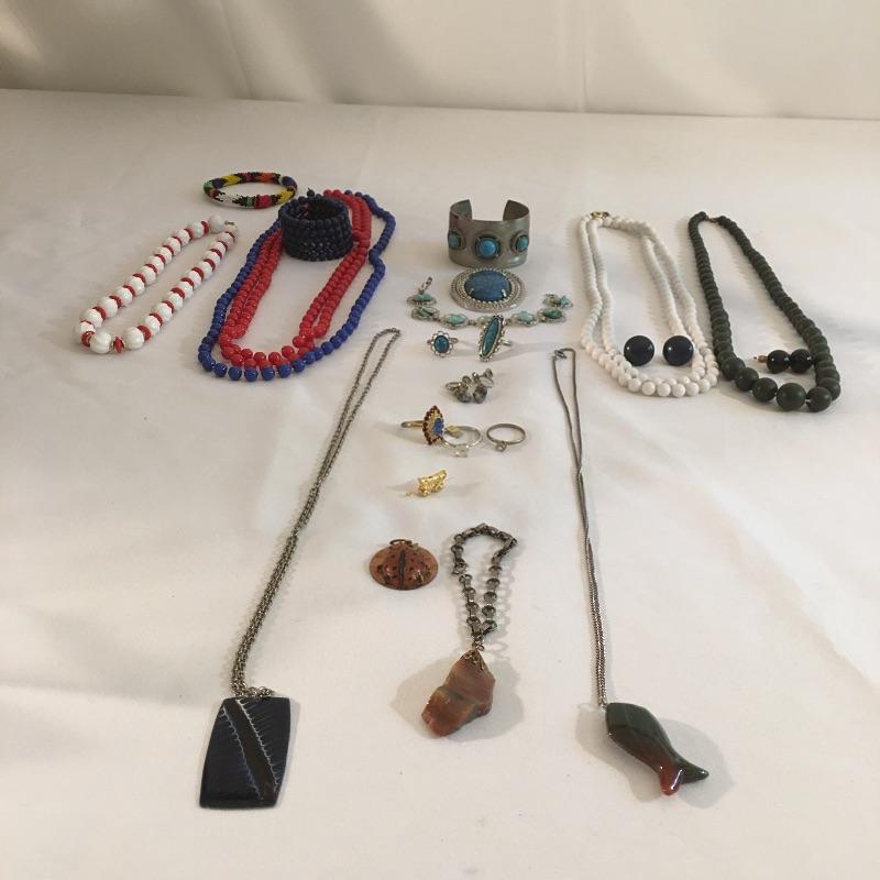 This array of costume jewelry has a style for every mood. Includes faux turquoise and silver colored rings, pin, cuff and bracelet, two rings with clear stones, ring with ruby, clear and colored ring, ladybug pendant, bead bracelet, earrings blue enamel pendant, stone pieces and more.