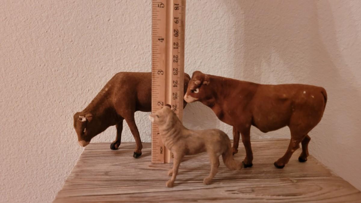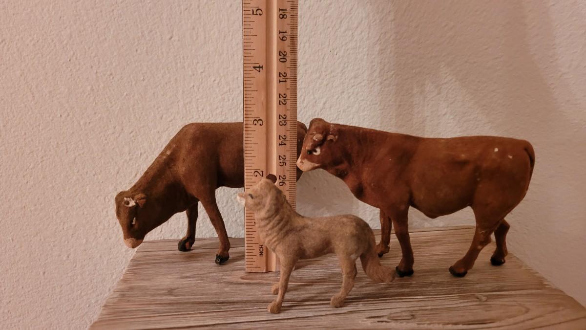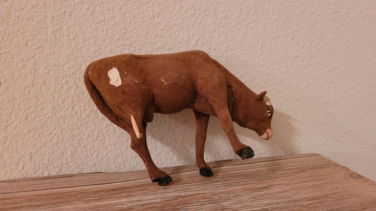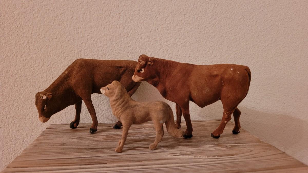 Cow and Small Animal Missing a leg and both cows missing their horns.