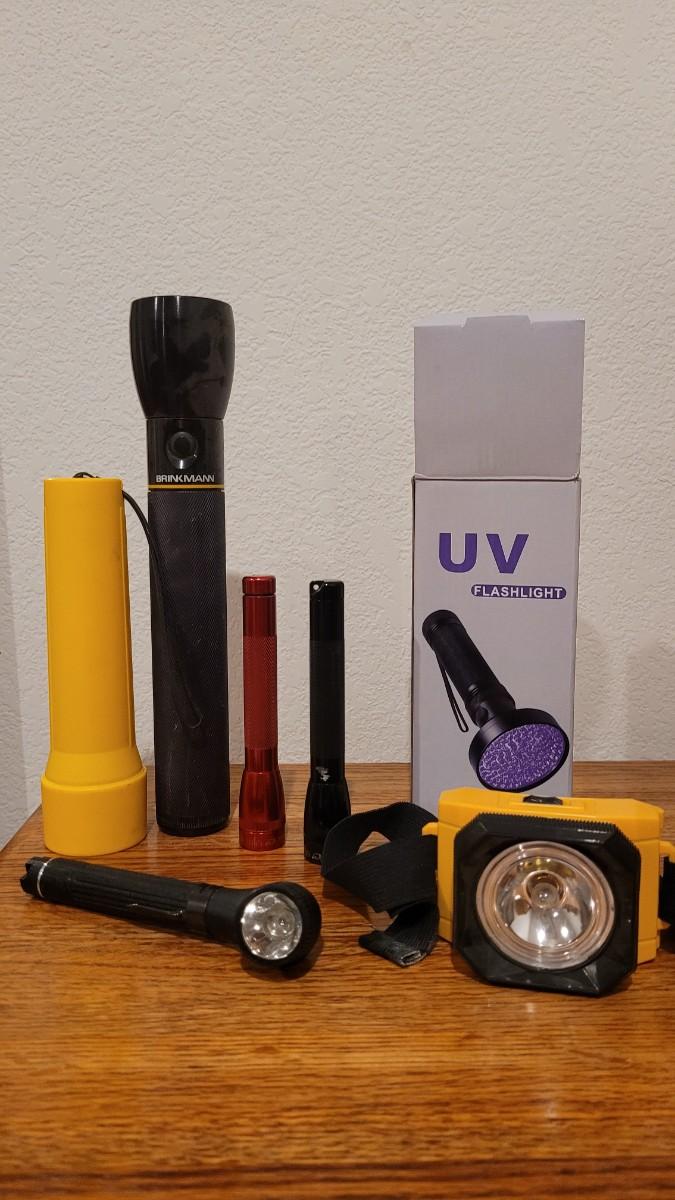 Lot 136: Head and Handheld Flashlights includes New in Box Scorpion UV Flashlight