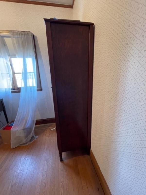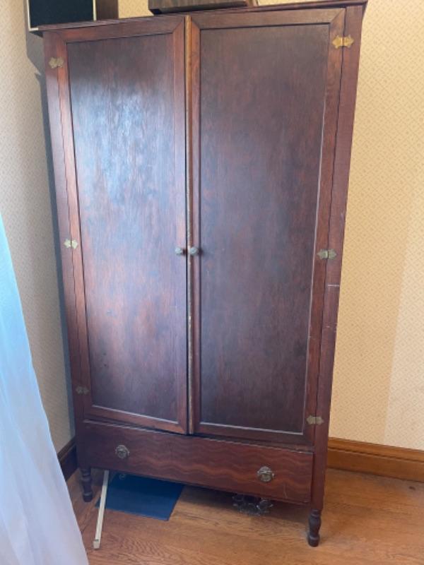 Lot 136. Armoir (1940s), two-door with wardrobe hanger, 1 drawer, 1 shelf (36.5”W x 18.5”D x 67”H)--$45