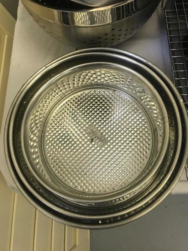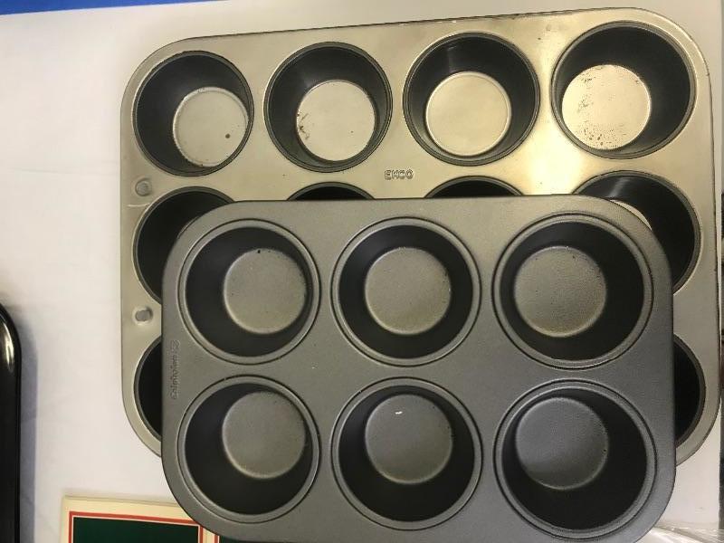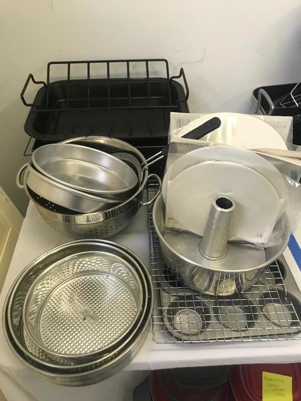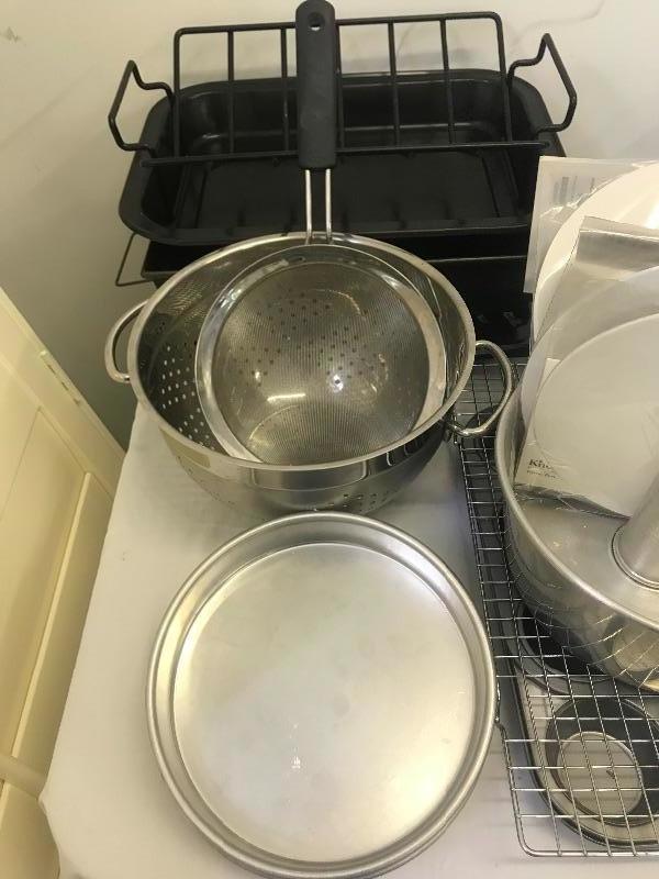Calphalon baking pan 8”x13”, set of 3 Kaiser springform pans, Stainless steel colander, OXO strainer, angel food cake pan, pair of 8” magic line round cake pans, broiler pan, cooling rack, EKCO 12 cup cupcake/muffin pan, Calphalon 6 Cup cupcake/muffin pan