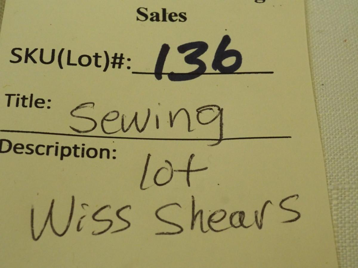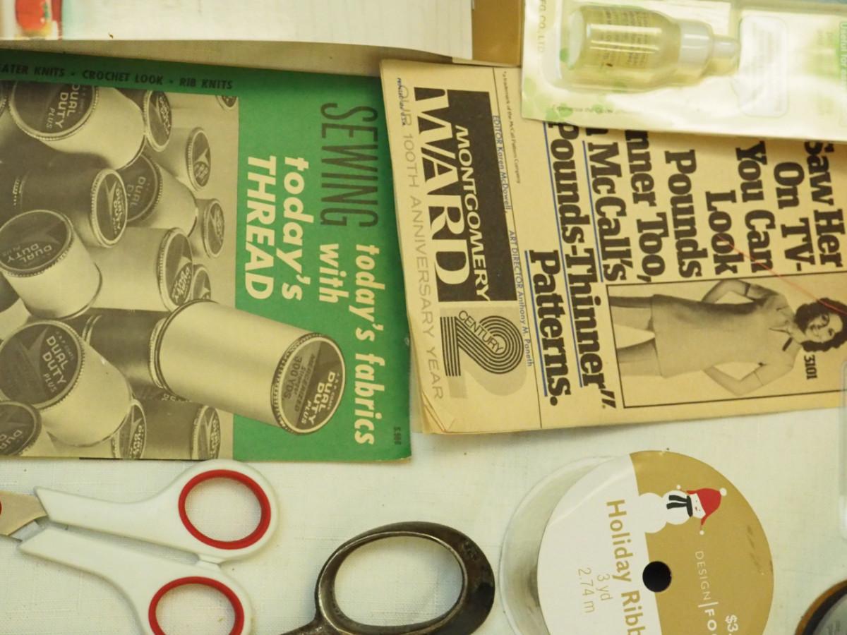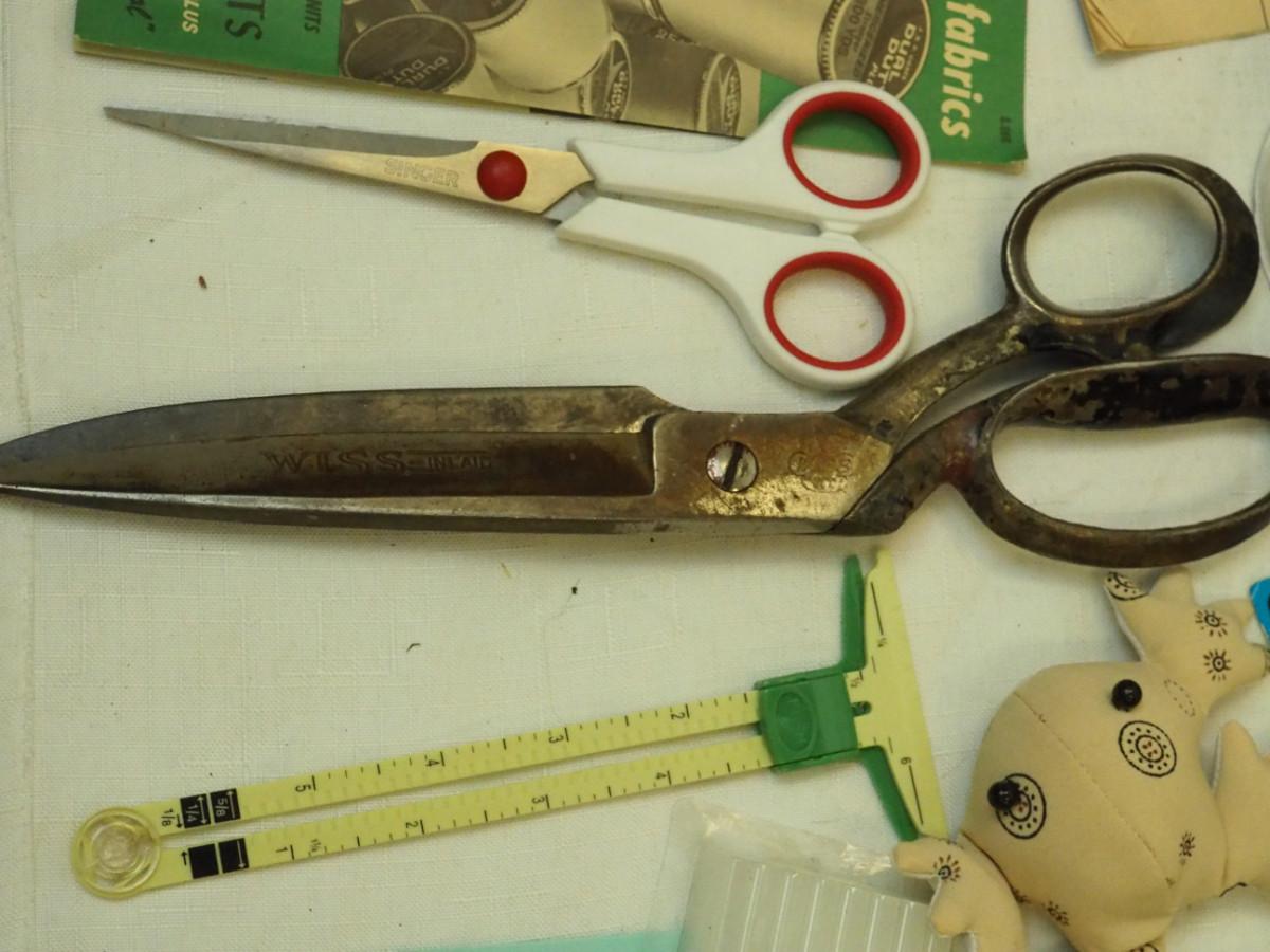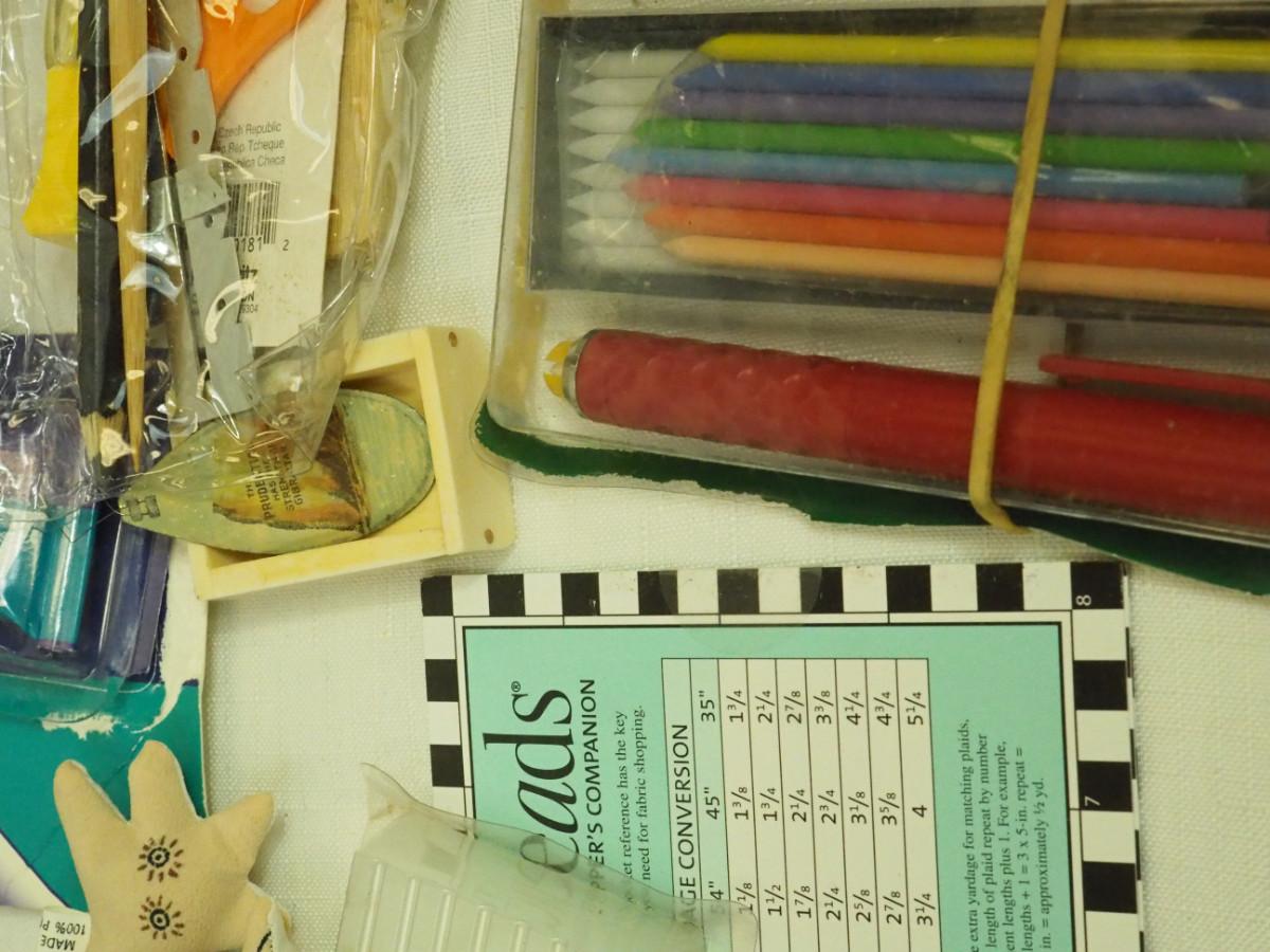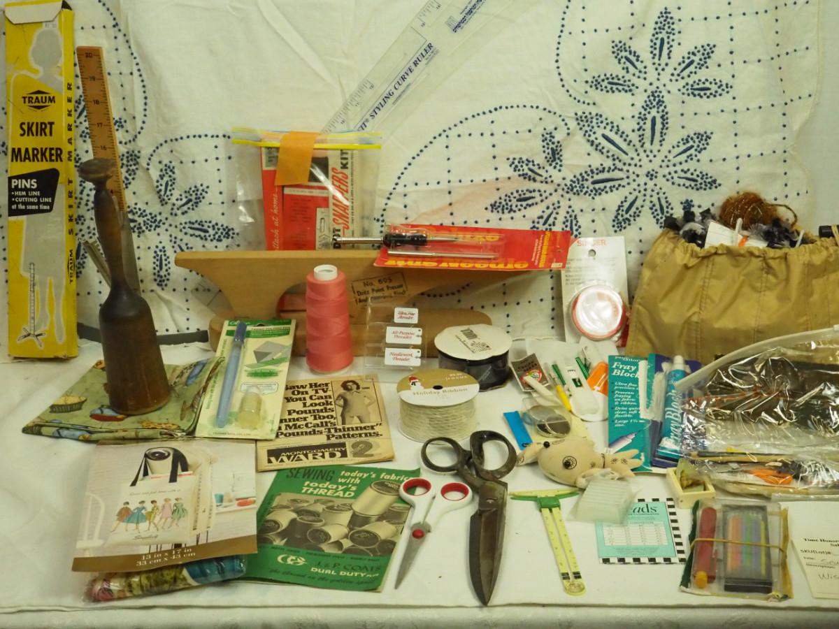 Lot 136- Blue Candlewick tablecloth and Sewing lot: fashion curve ruler, Dritz pressing point block, 2 vintage skirt markers, vintage ads, New Simplicity tote bag, Machine accessories, yarn, sewing bags, Fray Stop color markers, Huge Weiss Shears, Rug needle. Vintage darning wood block.
