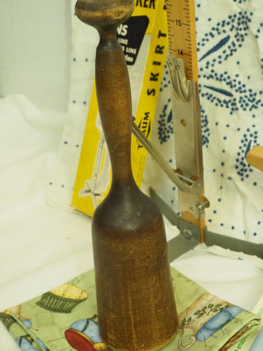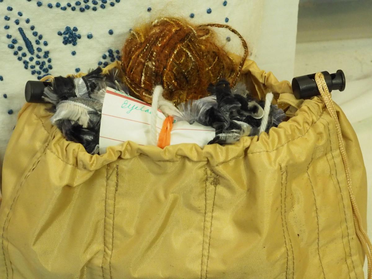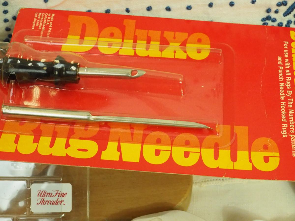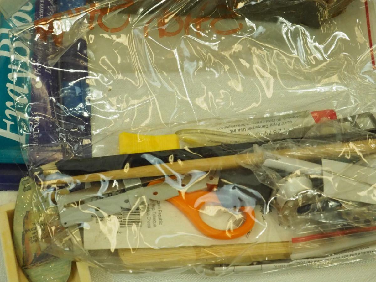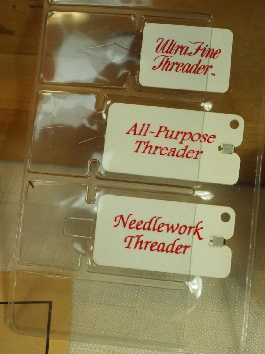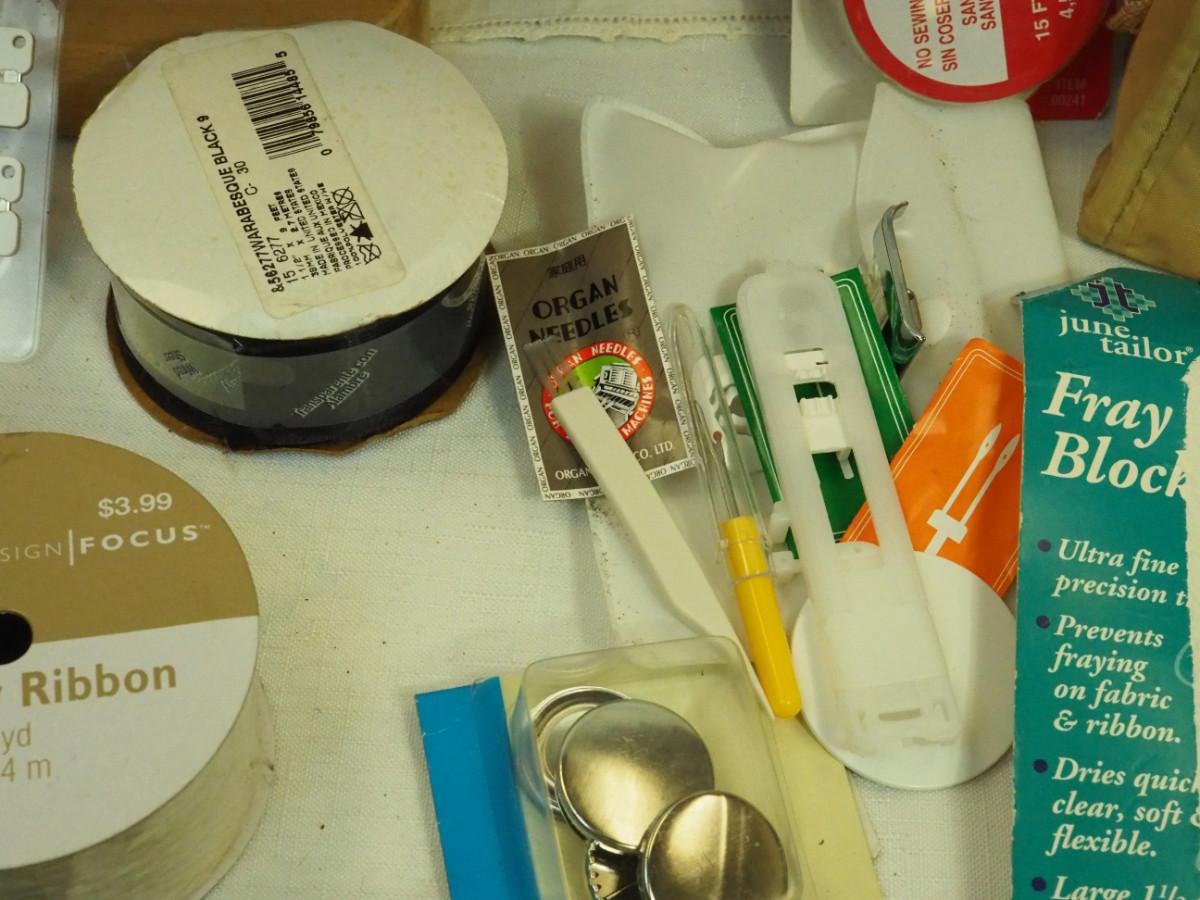 Lot 136- Blue Candlewick tablecloth and Sewing lot: fashion curve ruler, Dritz pressing point block, 2 vintage skirt markers, vintage ads, New Simplicity tote bag, Machine accessories, yarn, sewing bags, Fray Stop color markers, Huge Weiss Shears, Rug needle. Vintage darning wood block.