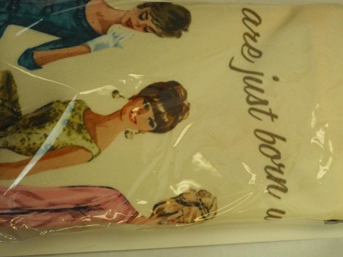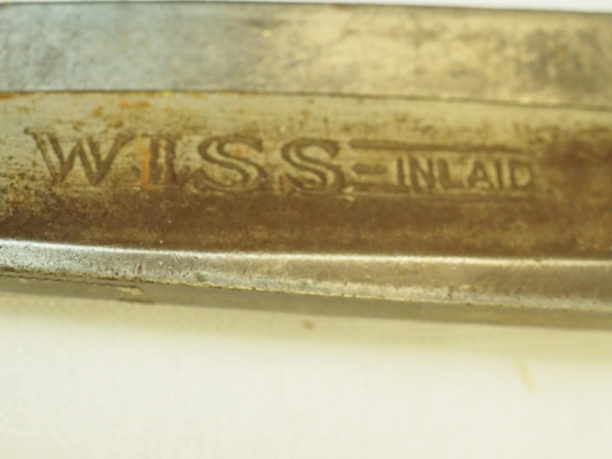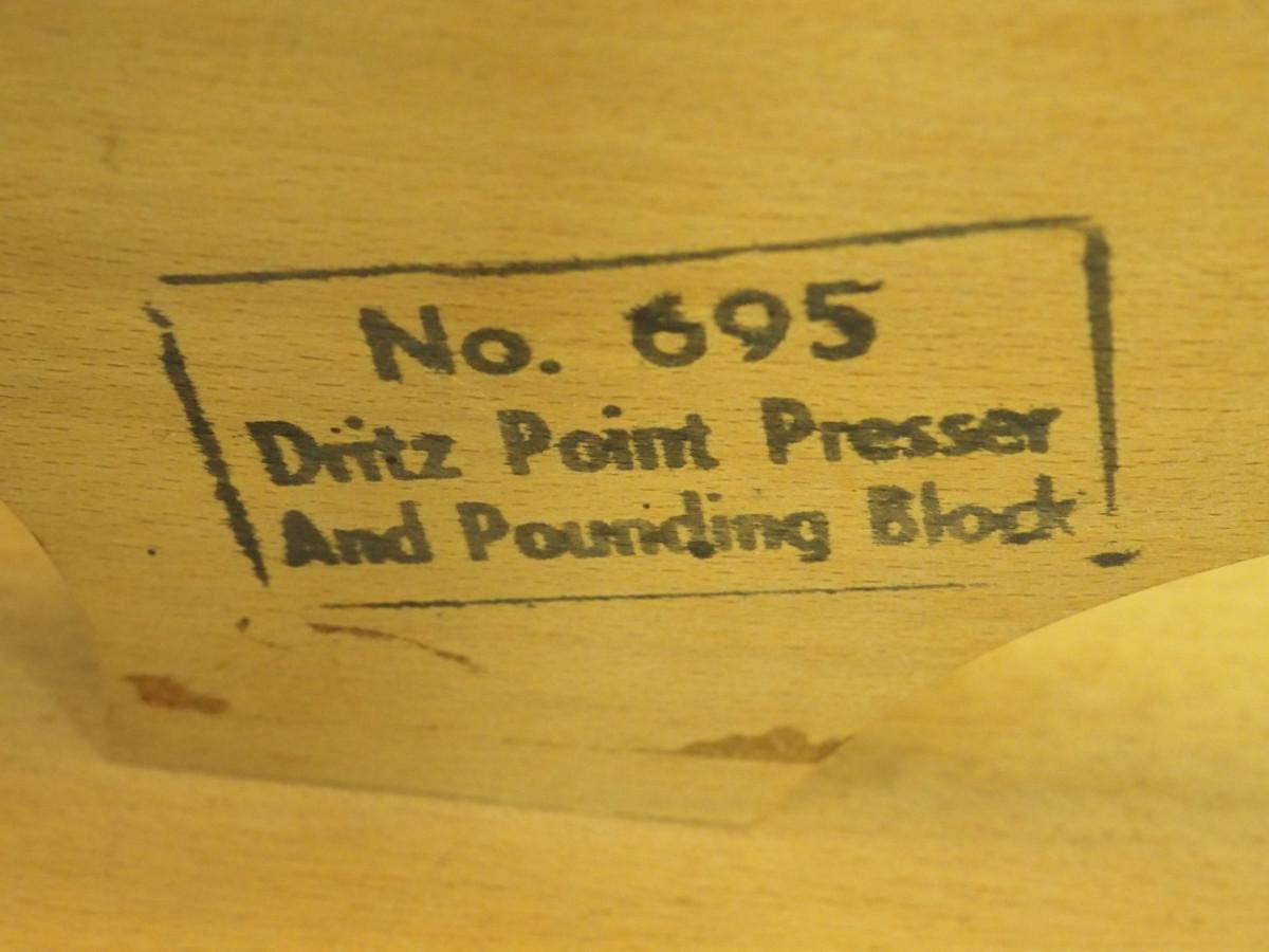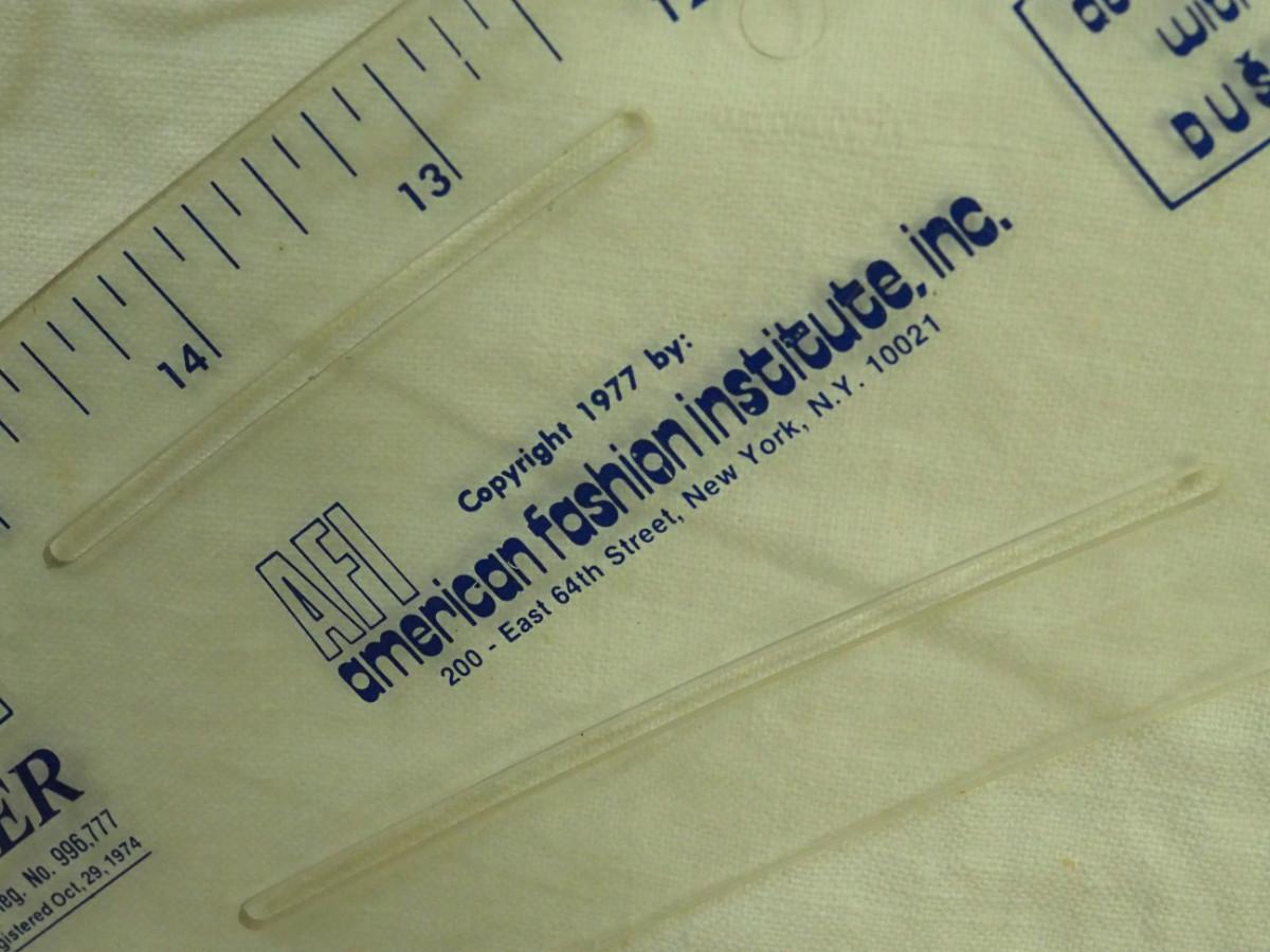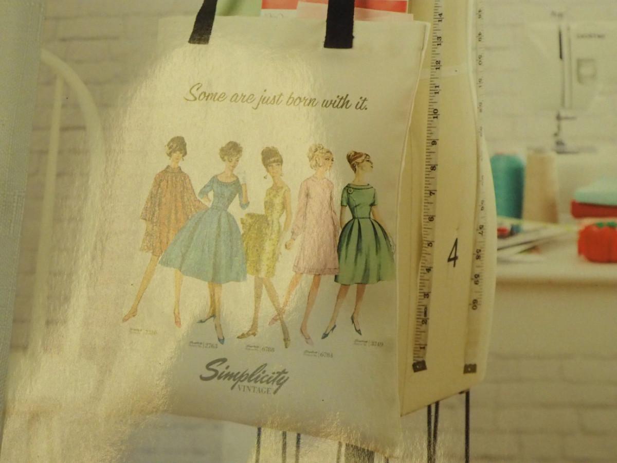 Lot 136- Blue Candlewick tablecloth and Sewing lot: fashion curve ruler, Dritz pressing point block, 2 vintage skirt markers, vintage ads, New Simplicity tote bag, Machine accessories, yarn, sewing bags, Fray Stop color markers, Huge Weiss Shears, Rug needle. Vintage darning wood block.