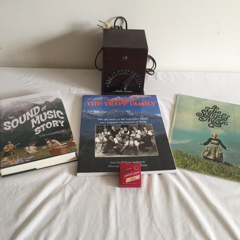 Crystalab electric lighted Metronoma and three books about the Sound of Music and a ukulele pitch pipe.