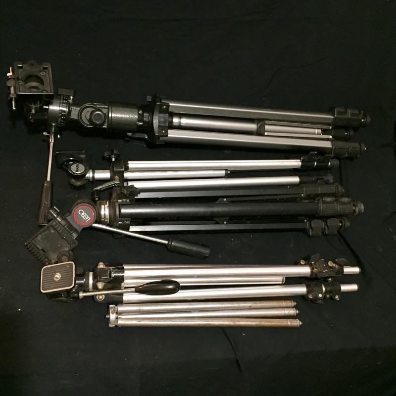 A nice assortment of five camera tripods. The largest one will raise up to 42”.