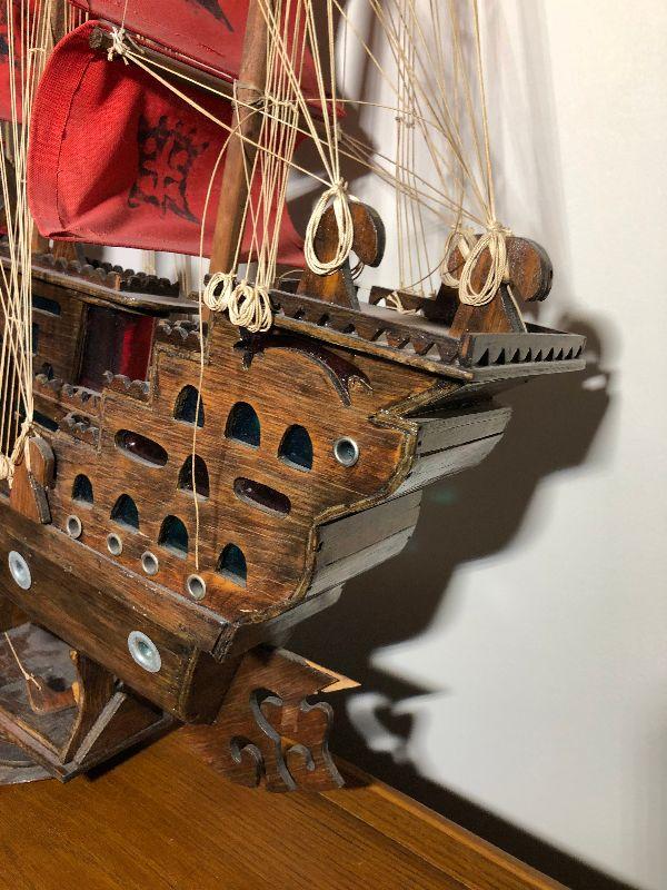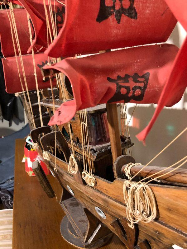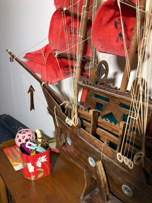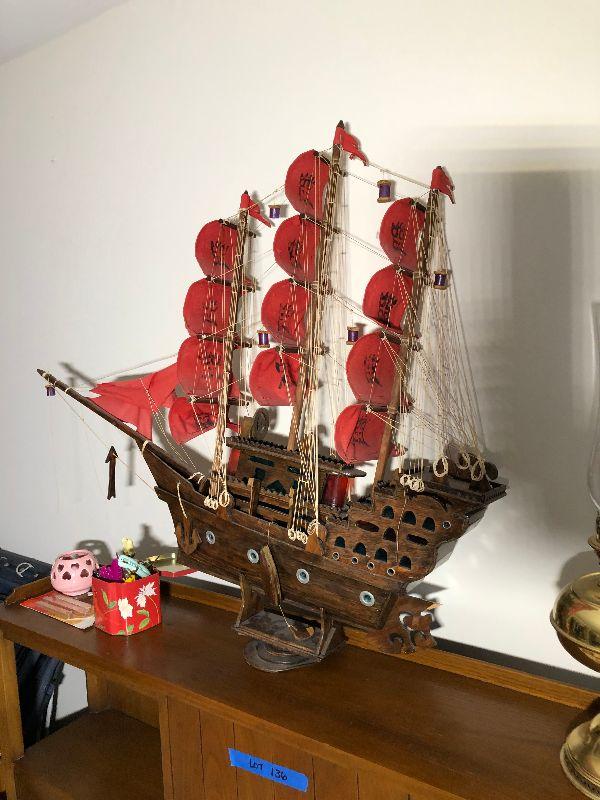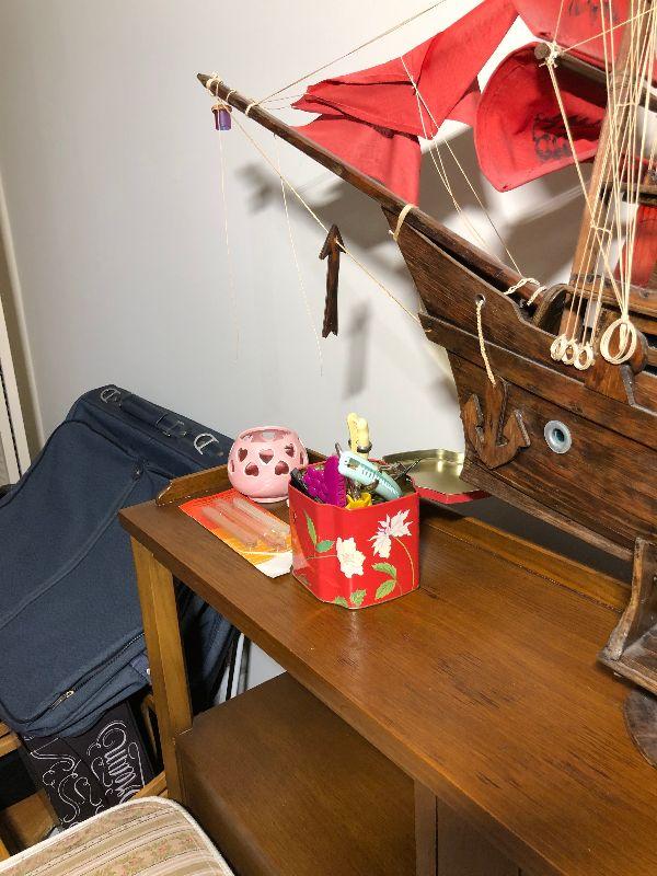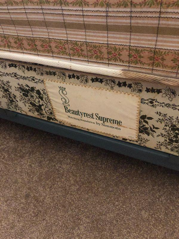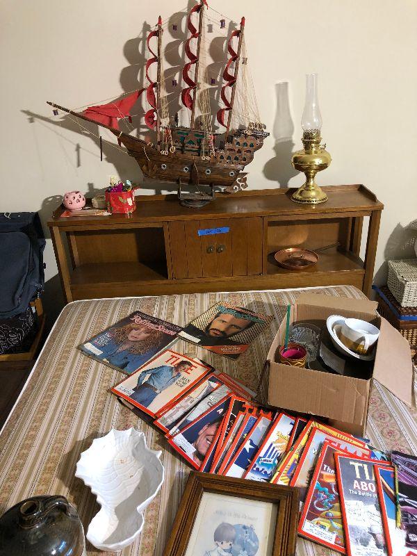 Full bed with Beautyrest Supreme mattress and boxspring, copper pan w/lid, large jug (broken but glued), Rolling Stone and Time magazines large ship (37"L x 31"H) and other miscellaneous items.