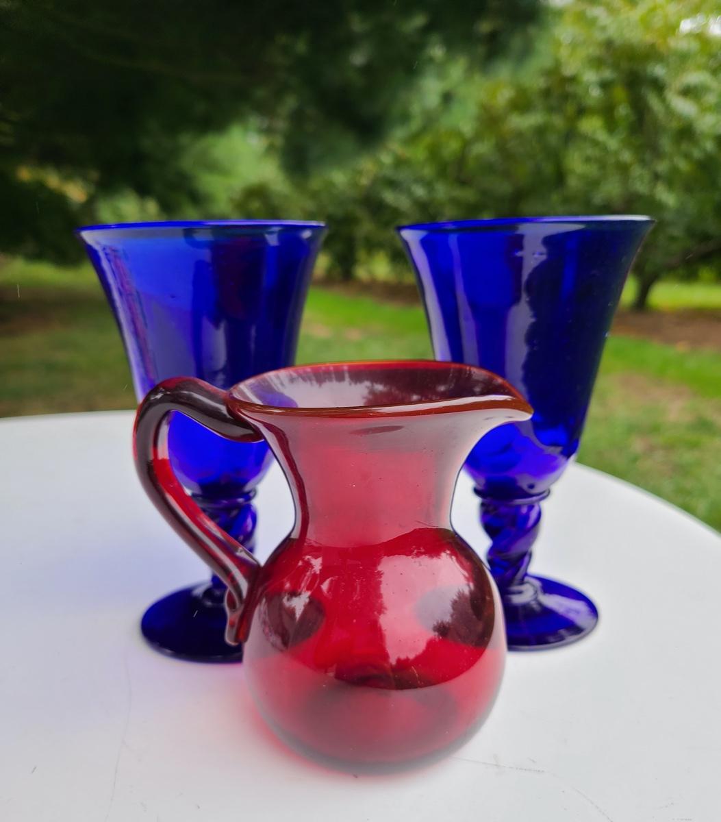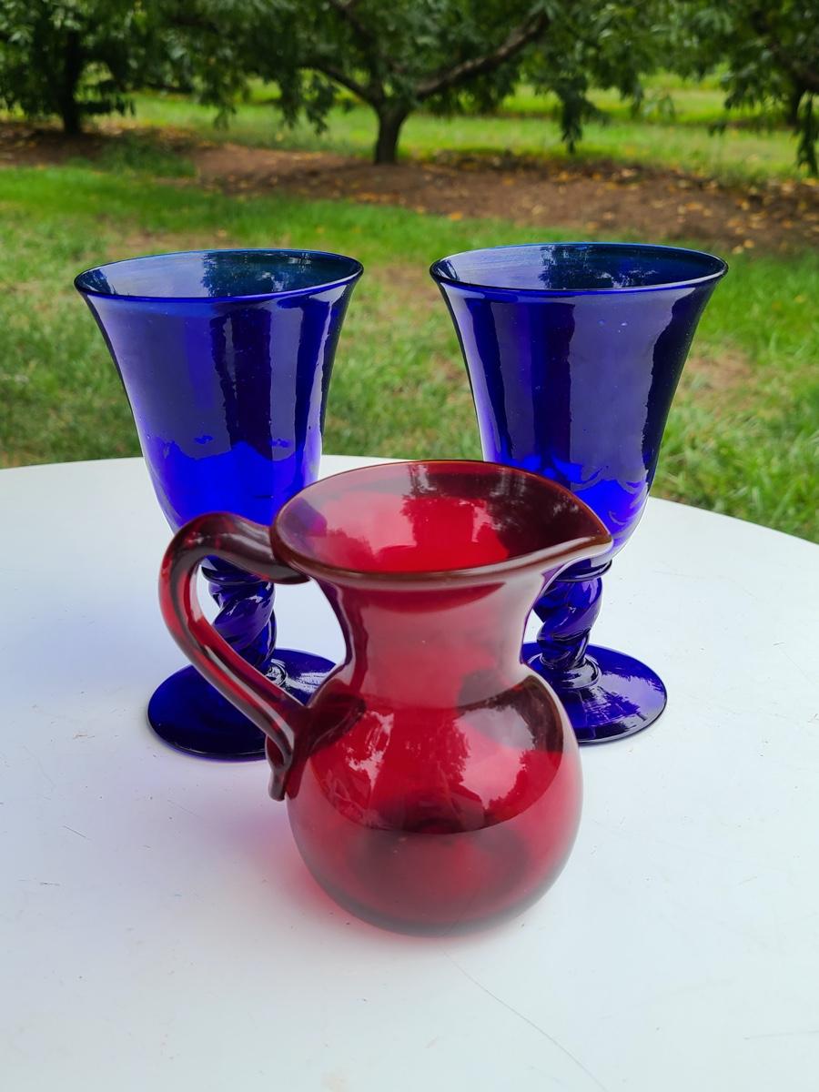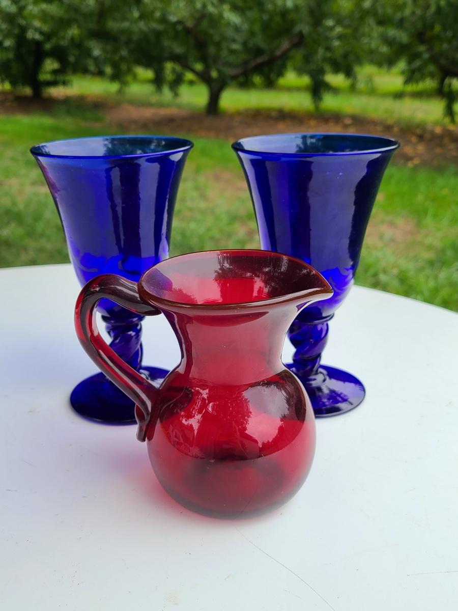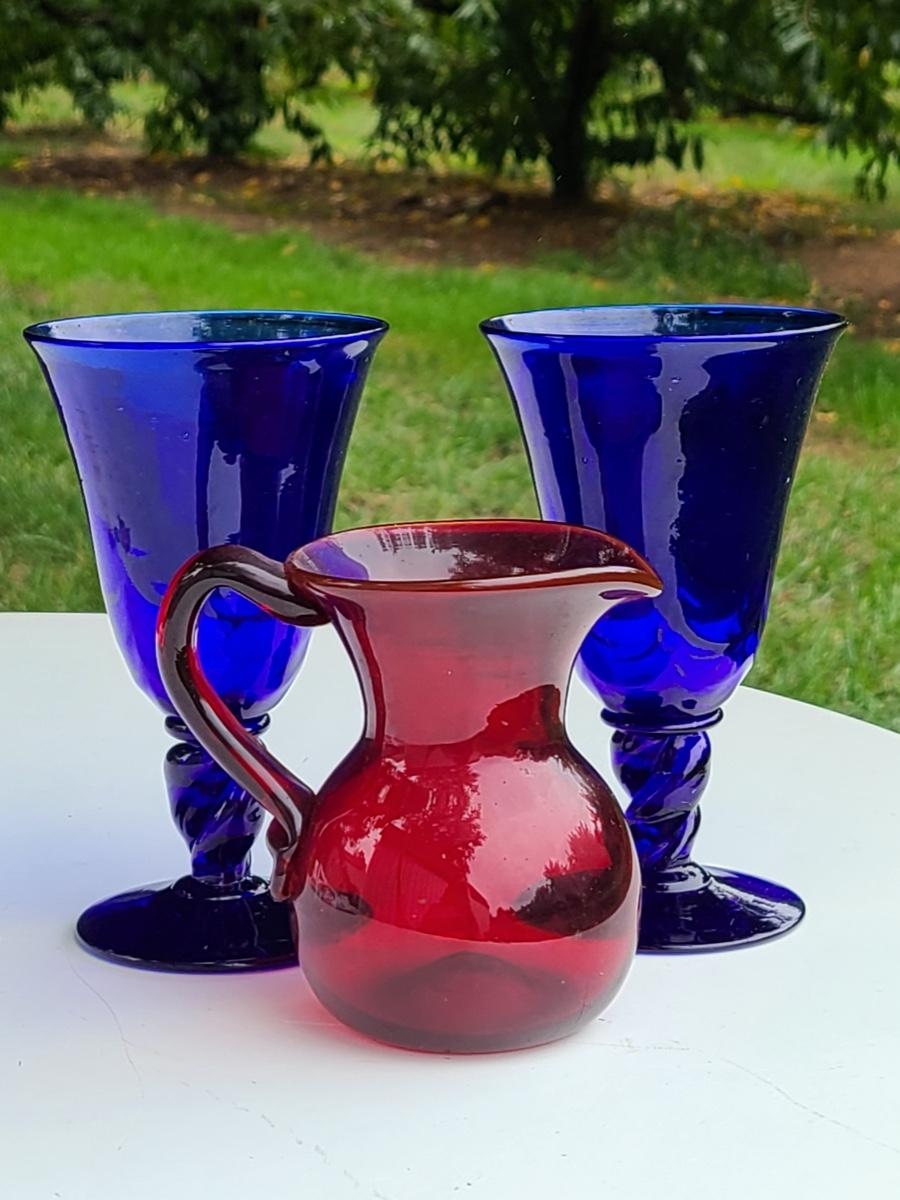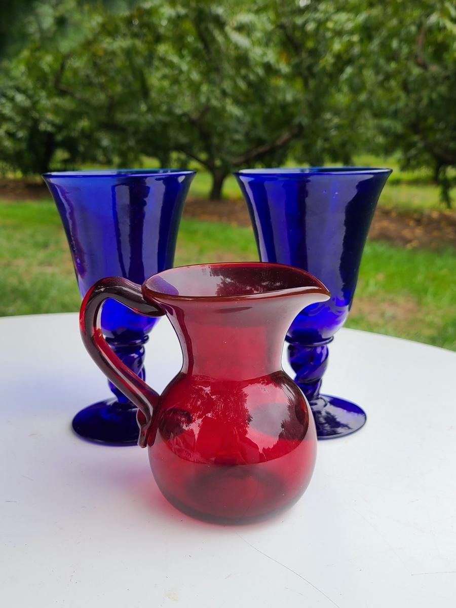 Lot 136: Handblown Glass Cobalt Blue Goblets and Small Ruby Red Pitcher