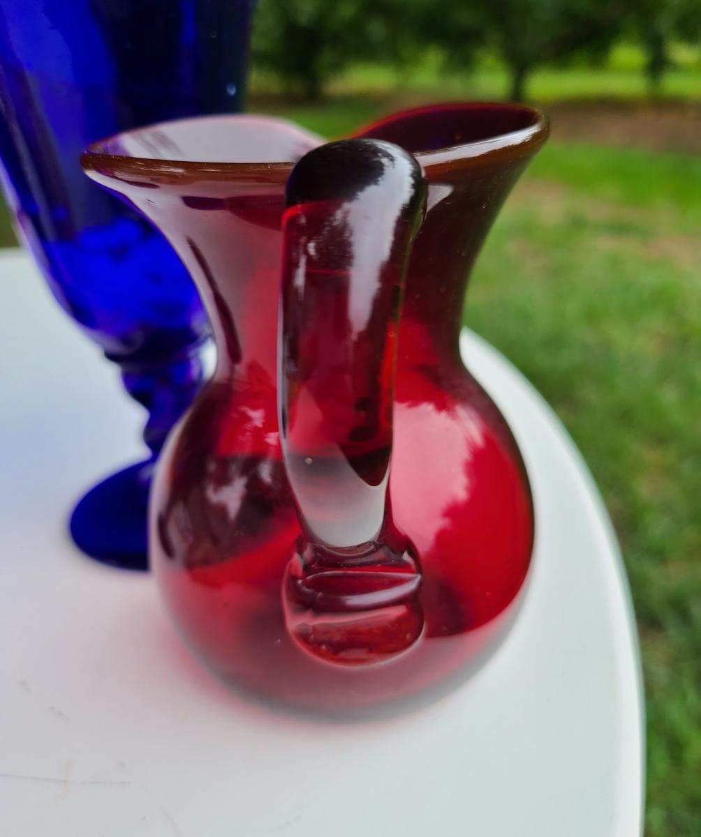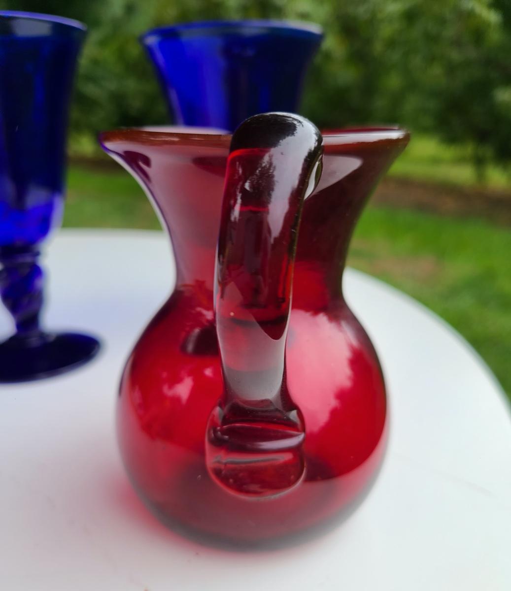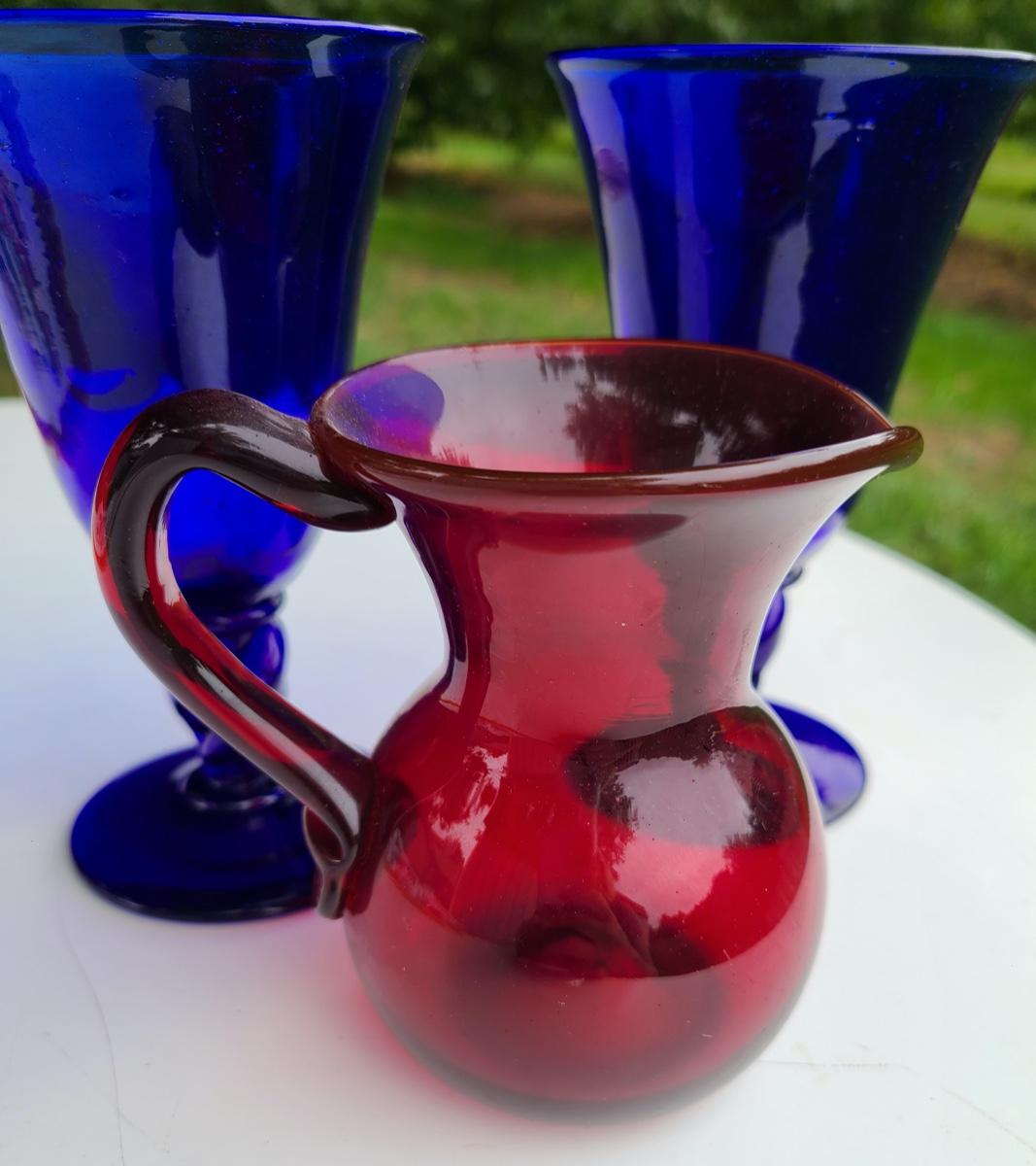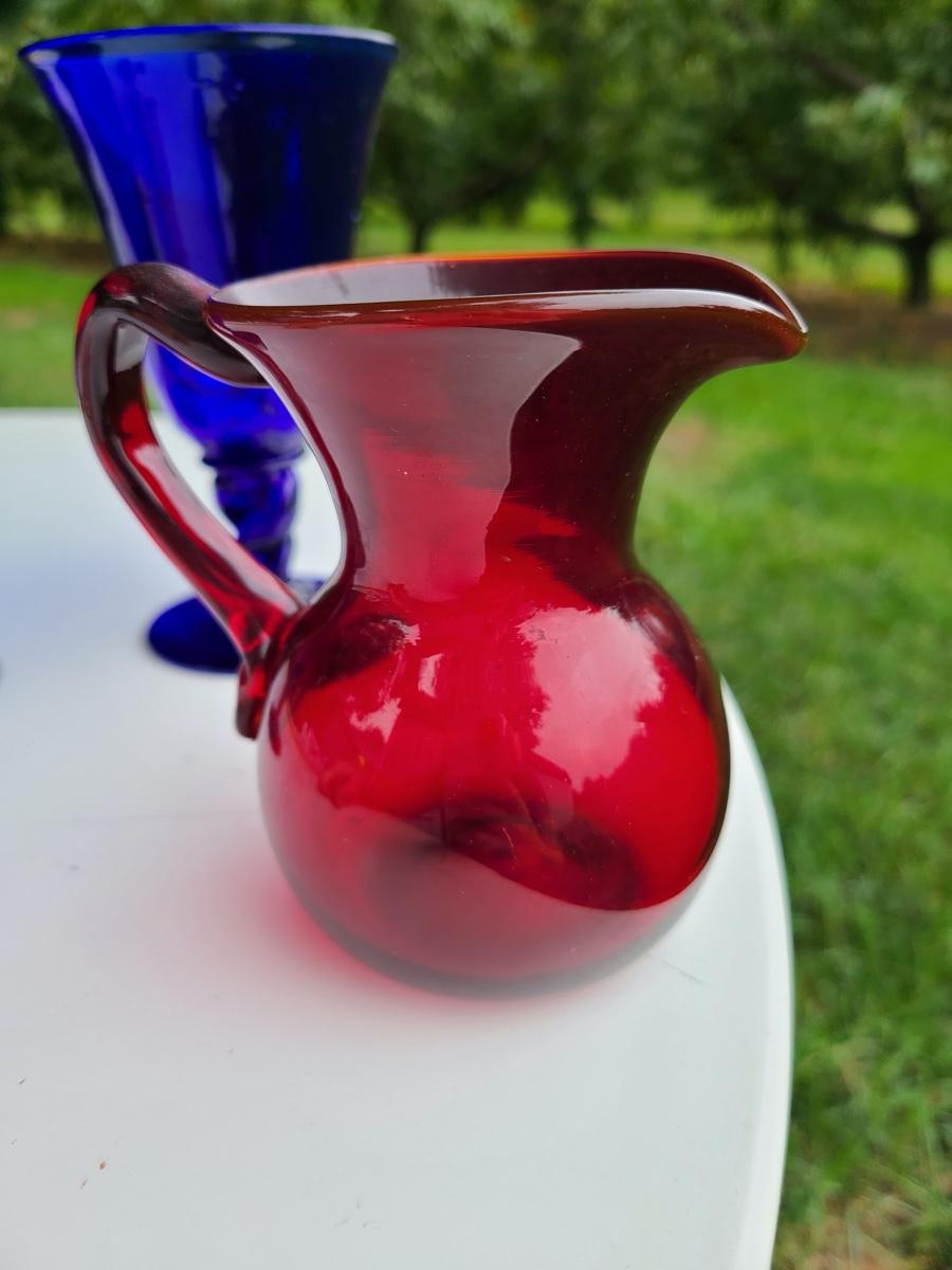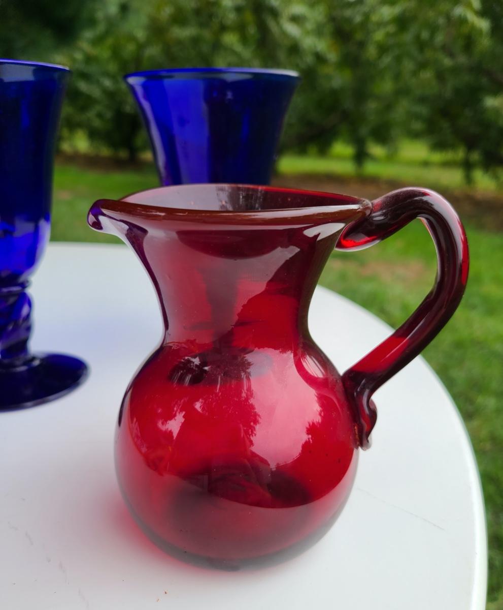 Lot 136: Handblown Glass Cobalt Blue Goblets and Small Ruby Red Pitcher