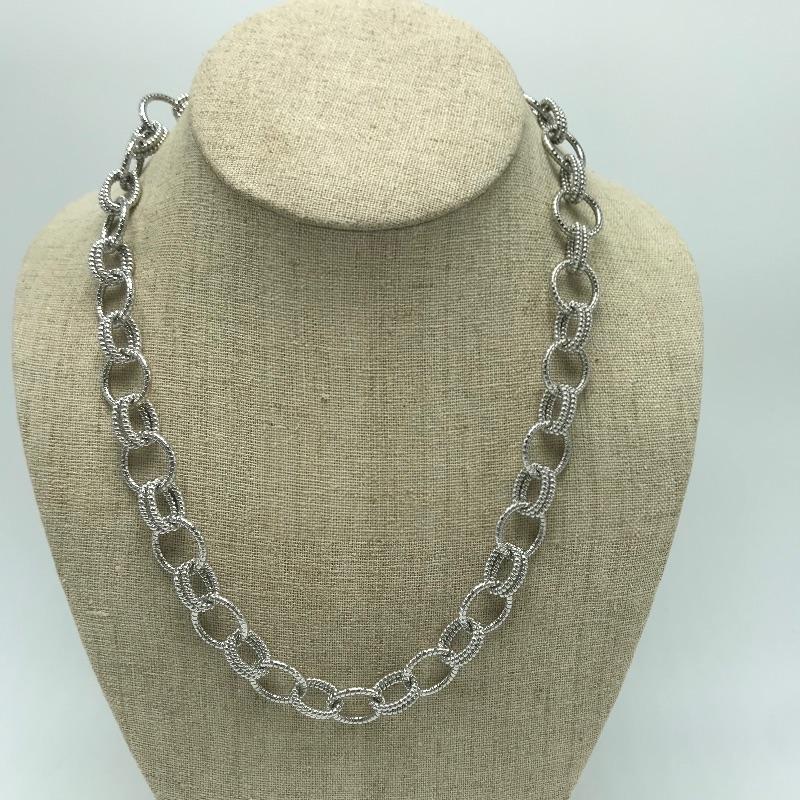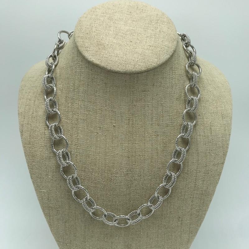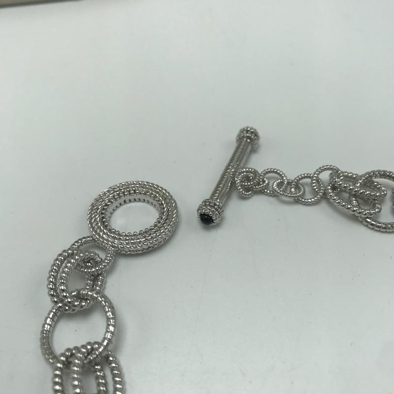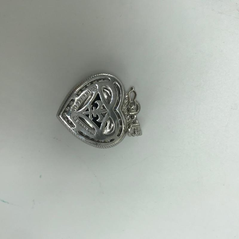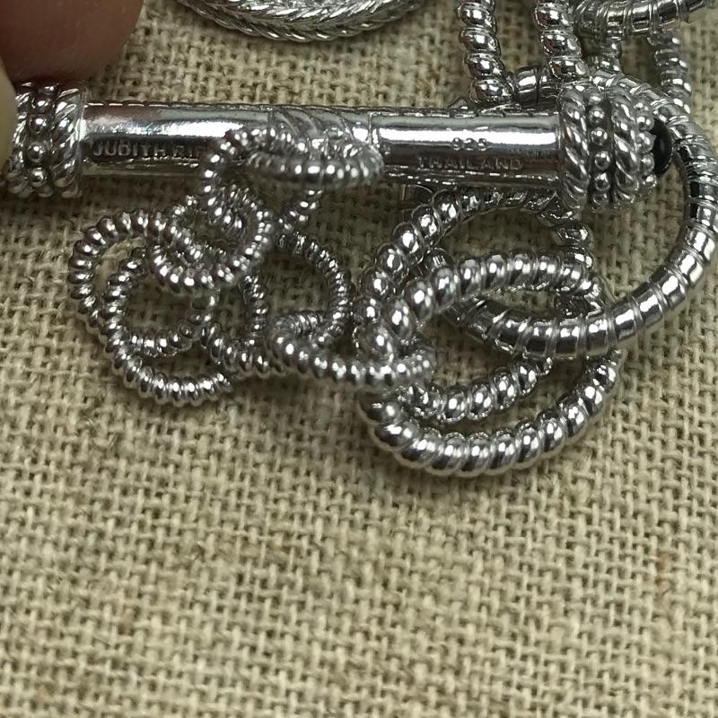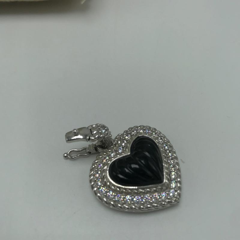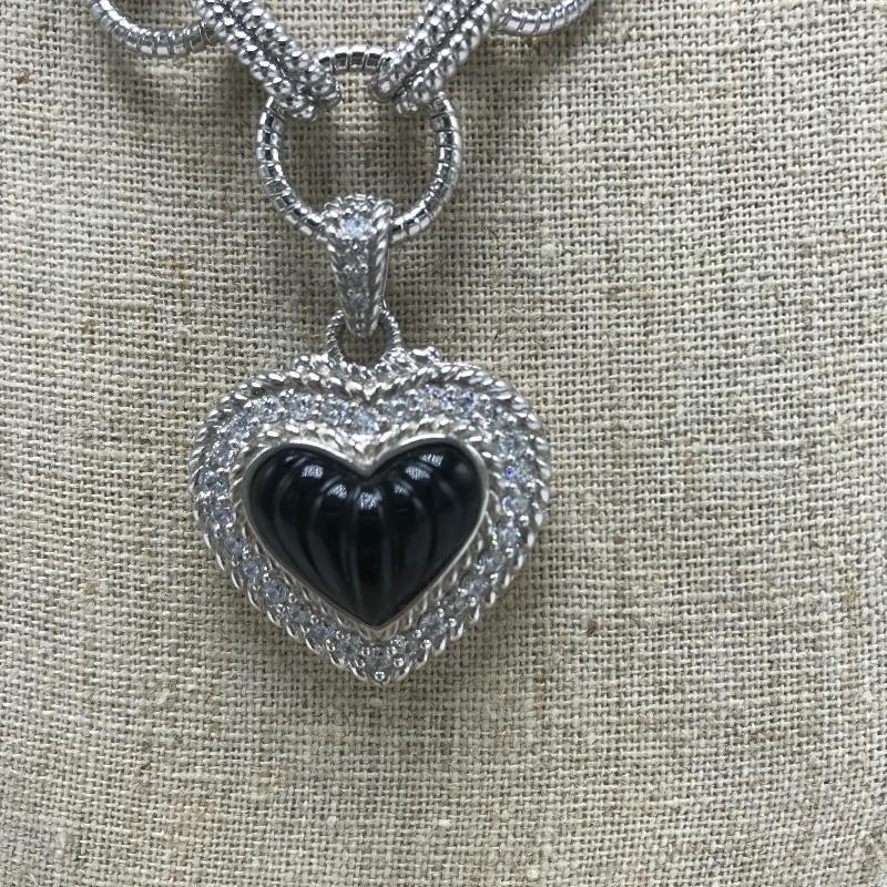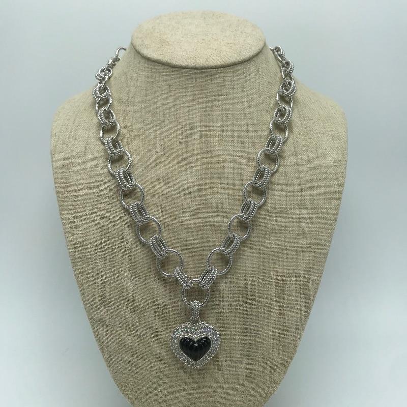 Heavy Roped chain necklace marked Judith Ripka, Thailand and 925. Necklace has two black onyx like jewels on toggle clasp. Judith Ripka Pendant matches clasp with heart shaped onyx like jewel surrounded by CZ border. Pendant has a clasp to attach easily to thicker chains or any necklace you choose. See photos.