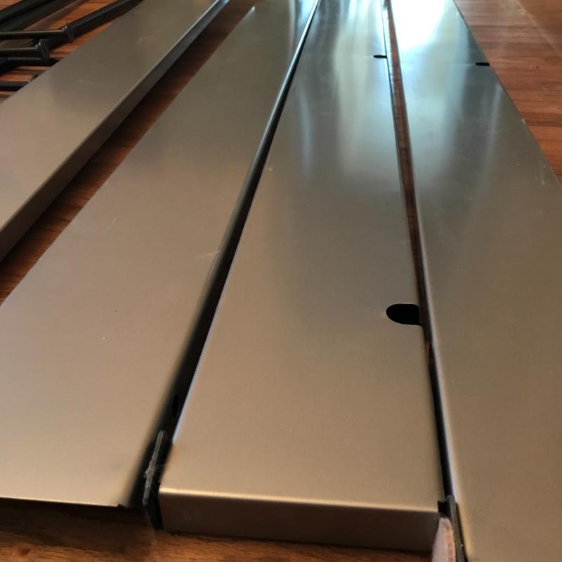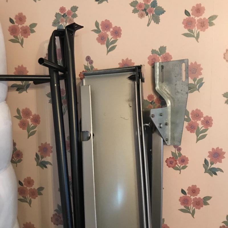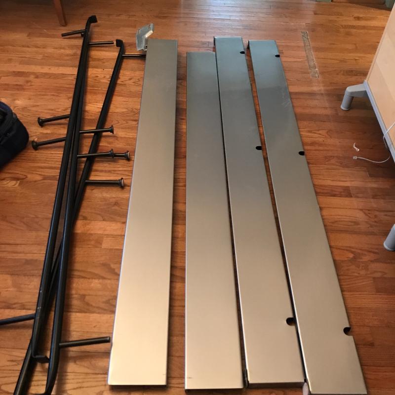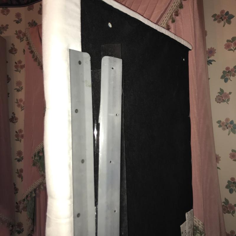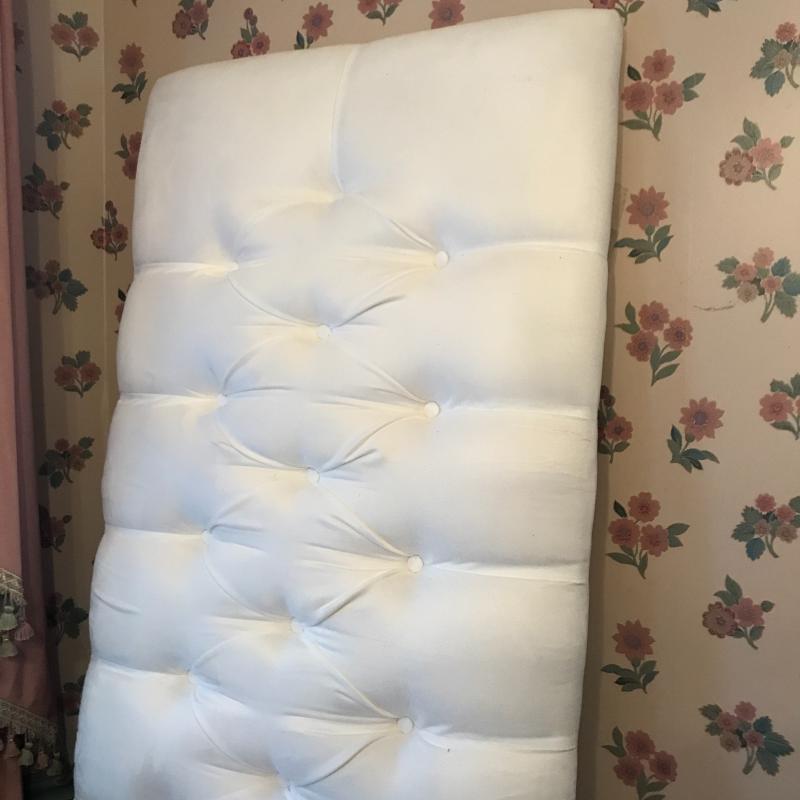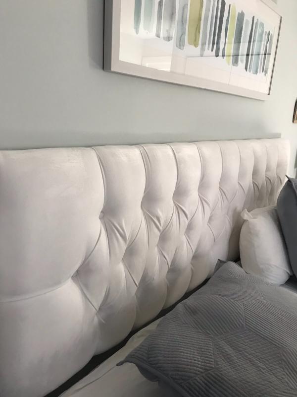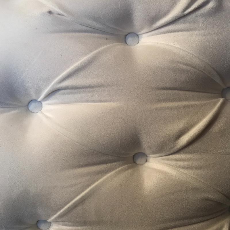 White suede-like fabric king head board. Good condition. No rips or stains. 78”l x 28”w. Also includes king bed frame with silver side panels that make it look like a platform bed. One side panel has a scratch. See pics. No Shipping. Local pick up in Flat Rock, NC.