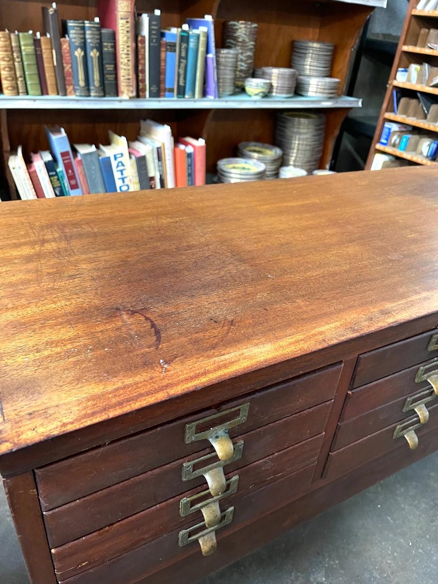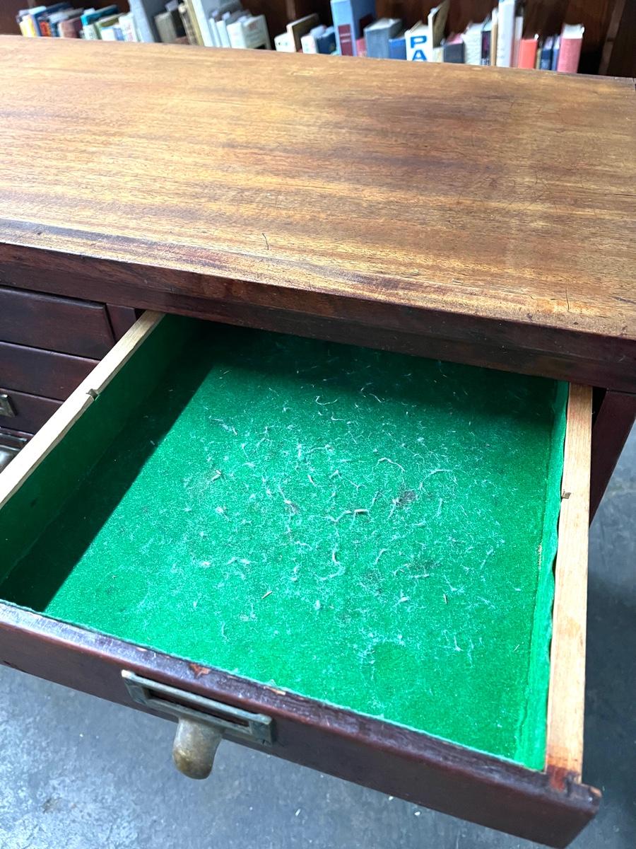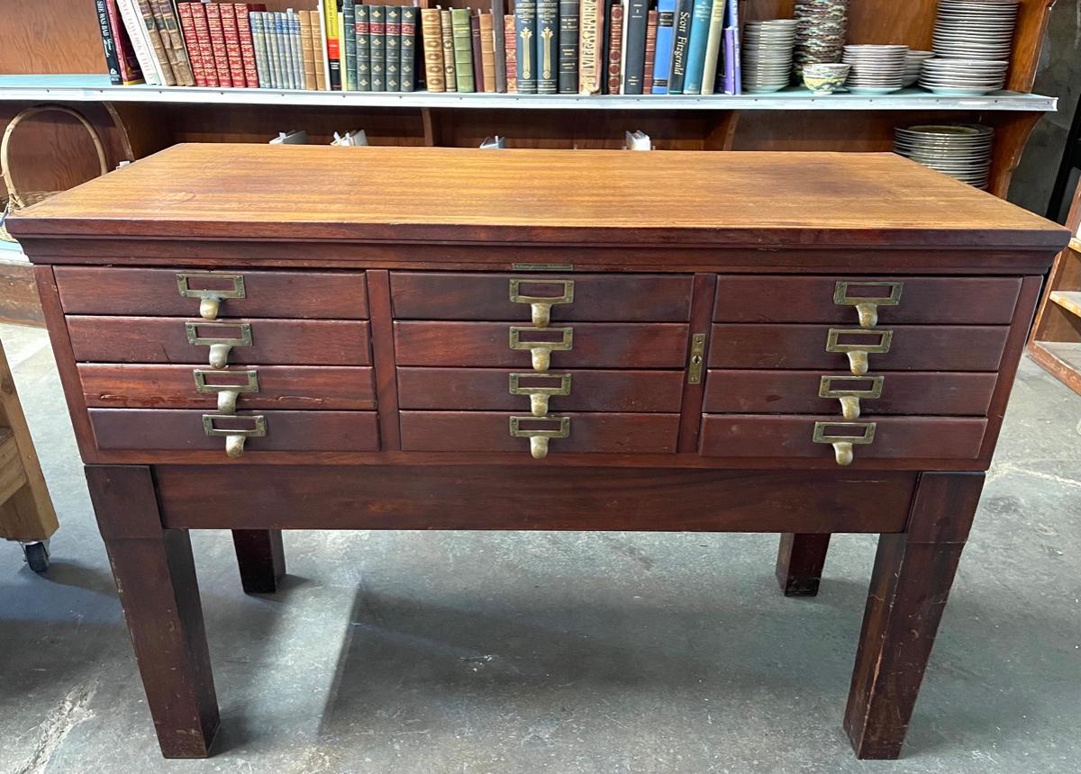 LOT 136 - Library Bureau Sole Maker Cabinet. David kept his flatware in this cabinet in the dining room. It features 12 drawers, each one with a green felt lining. It consists of two pieces, the drawer unit and the base. Please view in person to see the condition of this item. This item is part of the David-Pleydell-Bouverie Estate at Bouverie Ranch in Glen Ellen. This item can be viewed at our Green + Cate Showroom in Sebastopol from July 15th - July 18th between the hours of 9am-5pm. For the benefit of the Bouverie Preserve of Audubon Canyon Ranch.