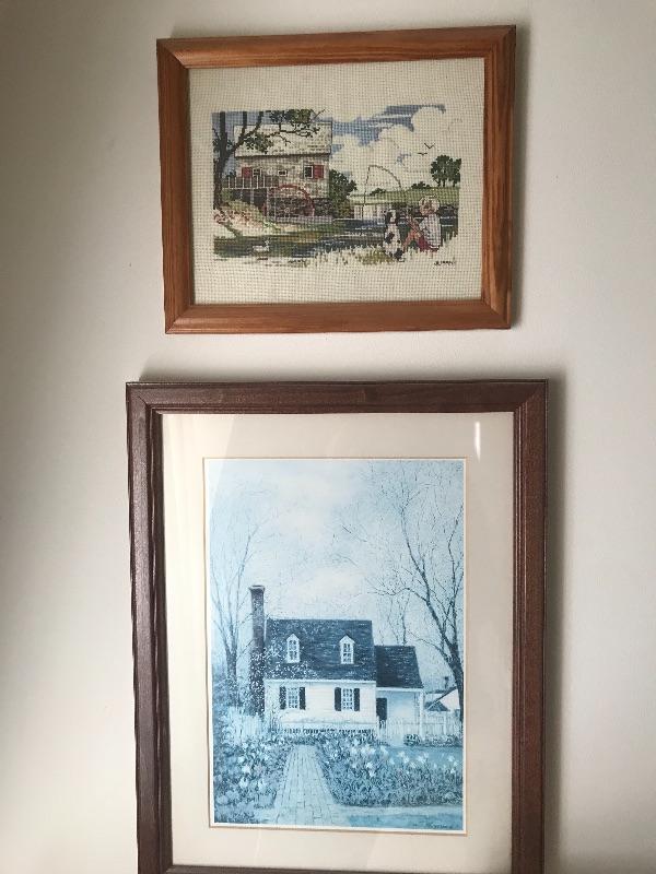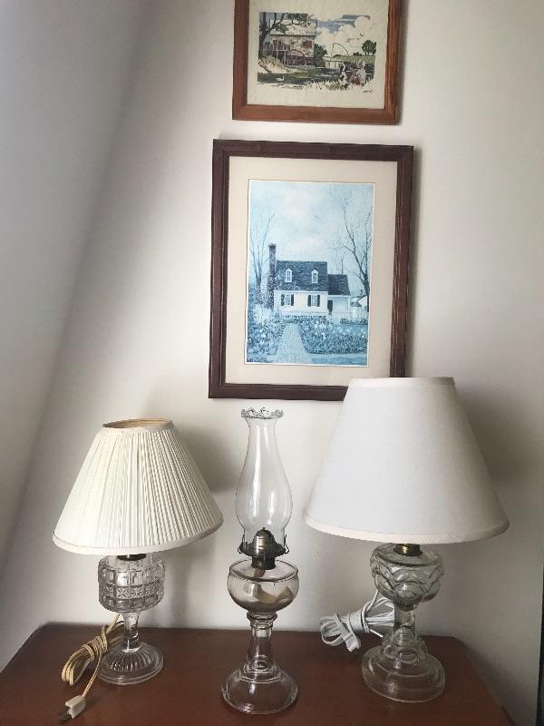 Lot of 3 Oil lamps one house print and one cross stitch