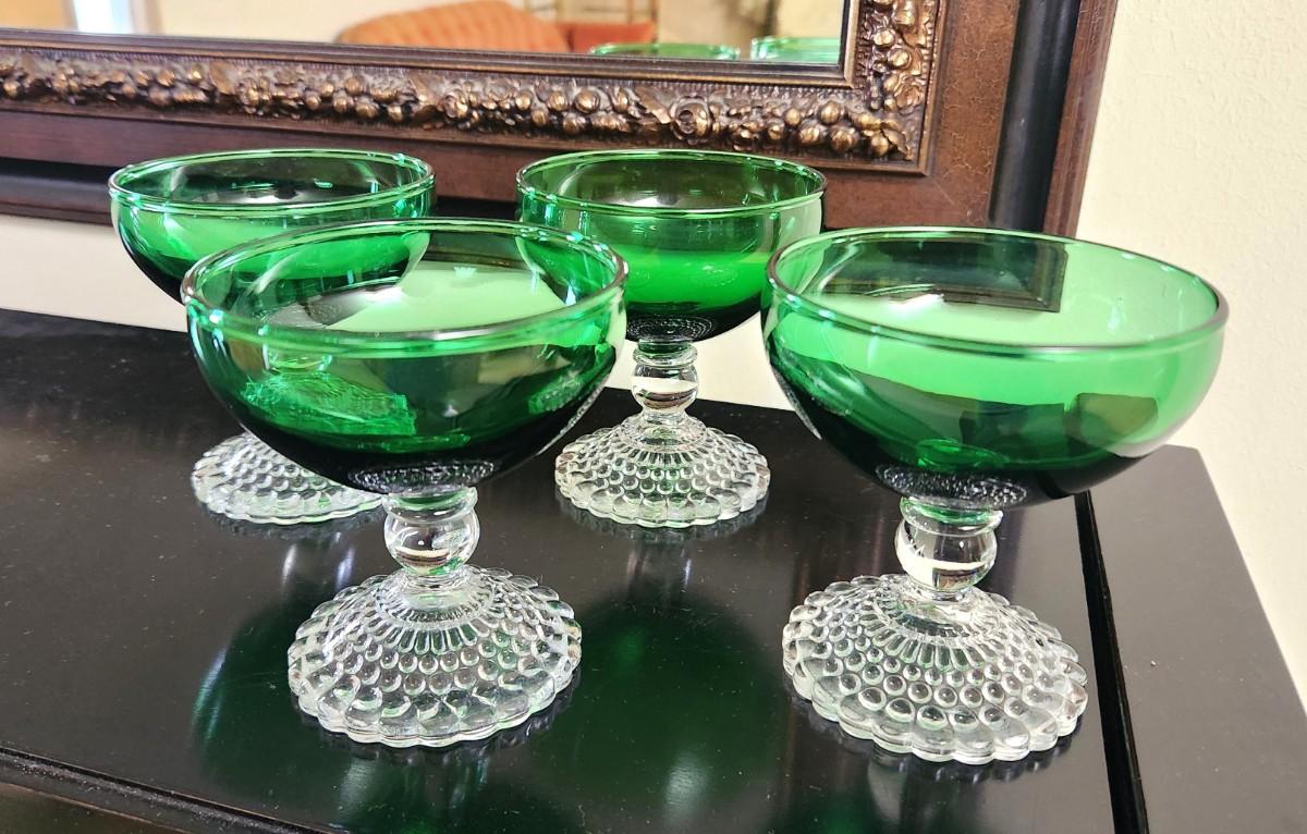 Lot of 4 - vintage Anchor Hocking Emerald Green Bubble Feet Dessert/Sherbet dishes - each 4" tall. All in good condition.