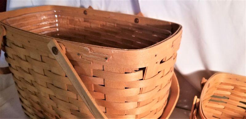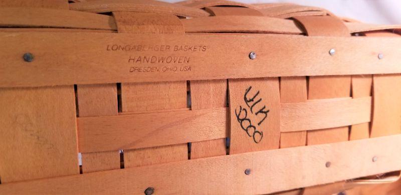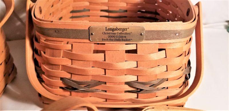 The once revered Longaberger basket company went out of business several years ago, and they are not all that common down here. This is a lot of 5 - most are signed on the bottom. The large one measures 15.75" across, 11" tall, and 9" deep. It has a "hinkey" on the rim (see photos). The Xmas 2000 basket is 6" tall, and 8.25" x 9". The oblong basket is 5.75" x 12", 4" tall. The small basket with handle is 6" x 4" and 2" tall. The smallest is 3.25" x 4.75", and 2" tall. Nice lot.