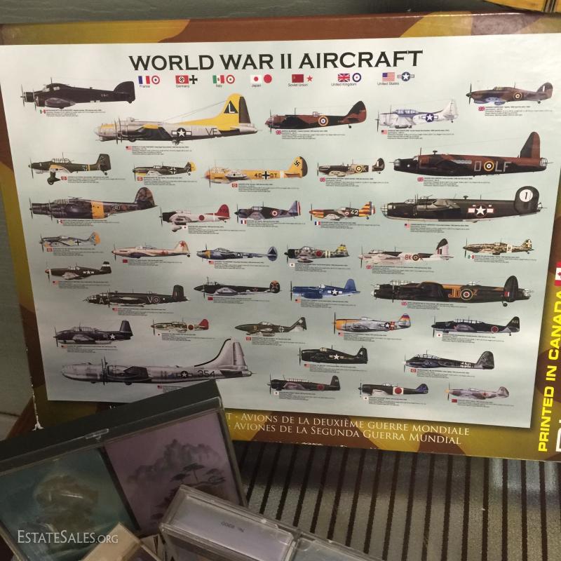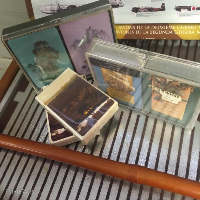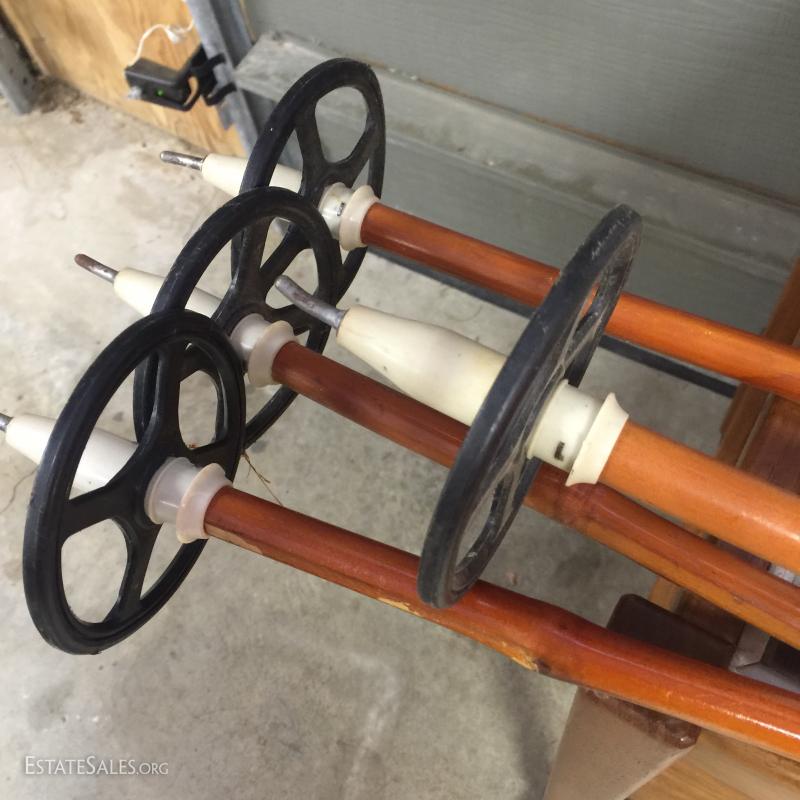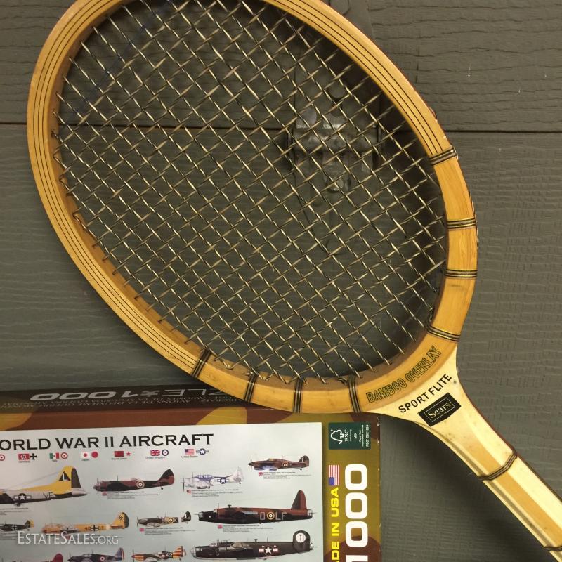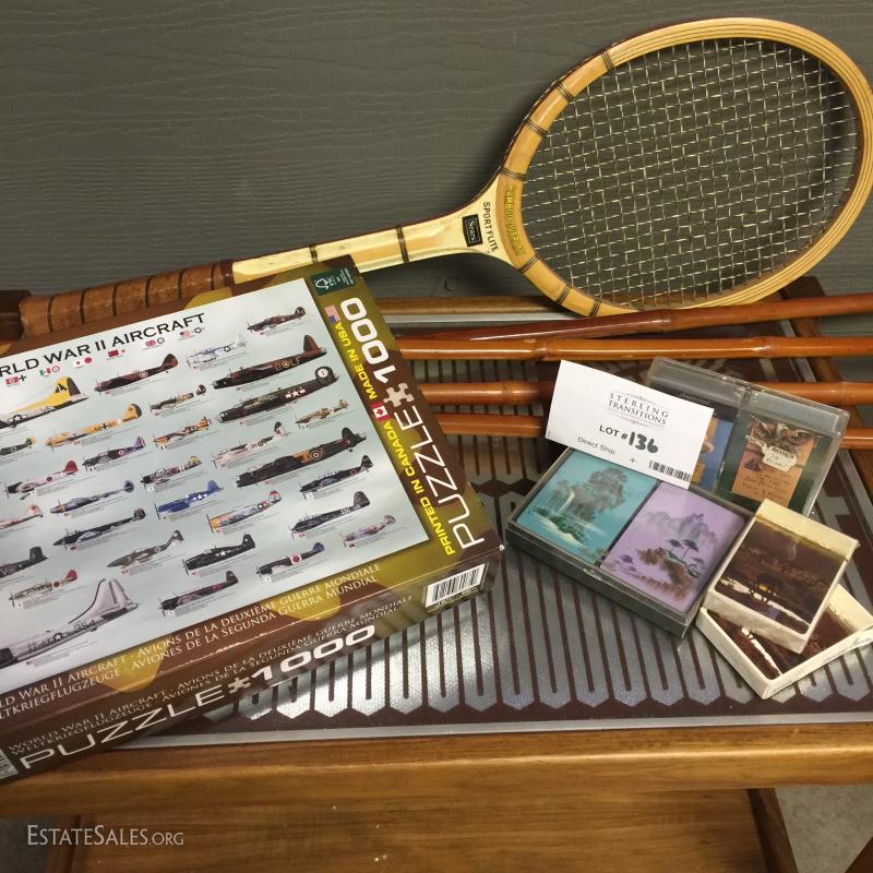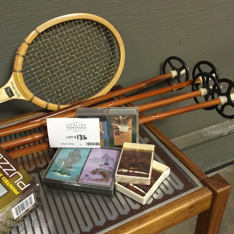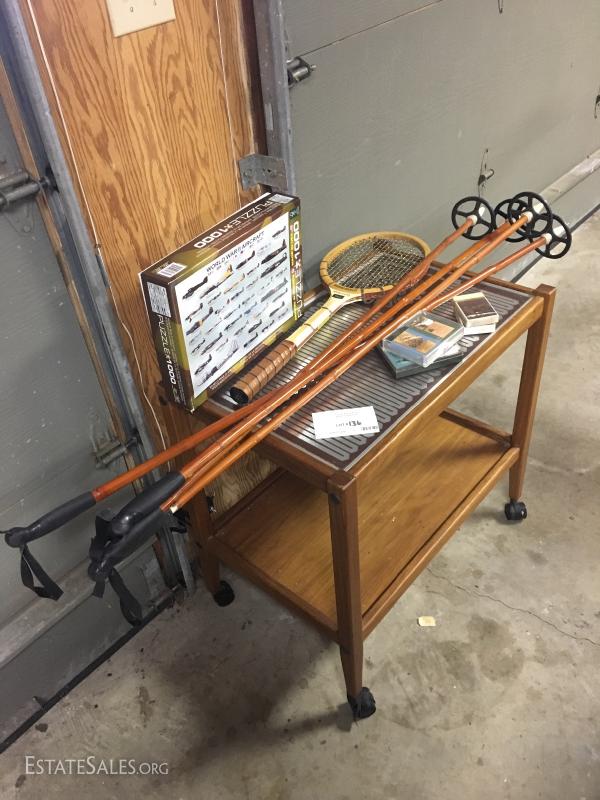 Vintage tennis racket, Two pairs vintage bamboo Ski/trek poles, playing cards, Airplane puzzle. Also includes vintage rolling cart with plate warmer inset. Missing cord. See photos for details