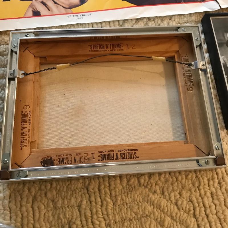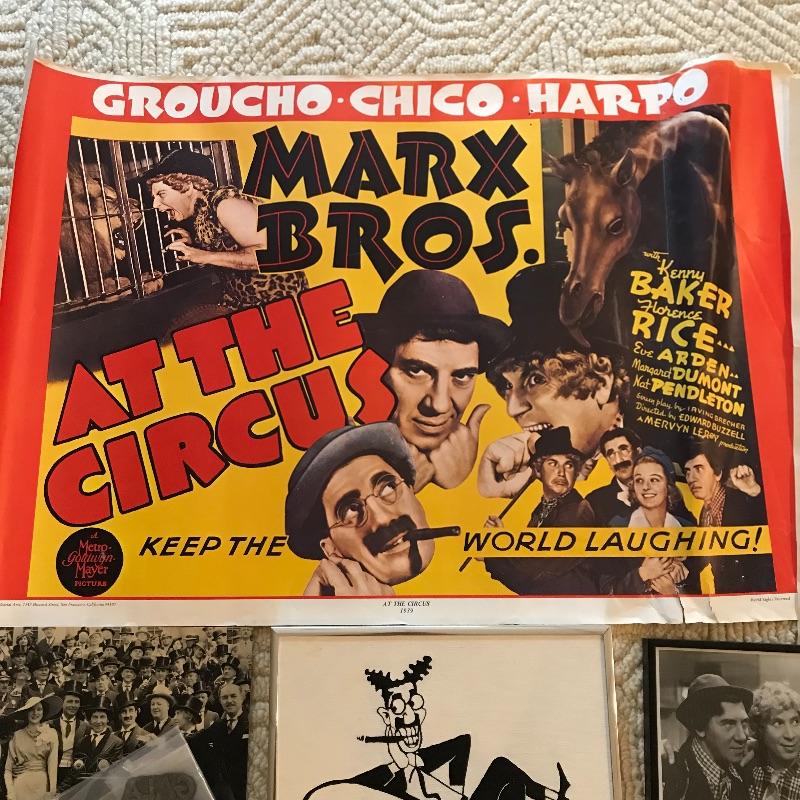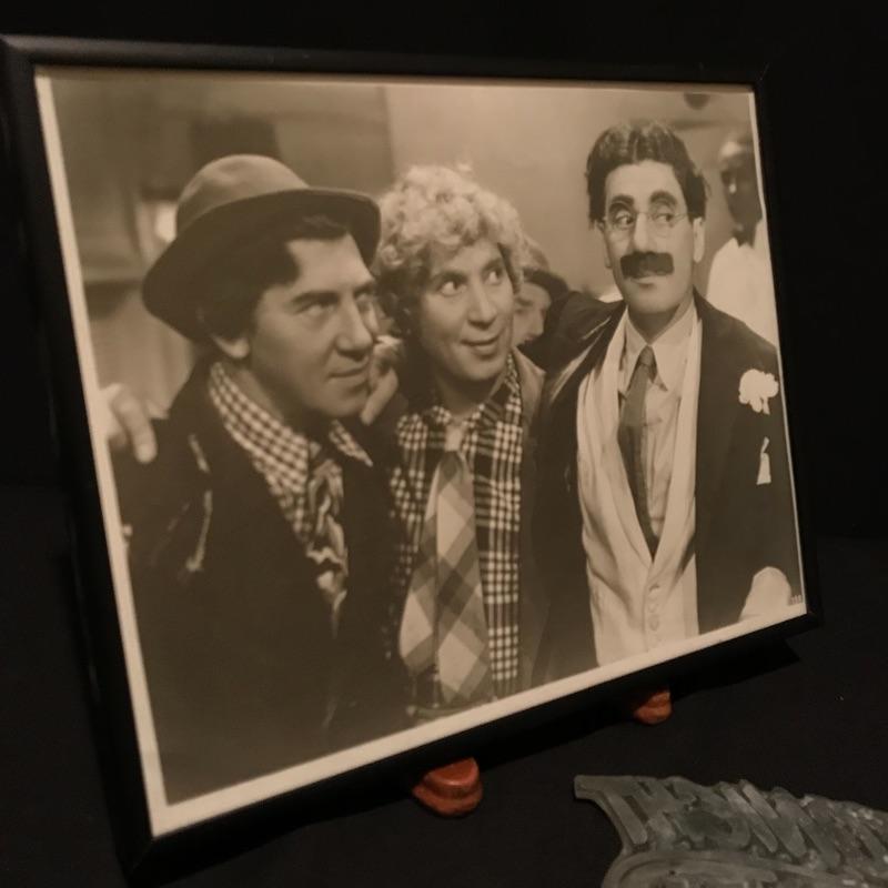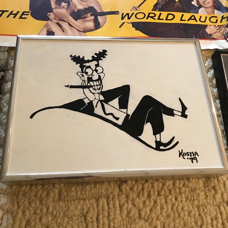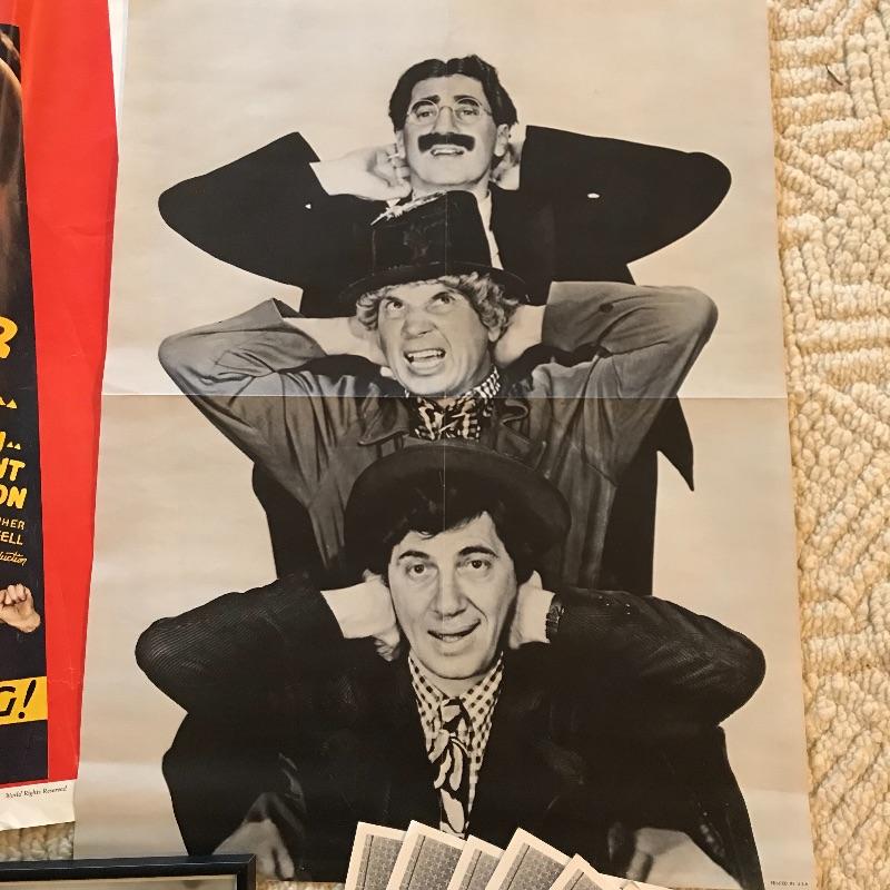 This laugh-filled collection has some rare finds! Check out the metal print block from “A Night in Casablanca”. It is in great shape and measures approximately 8” x 11”. There are two posters with the wacky trio(both have some bends and creases, one has small rips in the lower right corner)., Six copies of Flywheel Time Co Groucho photos. a fun framed oil painting signed “Kosma “˜79” and more! The black metal framed photo is approximately 10.25” x 8.25”. Shipping available.