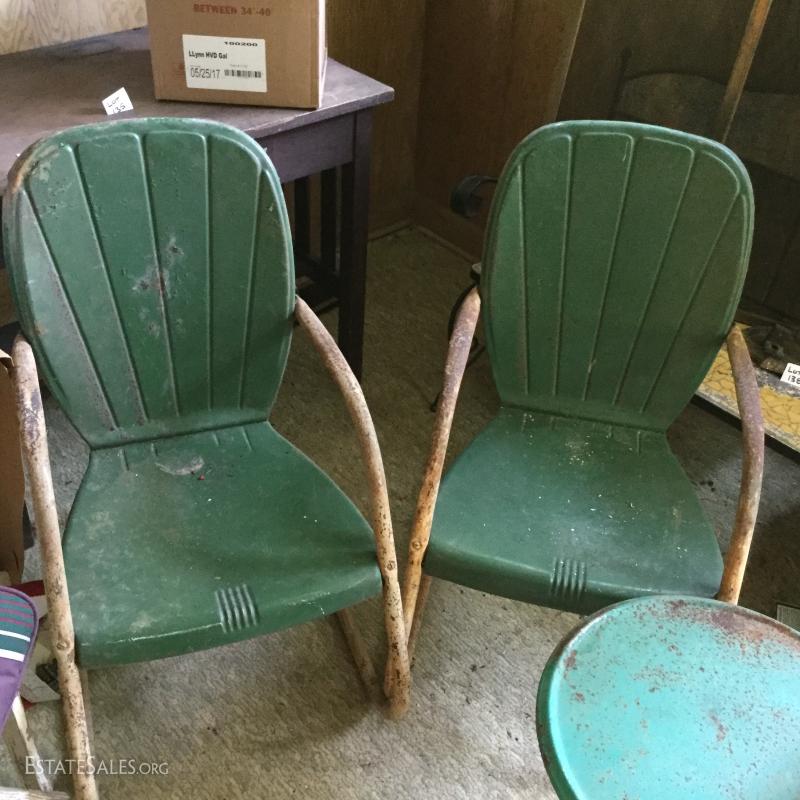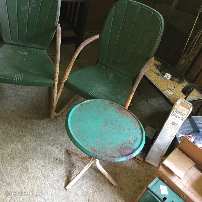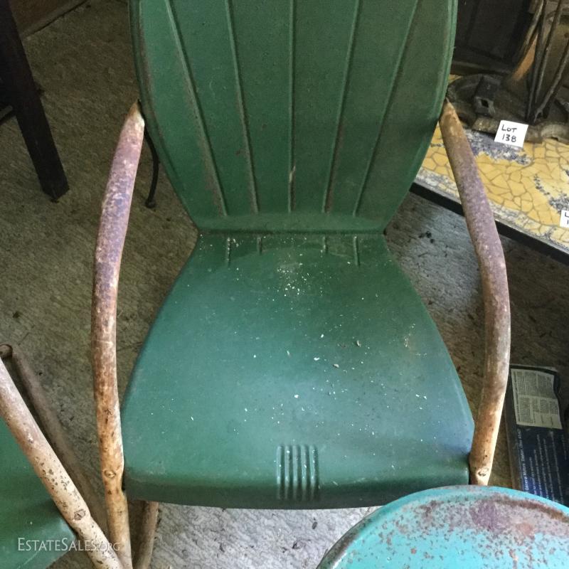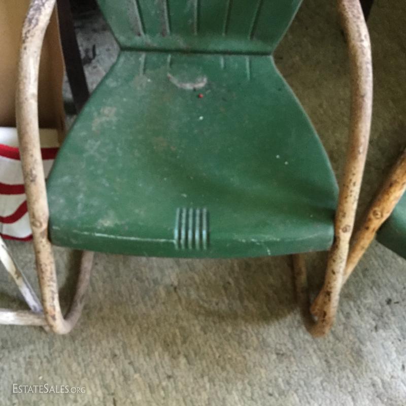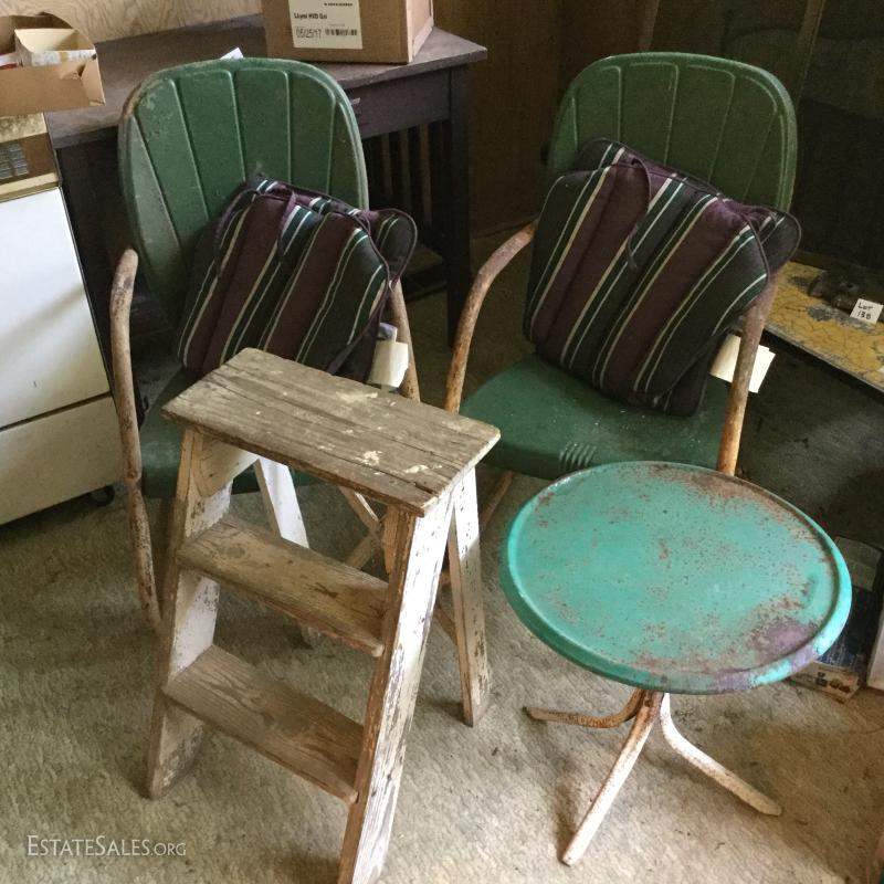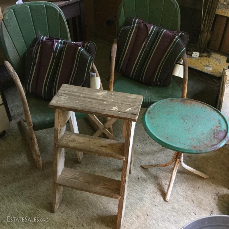 Vintage Green Metal and White rocker style chairs and low table. Rust and some repair to table needed attaching top to base. Cushions in photo may or may not work for these chairs. Step Ladder is solid and does not fold up, likely handmade. Measurements chairs 20.5"l x 27"w x 34.5"h. No shipping Local pick up in Saluda, NC