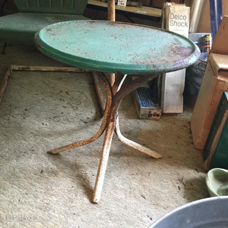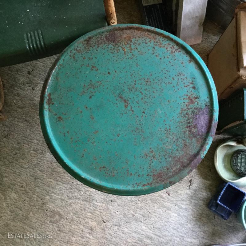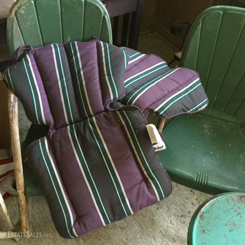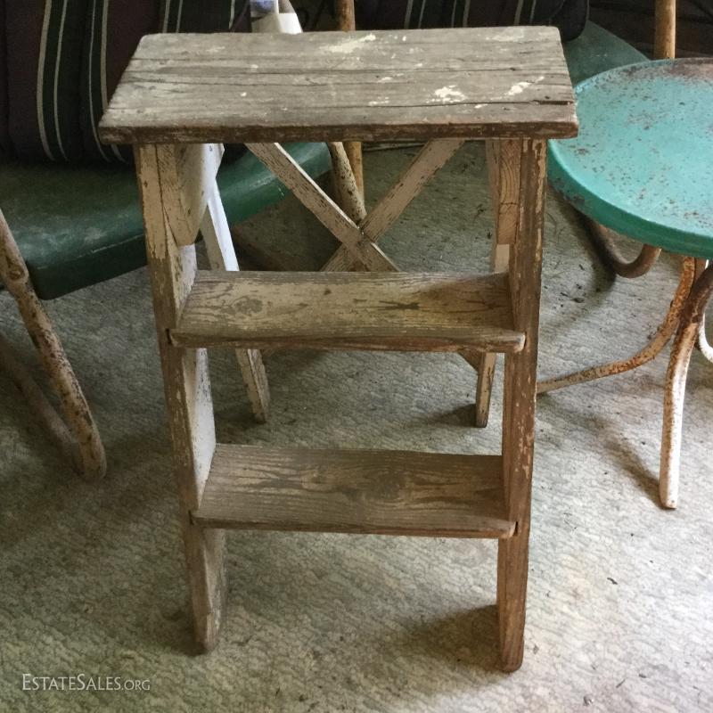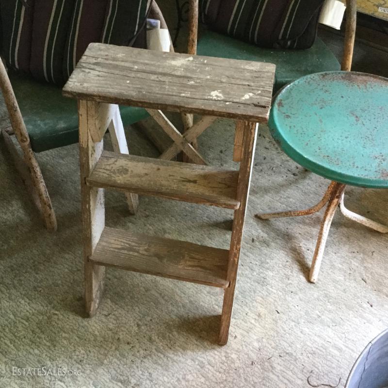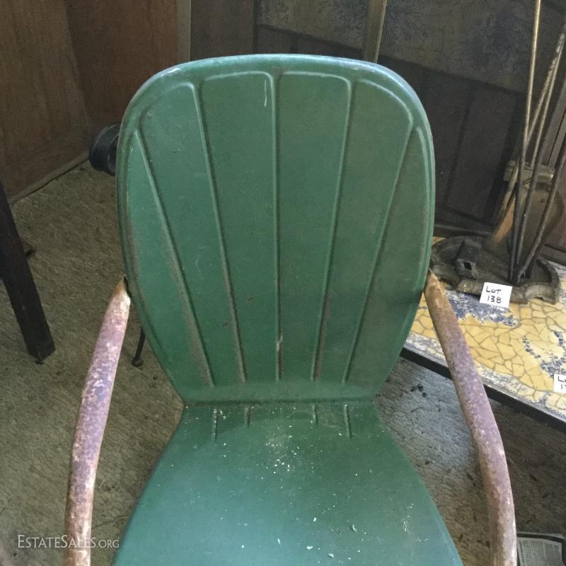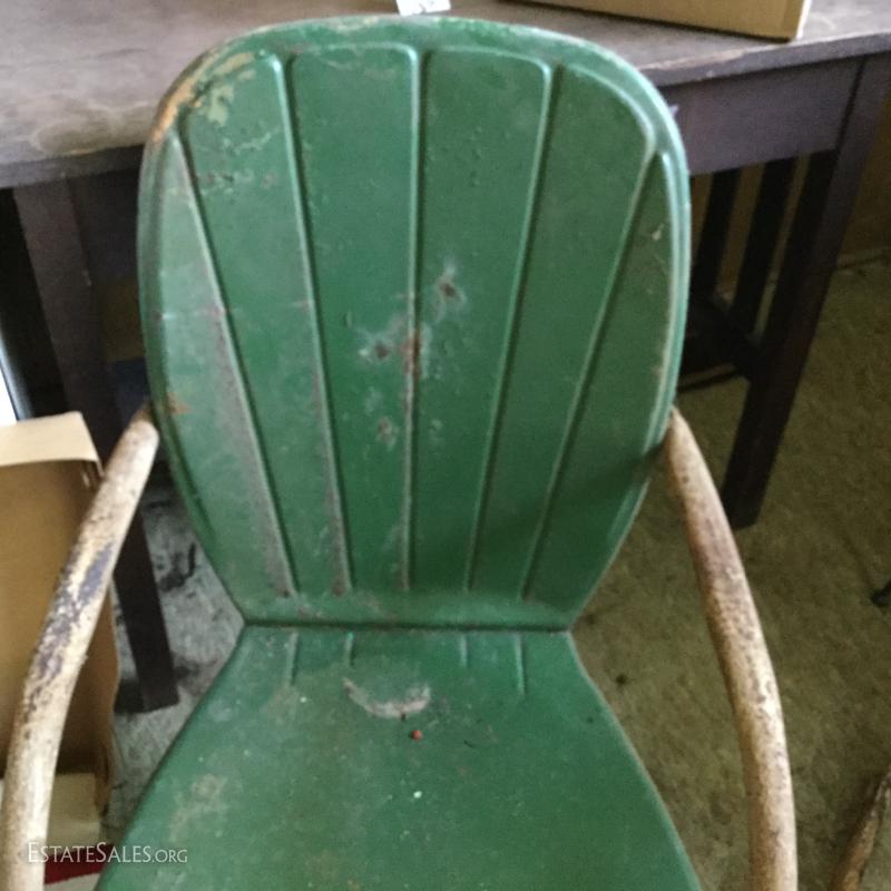 Vintage Green Metal and White rocker style chairs and low table. Rust and some repair to table needed attaching top to base. Cushions in photo may or may not work for these chairs. Step Ladder is solid and does not fold up, likely handmade. Measurements chairs 20.5"l x 27"w x 34.5"h. No shipping Local pick up in Saluda, NC