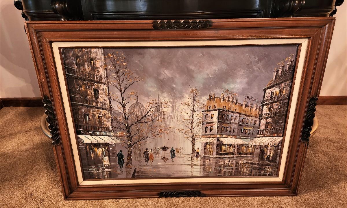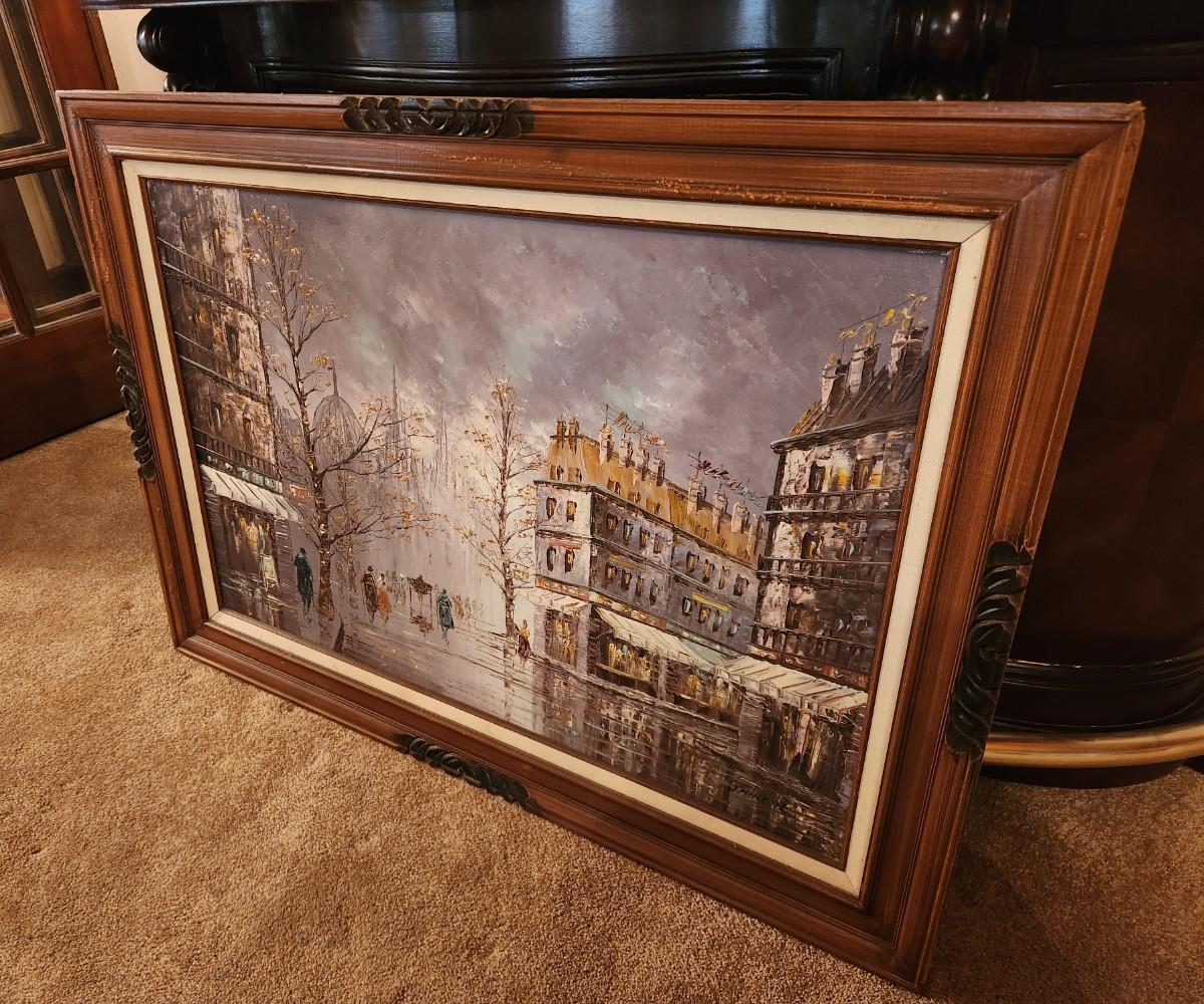 J. Hinton was a street artist in Paris who sold atmospheric Parisian scenes to American vacationers in the 1950's and 60's. We have offered a couple of his paintings in the past - they are easily recognizable because of his unique style. Classic Parisian street scene example here. Measures 21" tall, 44" across. Good vintage condition.