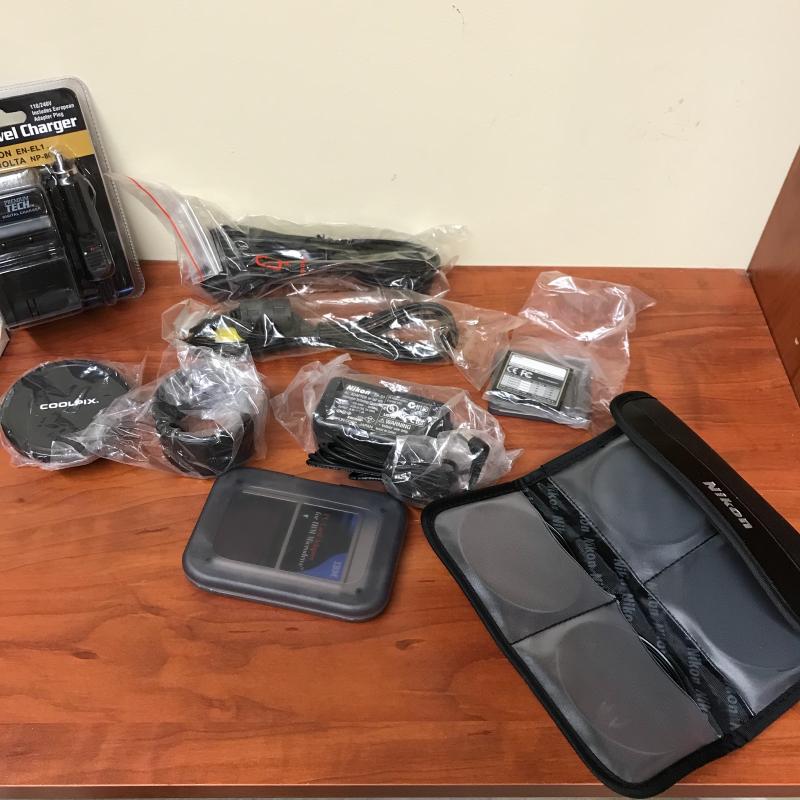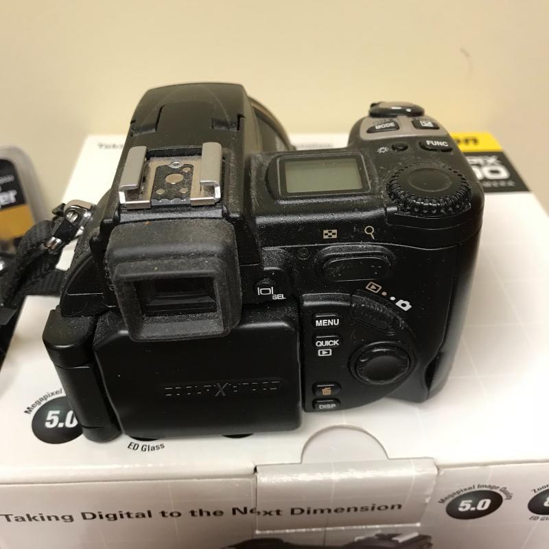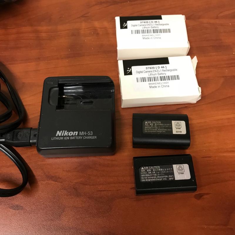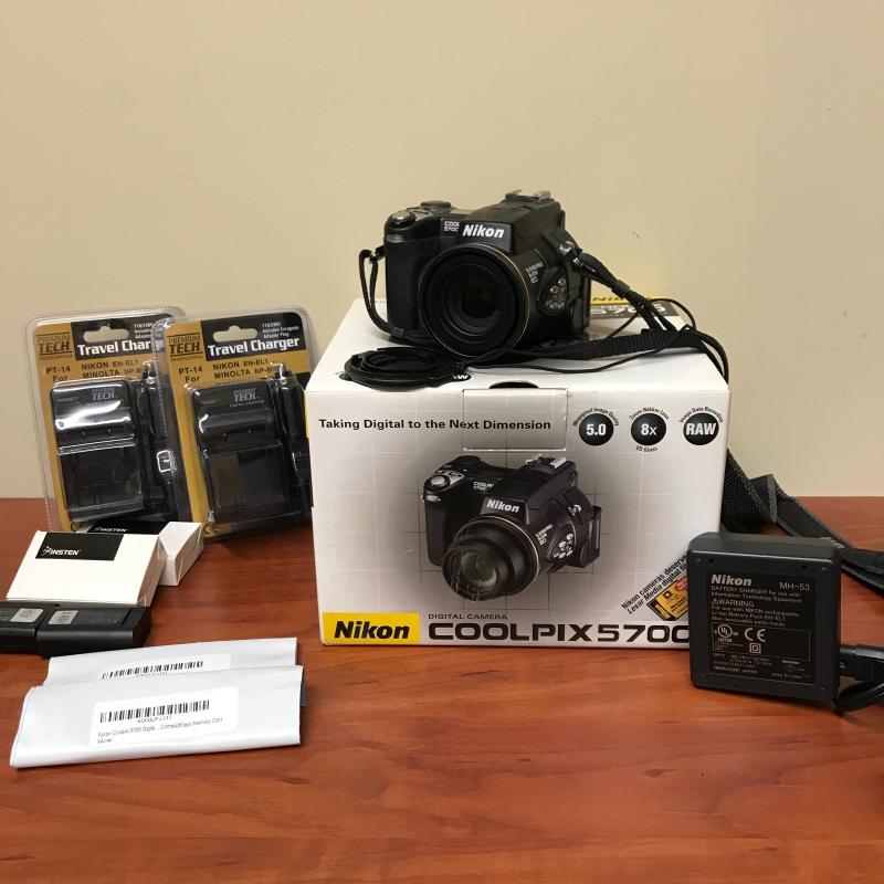 Nikon COOLPIX 5700 with some components still packaged in original box. Camera is accompanied by two travel lithium battery chargers (new in packaging) one wall charger with a total of four rechargeable lithium batteries, two appear never used. COOLPIX also has two extra new in package memory cards. Shipping available.