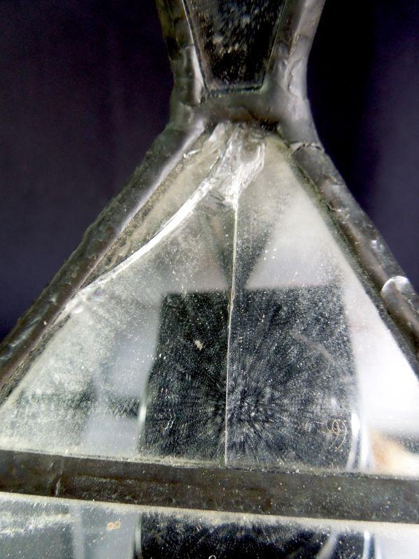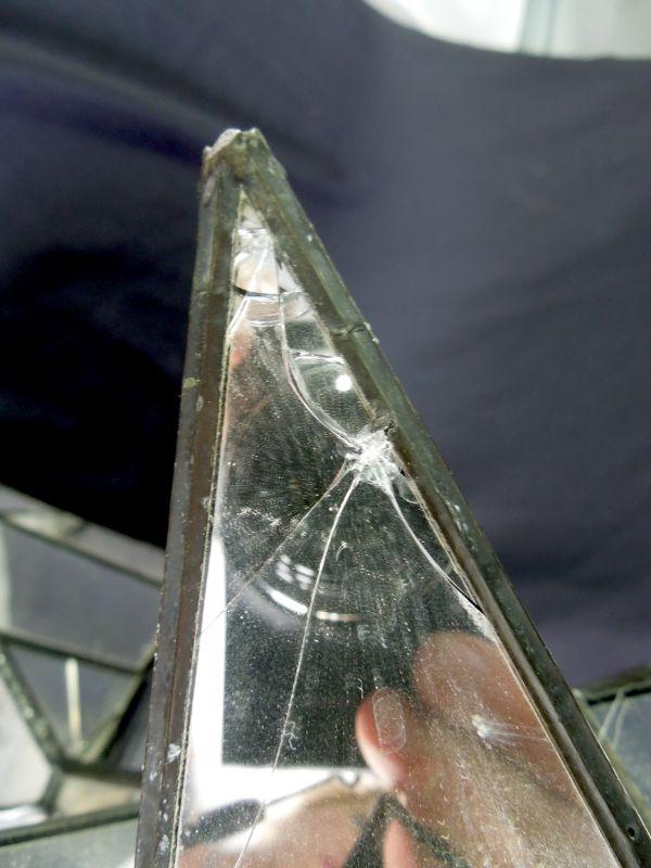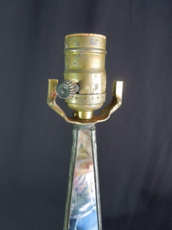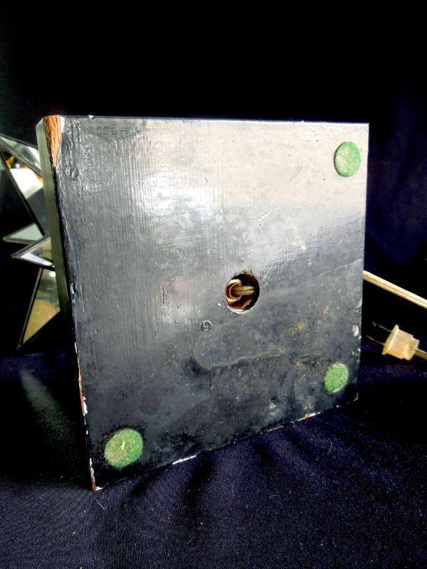 These funky lamps have welded metal seams holding the mirrored panels together. 26" H with 7" x 7" painted wood bases. Untested. Cords appear to be in good condition. Twp panels have cracks, but they do not stand out. Needs cleaning. This is what I call Moravian Star pattern with obelisque. Unsigned or dated. Guessing 1980's.