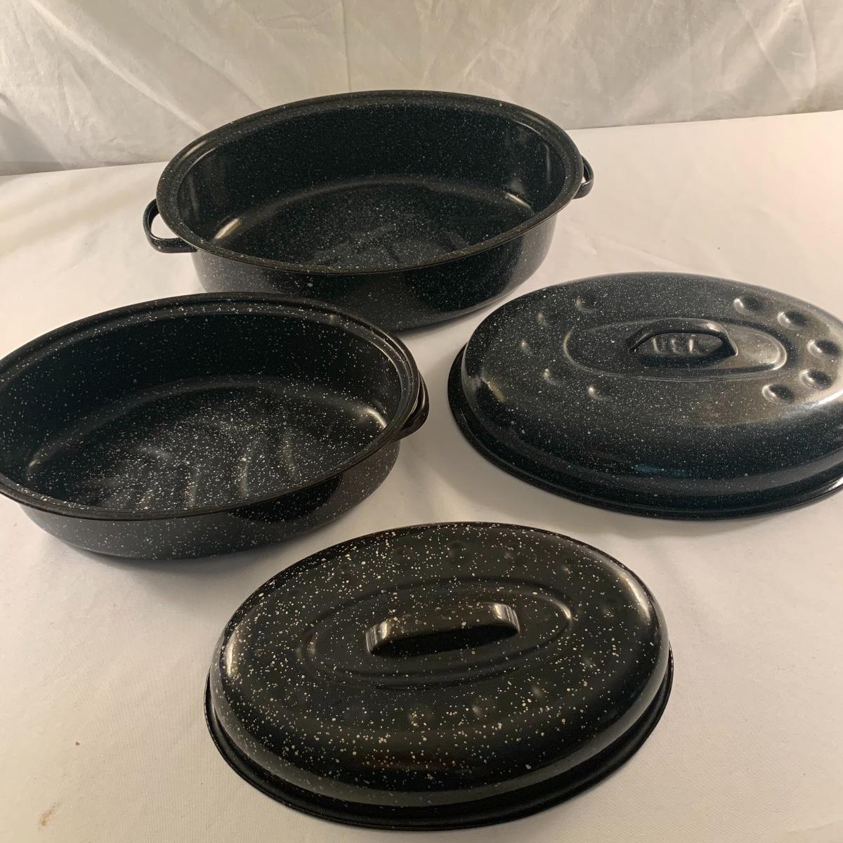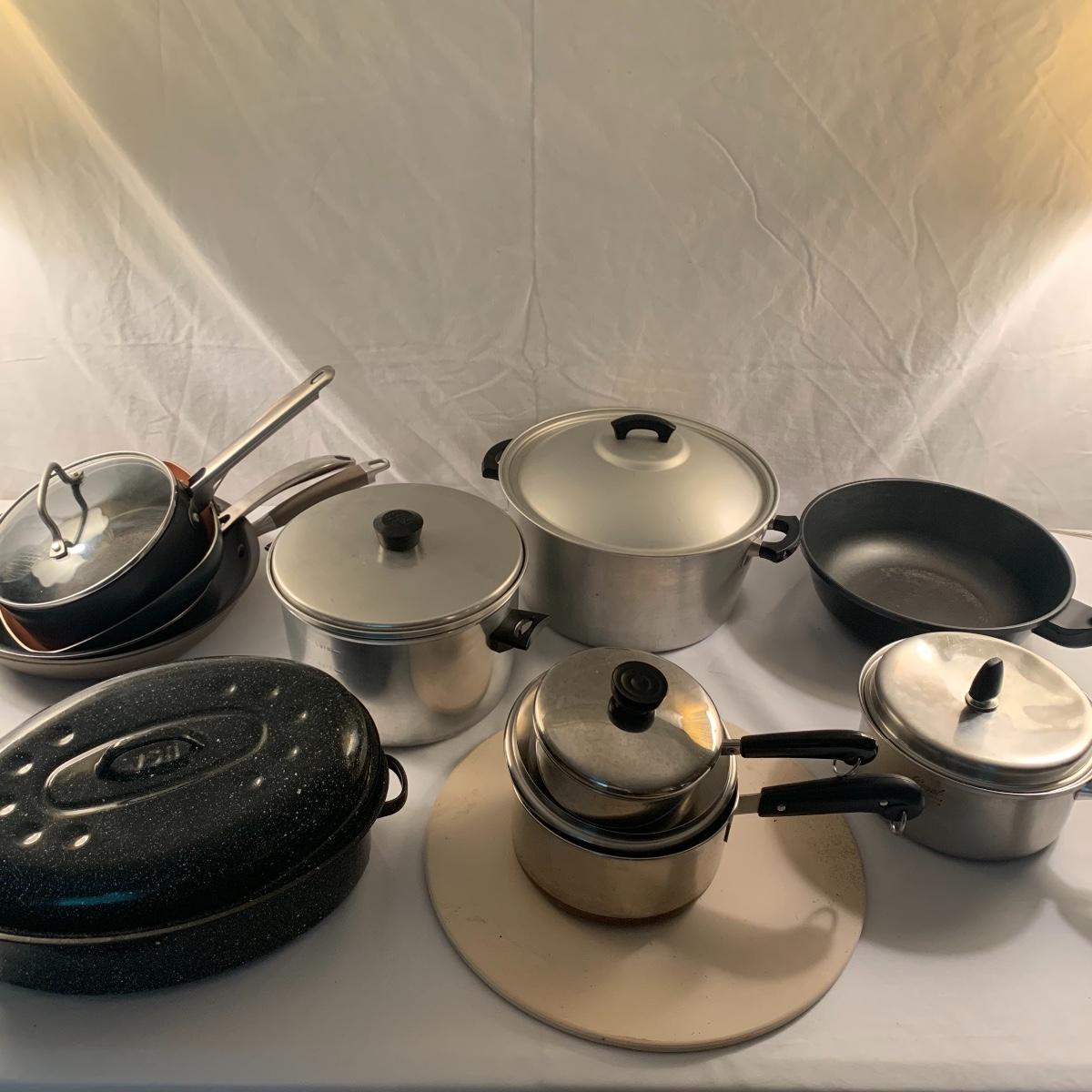 This lot includes a large variety of pots and pans. This includes saucer pans, large, medium, and small pots, crockpot shaped pots, a stir fry pan, and lids. This lot also includes a stone pizza round. Some of the pots / pans have signs of wear (see photos). The largest pan measures about 13 in x 13in without the handle and the largest pot measures about 12in x 12in x 6in. Local pick up only.