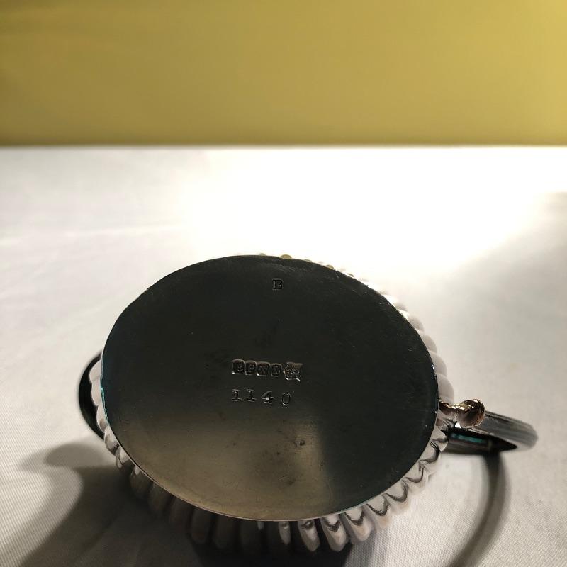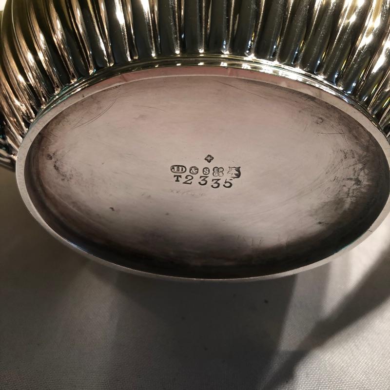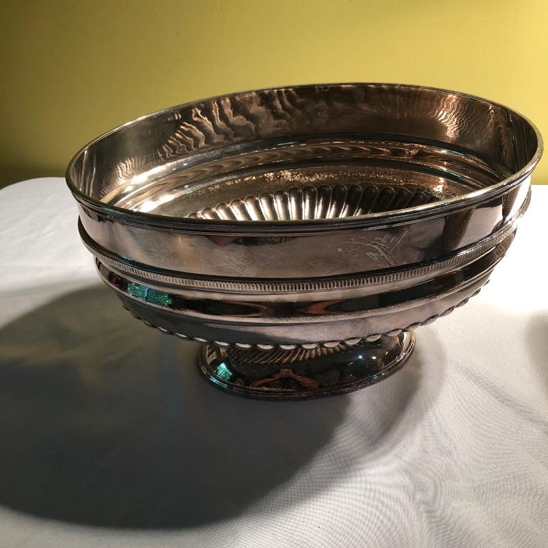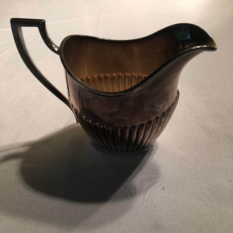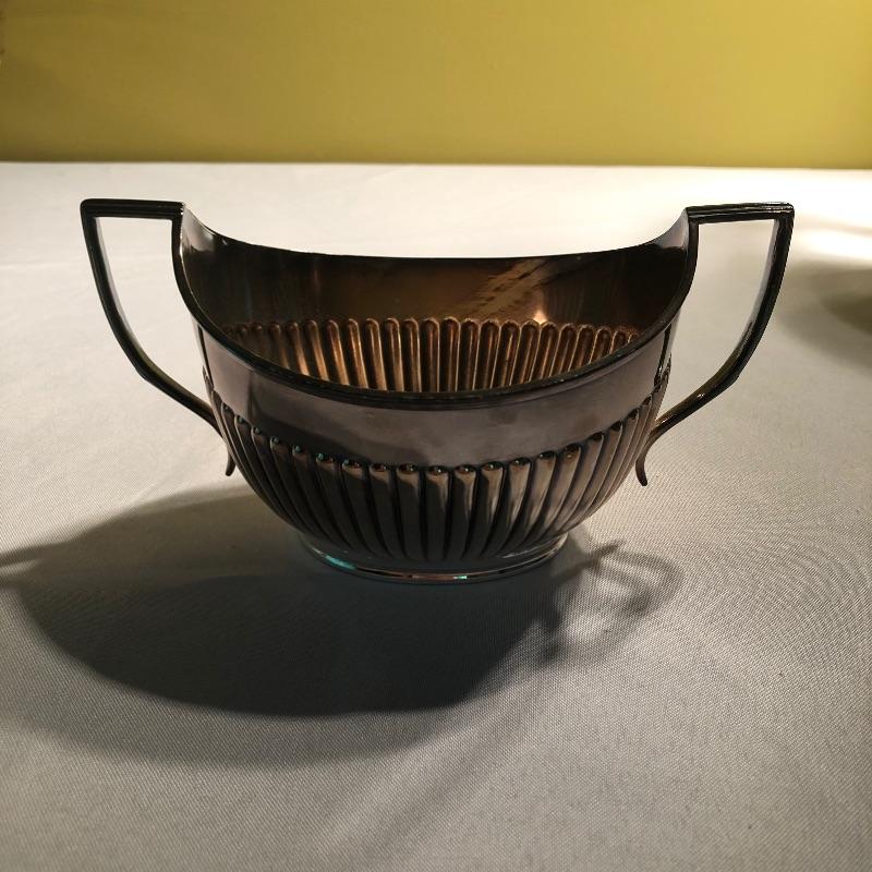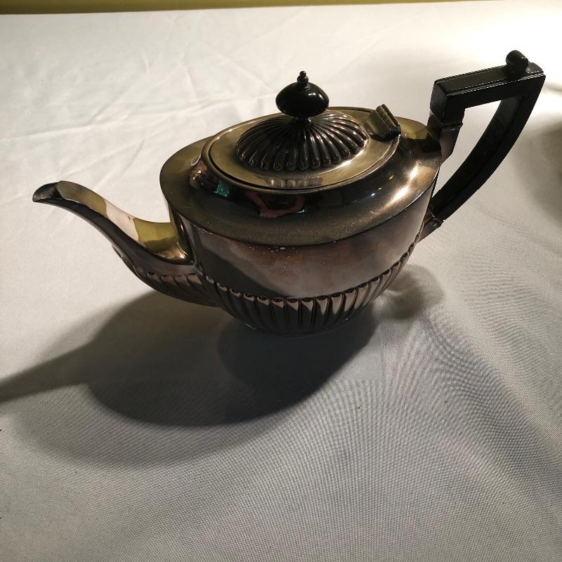 Appears to be a set of stainless steel tea and coffee serving pieces. This lot includes a creamer pitcher; a sugar bowl, a teapot; a coffee serving pot; and a large serving bowl on a pedestal. All items are in very good condition with very minimal staining and rusting, and no cracks or breaks. Shipping available.