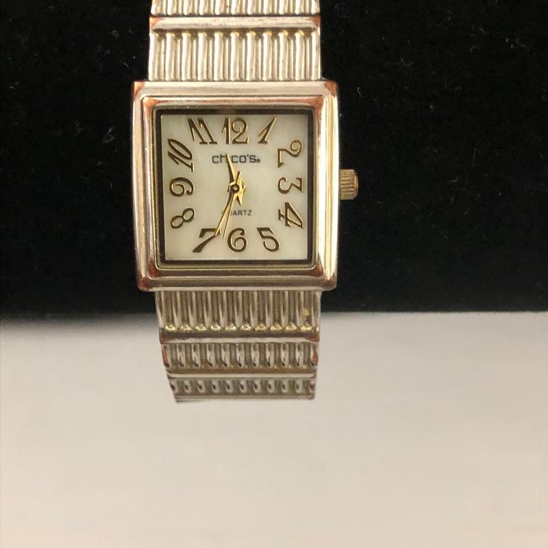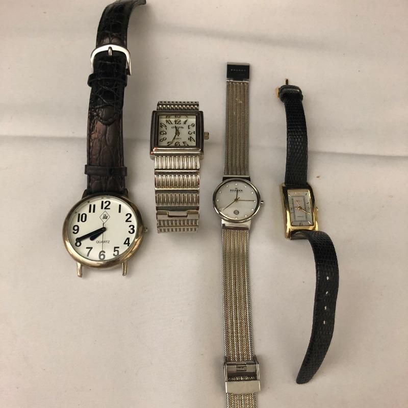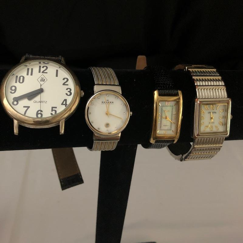 Nice assortment of ladies time pieces here with the following - A Skagen watch that has a white face with diamanté like stones for each hour and an attractive metal band. The Chico’s watch has a metal cuff style band, the Timex has a leather or leather like band and lastly there is a large faced Quartz watch that just needs a pin to attach the one side of the strap. Watches are not currently working and likely need new batteries.