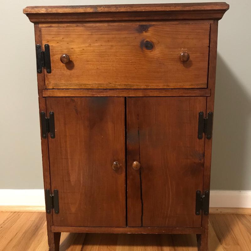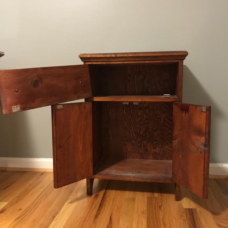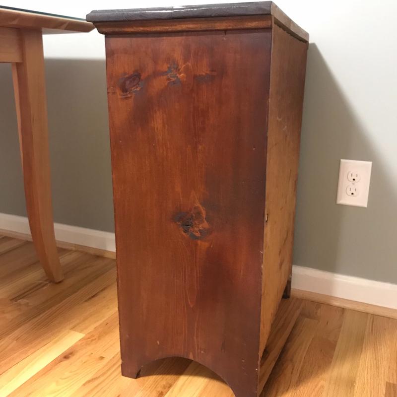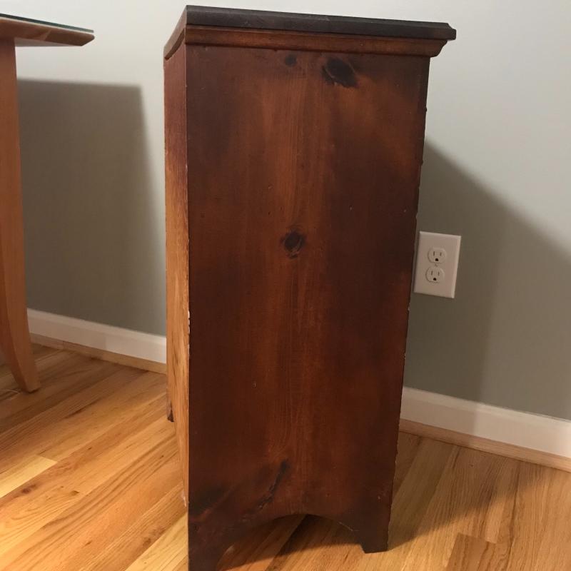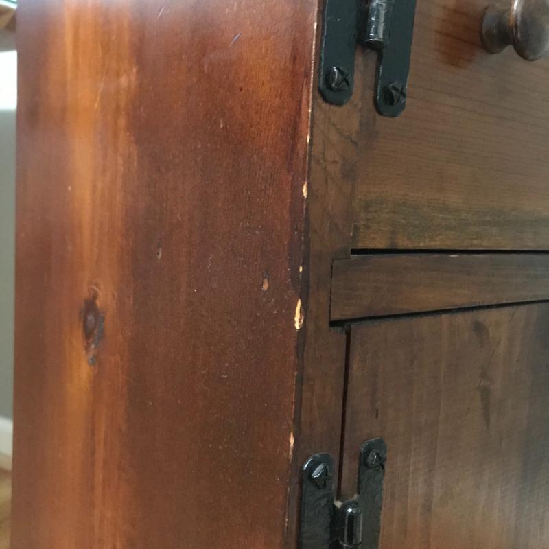 This handsome small wooden cabinet measures 20.5”x12.5”x29”h with dark staining and hardware. It’s in great shape with very little wear as noted in some photos. The top “drawer” has a door that opens slightly lopsided due to a loose or bent hinge and there is an apparent stain drip on the front. Local pick up in Arden, NC.