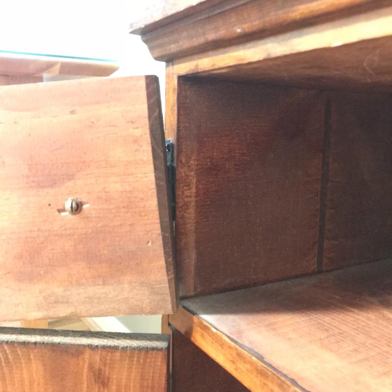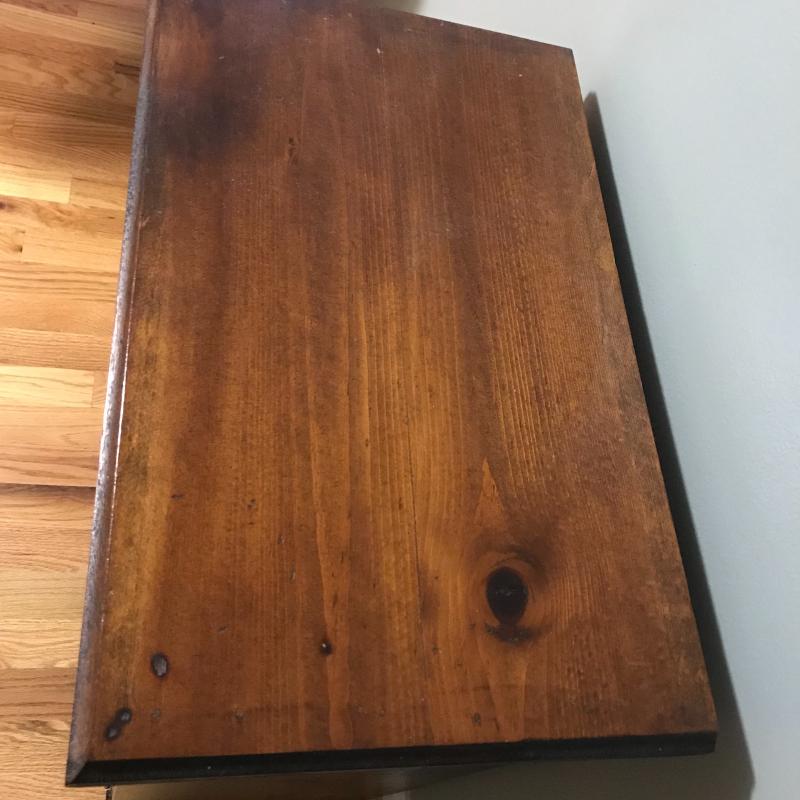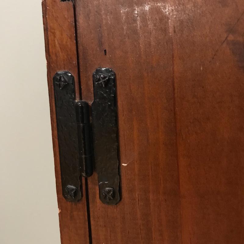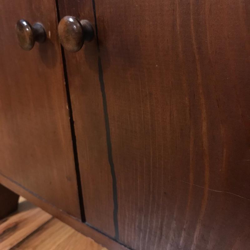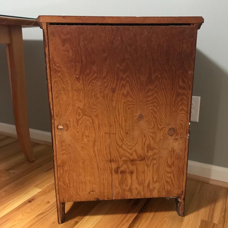 This handsome small wooden cabinet measures 20.5”x12.5”x29”h with dark staining and hardware. It’s in great shape with very little wear as noted in some photos. The top “drawer” has a door that opens slightly lopsided due to a loose or bent hinge and there is an apparent stain drip on the front. Local pick up in Arden, NC.