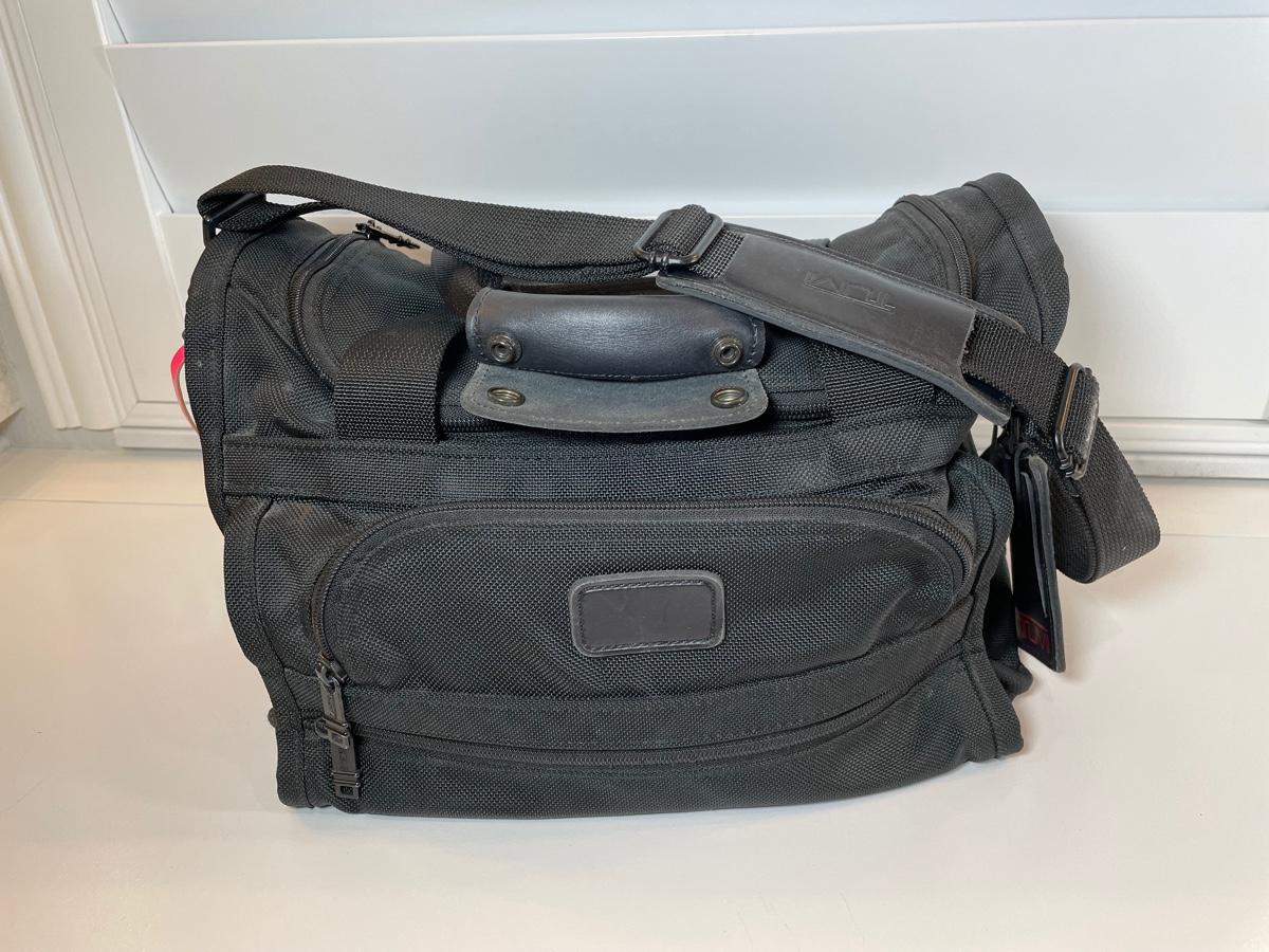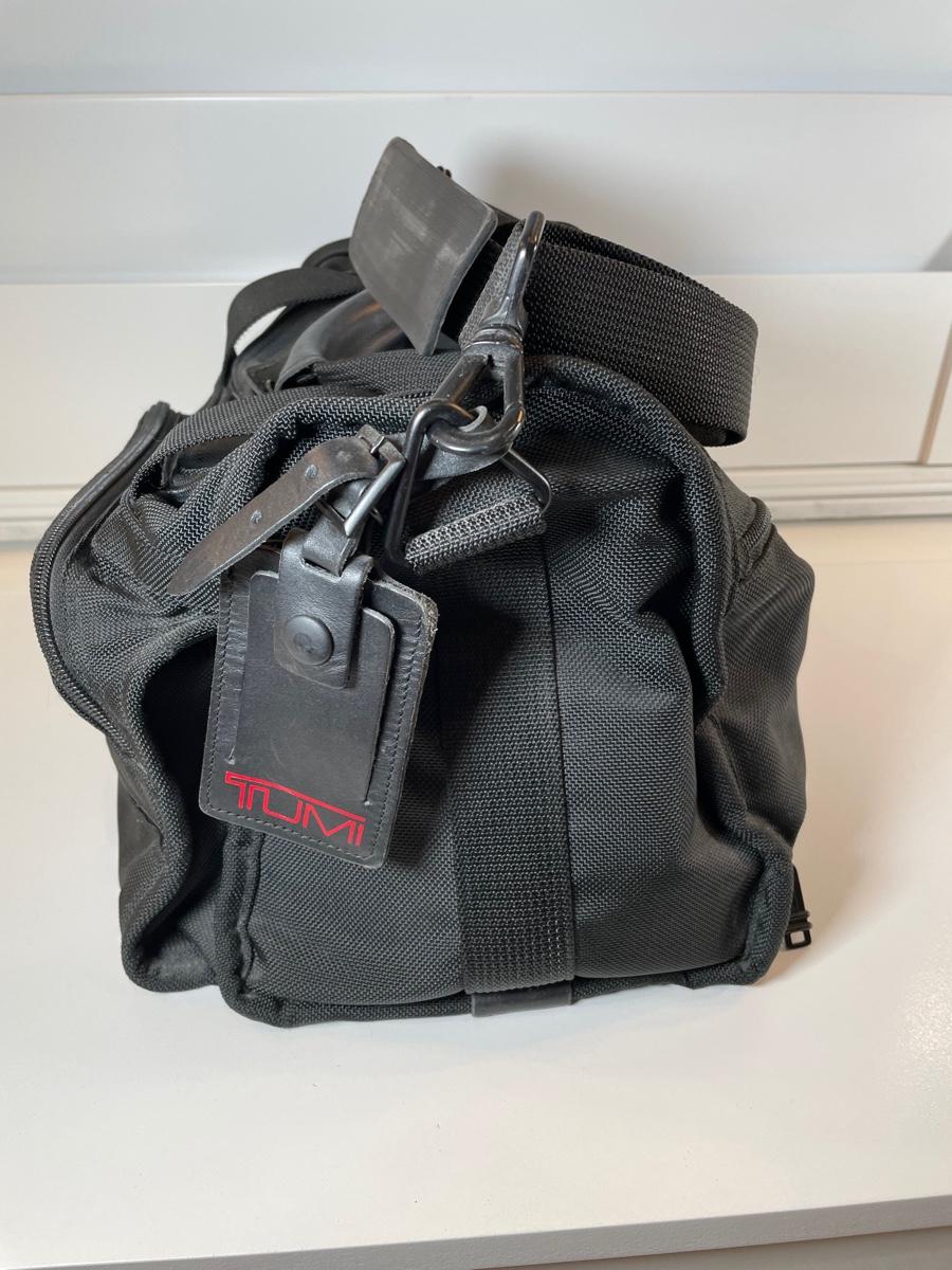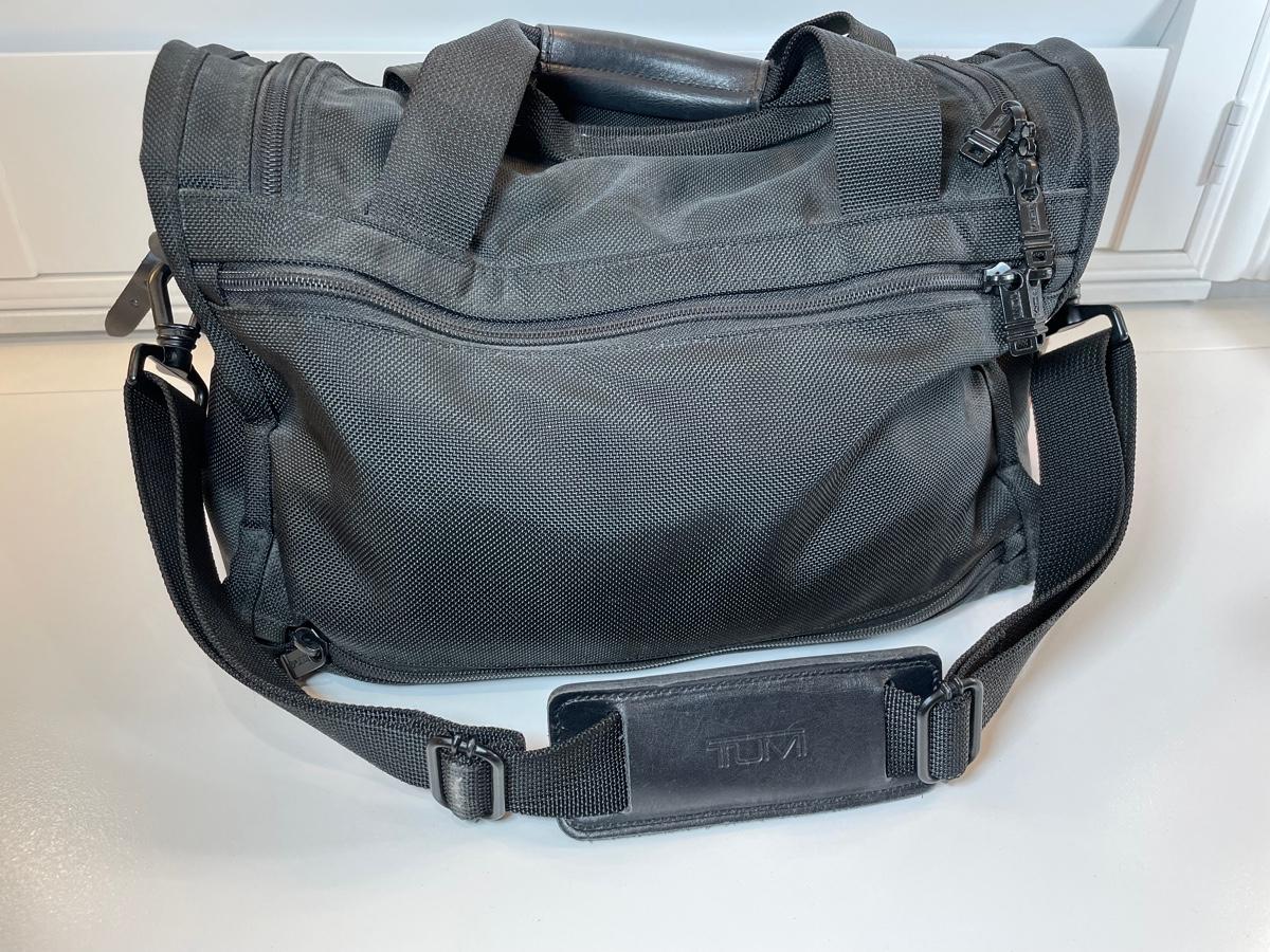 A little dusty, but otherwise in great condition. Lots of zippers and pockets for organizing. Measures 15" wide X 9.5" tall X 10" deep. Fits under an airplane seat