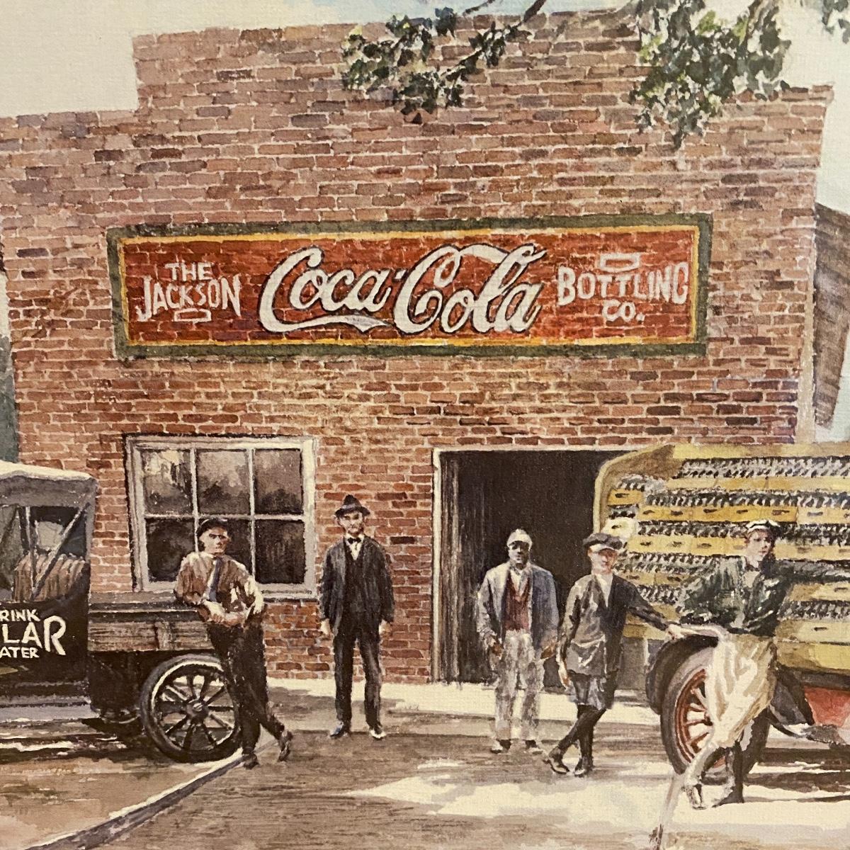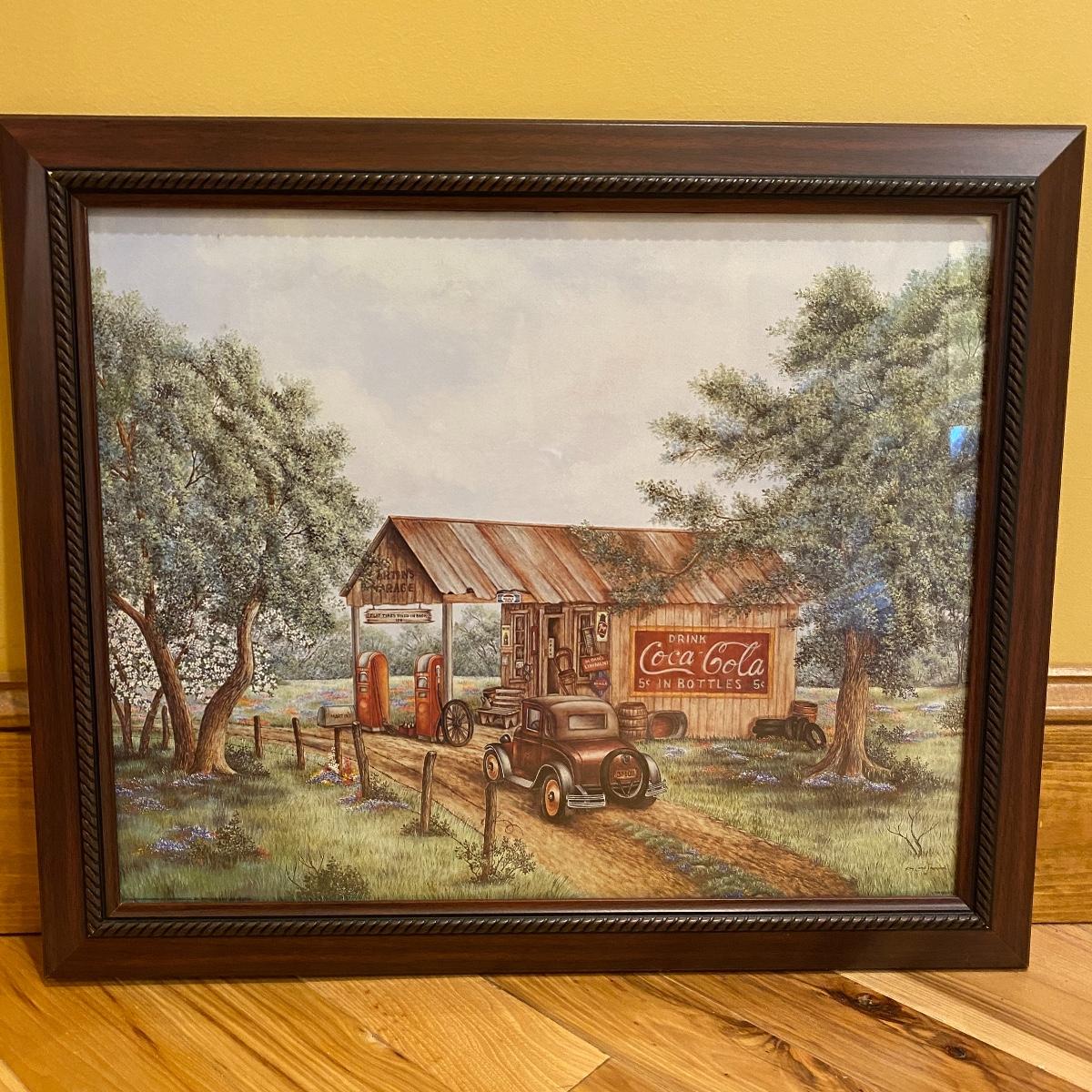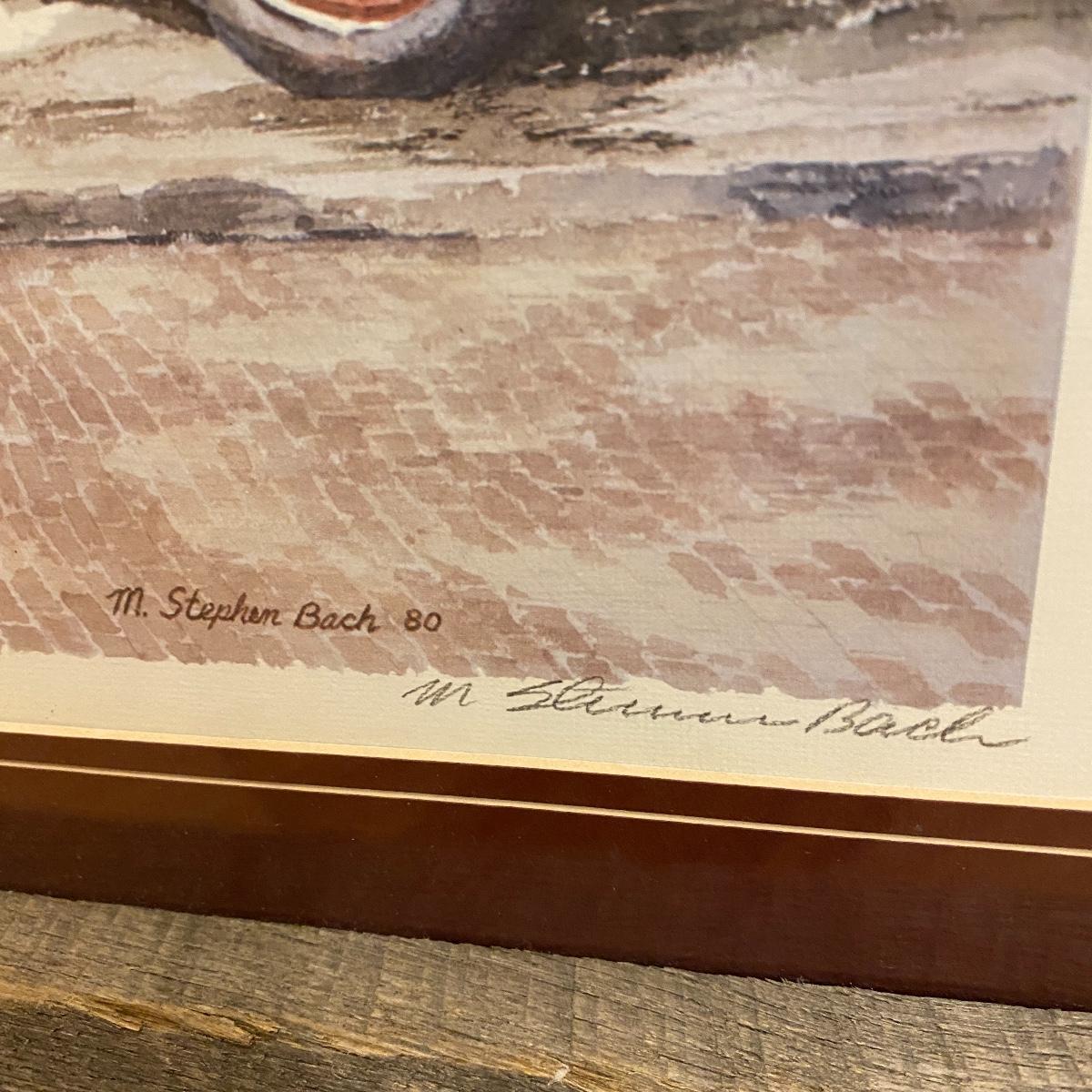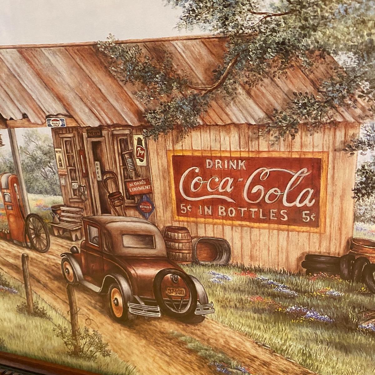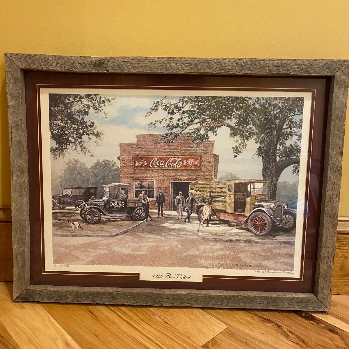 Gotta love these vintage prints of Coca-Cola in its heyday. The rustic wood framed print is signed by M. Stephen Bach and numbered 377/1500. It is nicely matted behind glass and measures 25” x 19”.