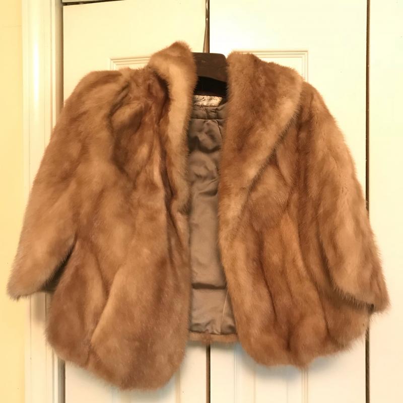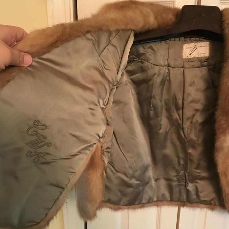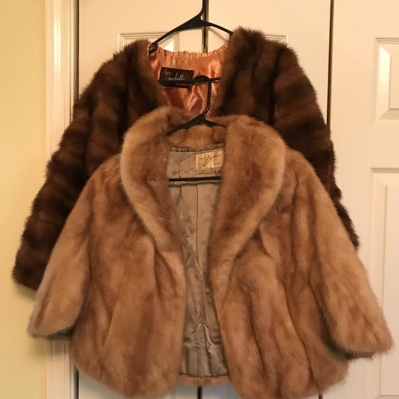 Two fur coats. One from Furs by Michelle in Chicago and one from Furs by Burdine’s in Miami. Both have names engraved on inside. Light colored fur is a small frame. Dark colored fur is likely an extra large and has slit for arm holes. Both look like Minks but can’t verify. Shipping or local pick up.