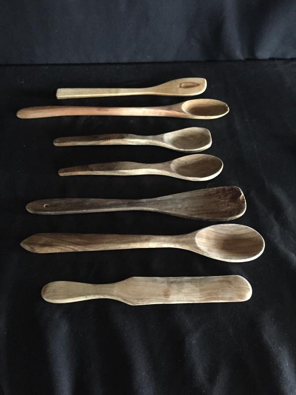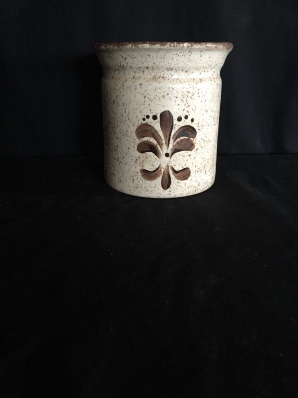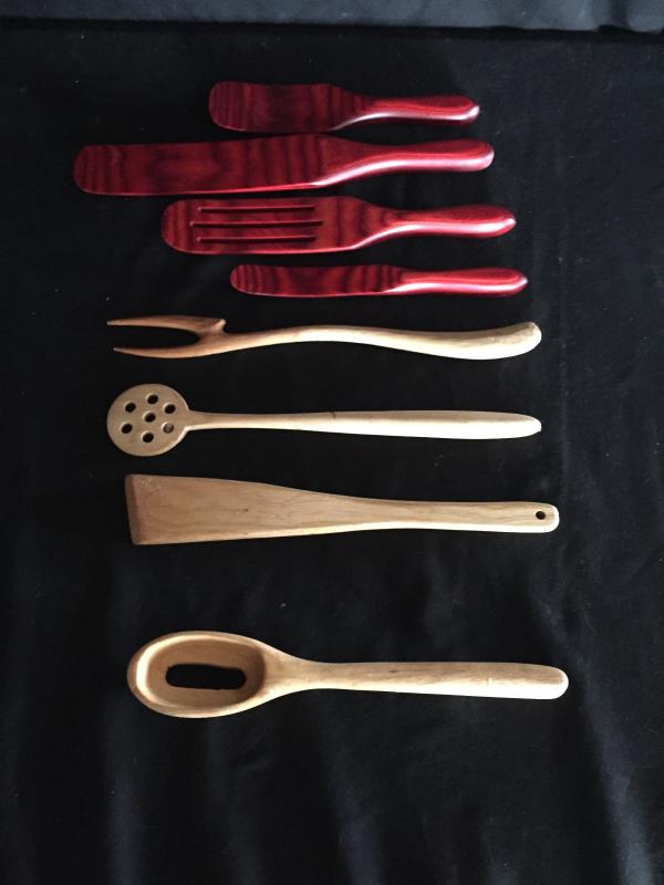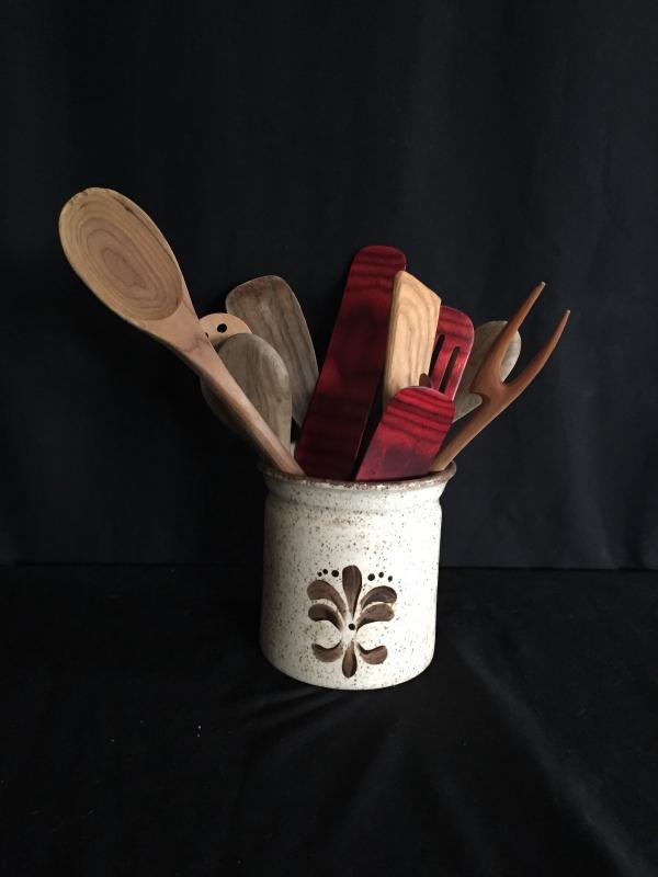 Nice Selection of p Wooden Kitchen Utensils with Charming pottery Holder. Longest spoon 15”.
