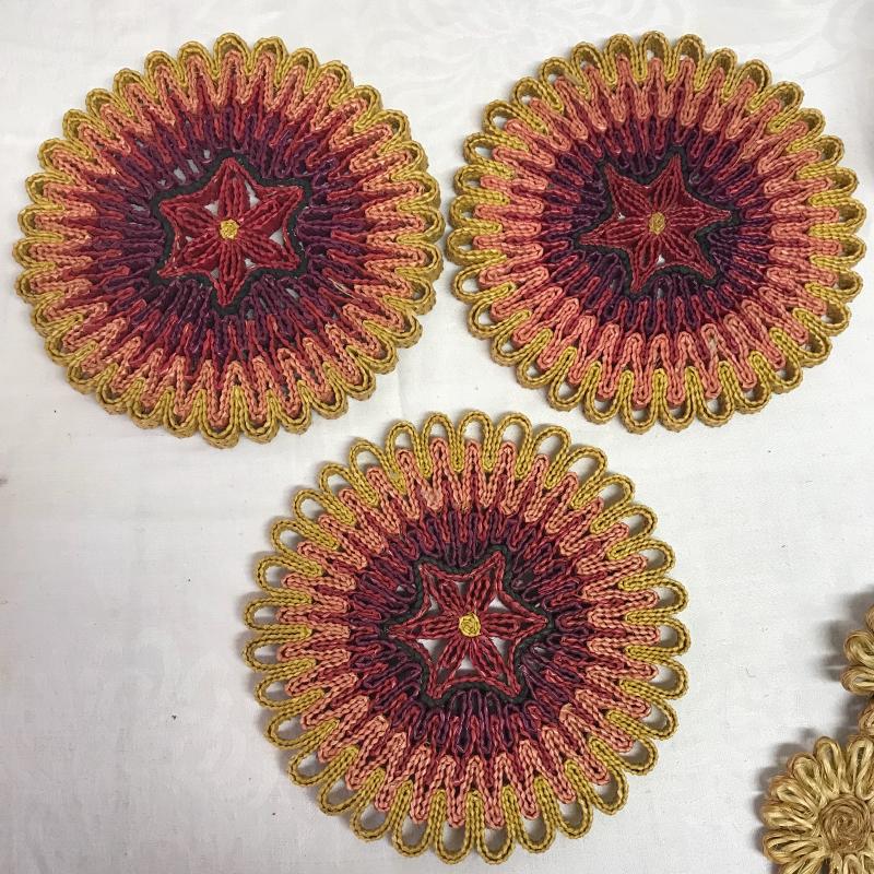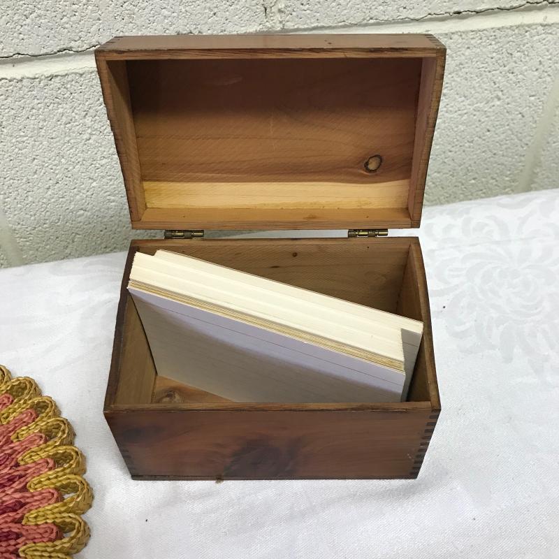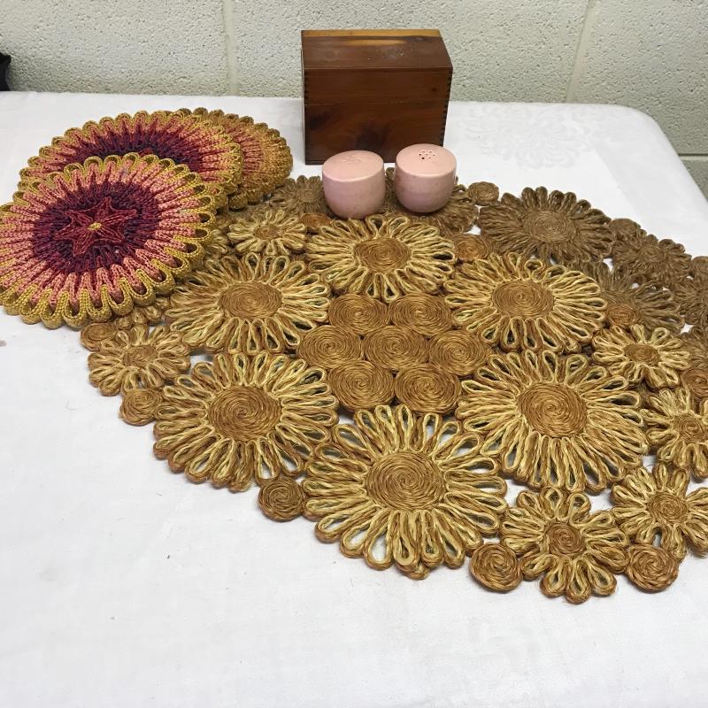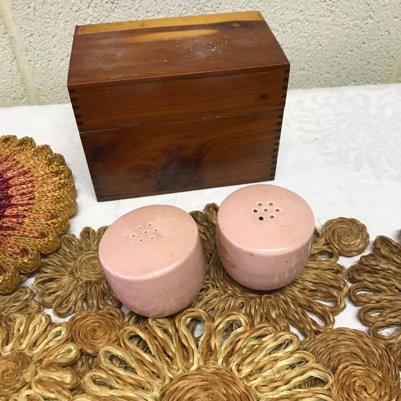 Three woven colorful trivets and two woven placemats made in the Philippines. Pair of pink S&P shakers that look like fiestaware but can not confirm. Need corks. Small wooden recipe box also in the lot. Lot is available for shipping or local pick up in Asheville, NC.